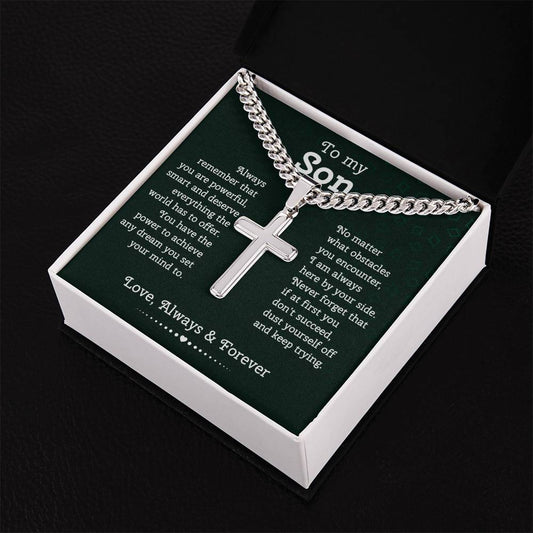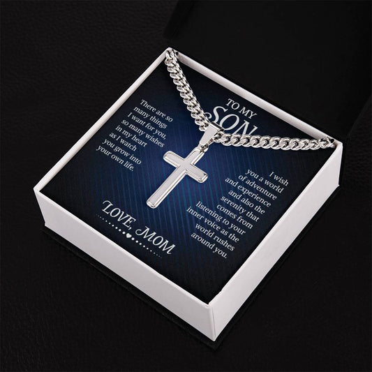 To My Son From Mom, Son Gifts from Mom, Mother and Son Necklace, Birthday Gift For My Son Graduation Christmas Cuban Chain with Artisan Cross Necklace