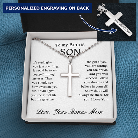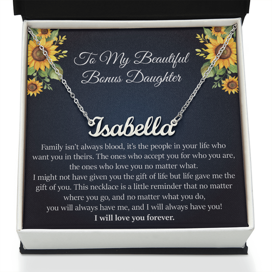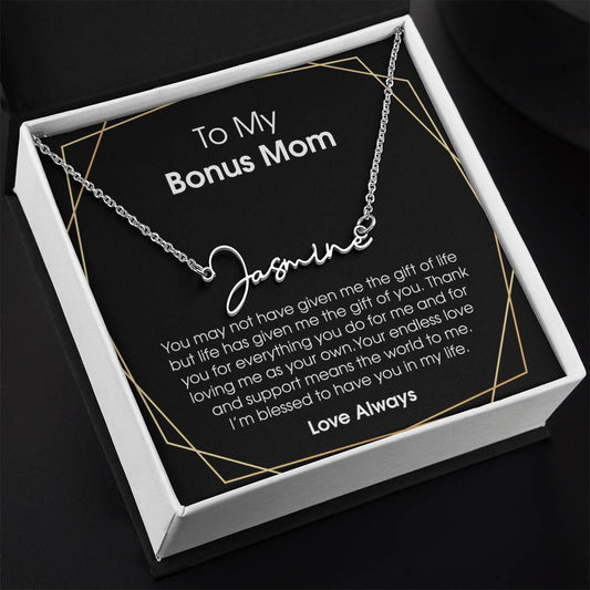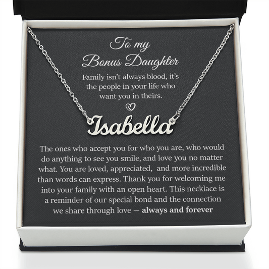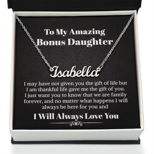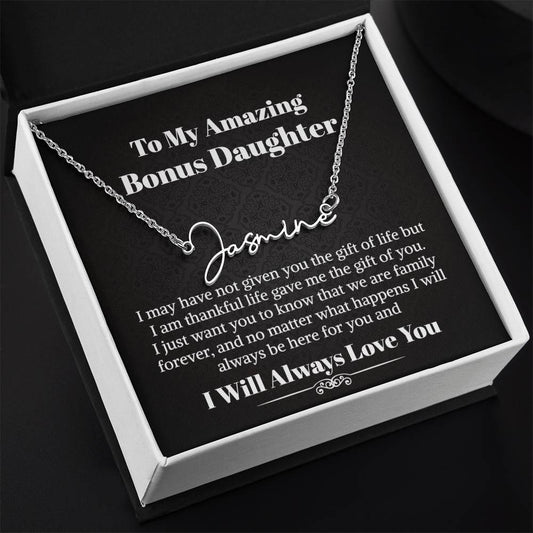 Bonus Daughter Signature Style Name Necklace Birthday Graduation Christmas Gift with Message Card and LED Jewelry Box Gift Pendant for Step Daughter Goddaughter