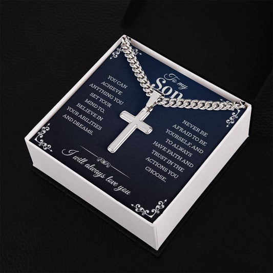 Gift For Son | Cuban Chain with Artisan Cross Necklace Perfect From Mom Dad | Personalized Gift For Son | Birthday Christmas Graduation Gift For Son