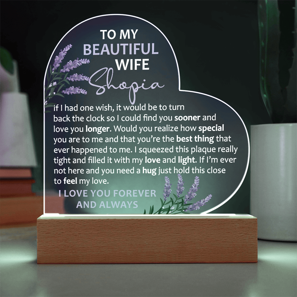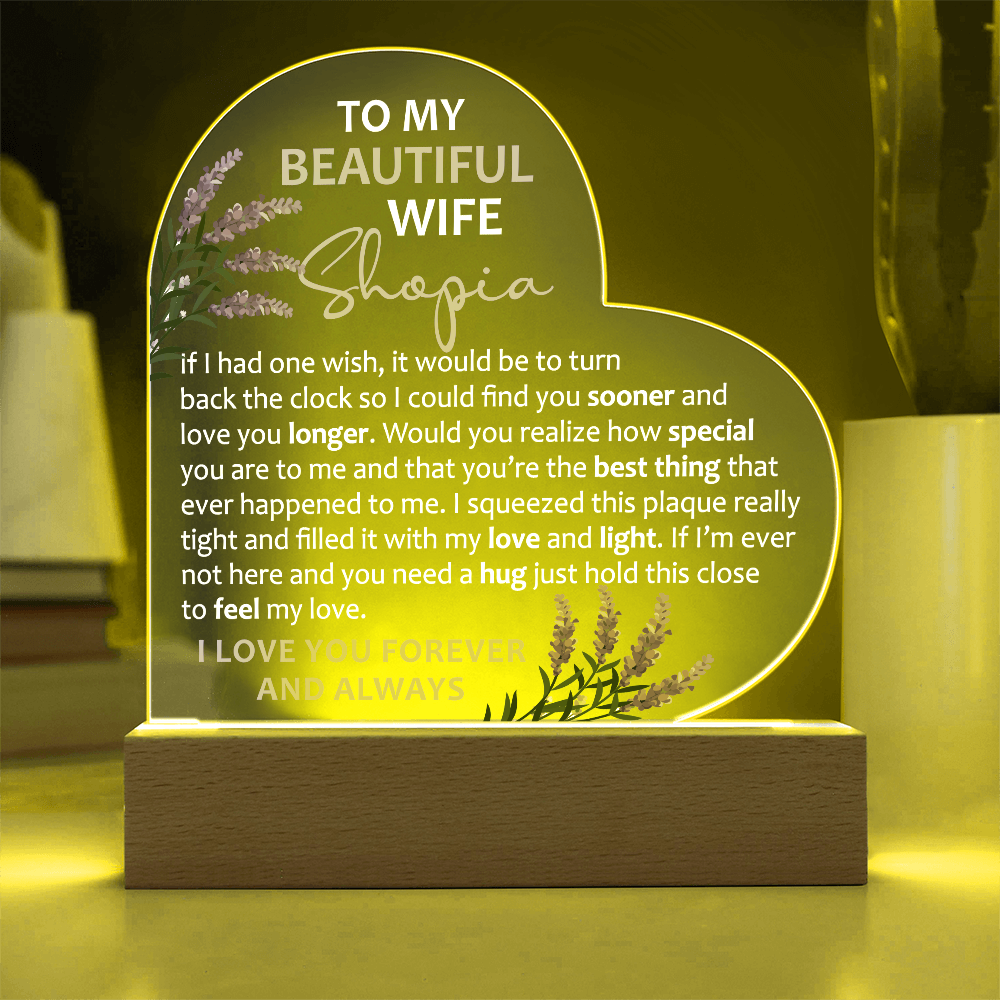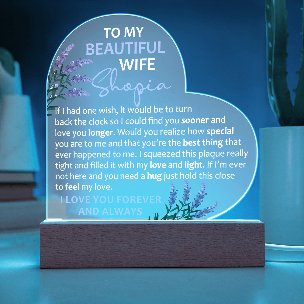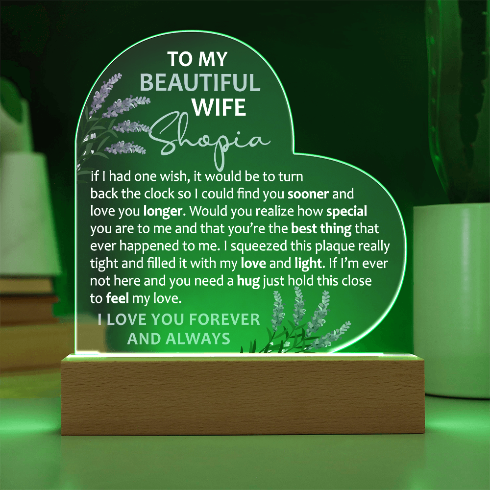 Your plaque will be crafted from premium acrylic with a professionally printed design for a polished look. It comes with a stylish wooden LED base, and you can choose between a USB plug-in option OR a cordless battery-operated option (requires 2 AAA batteries, not included). Both LED bases feature 7 vibrant colors, allowing the user to customize the lighting with various color changes and dynamic cycles.