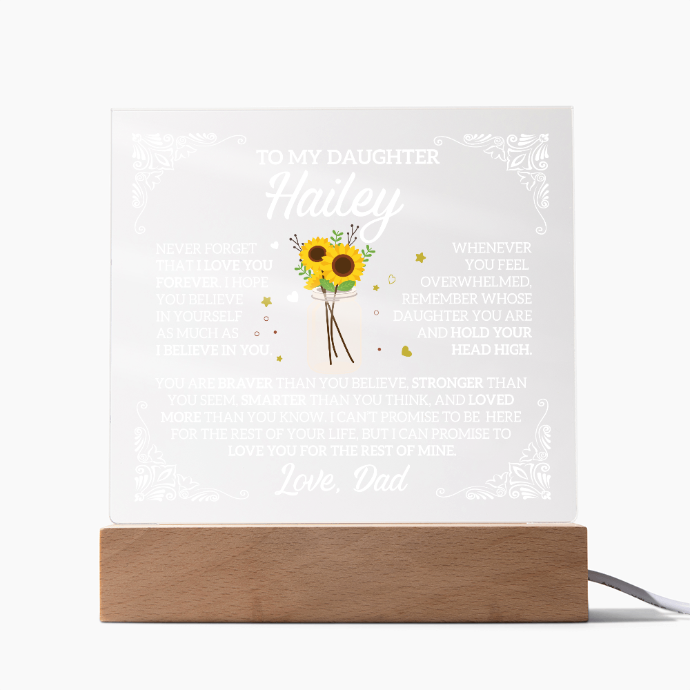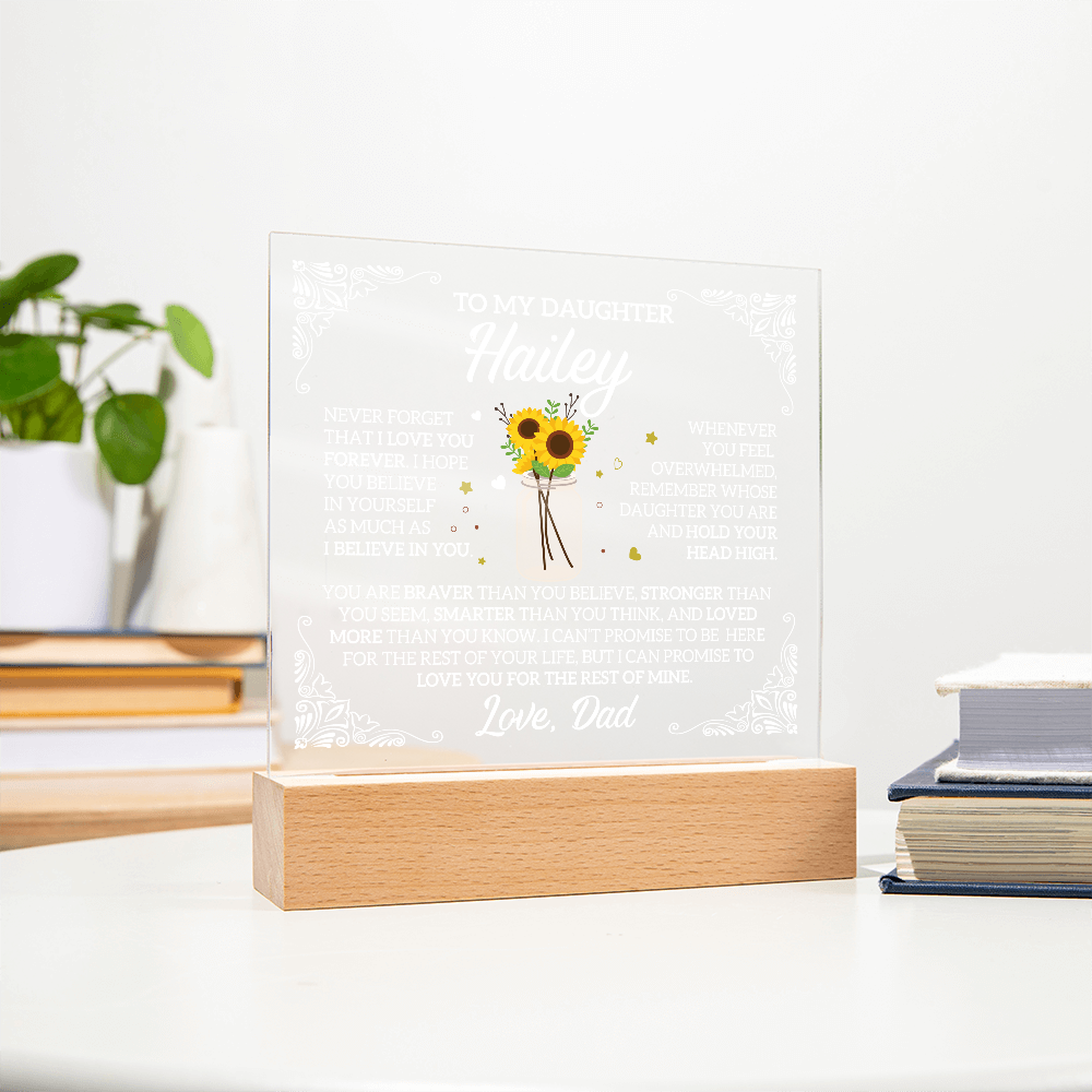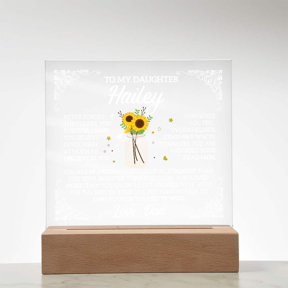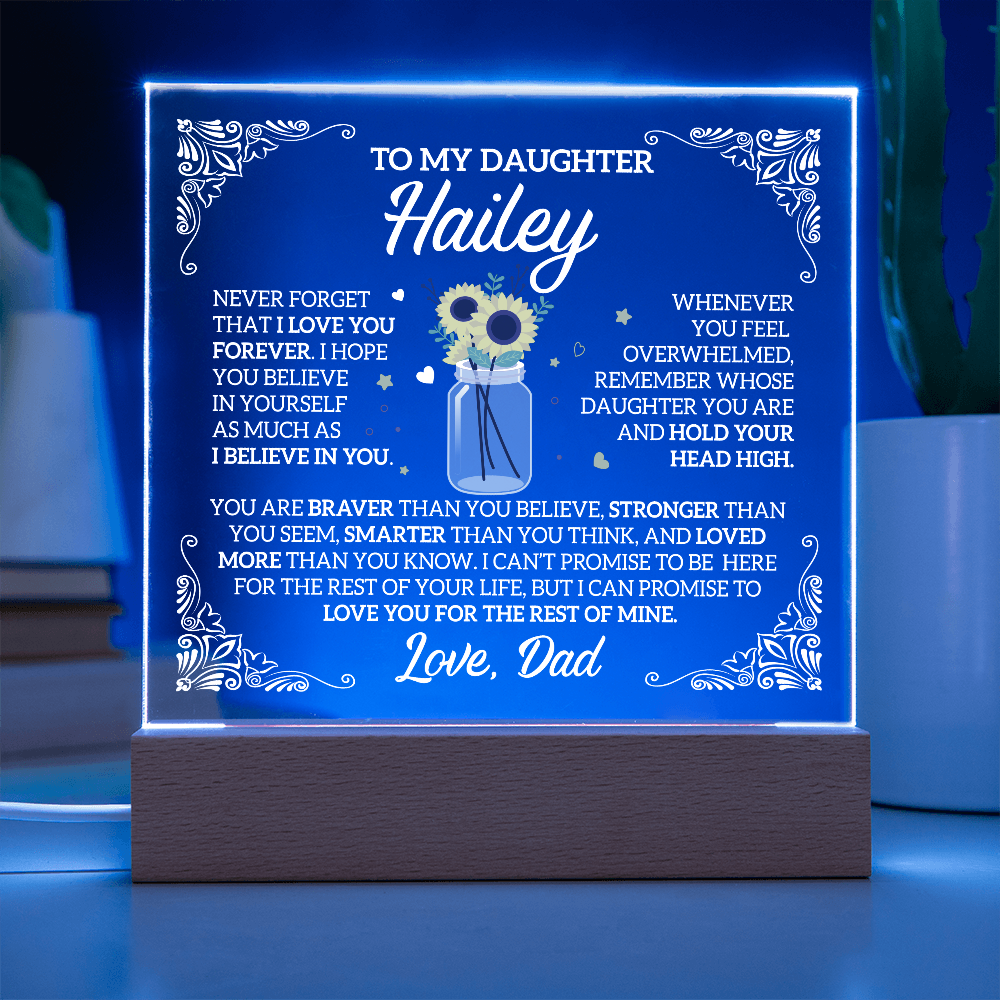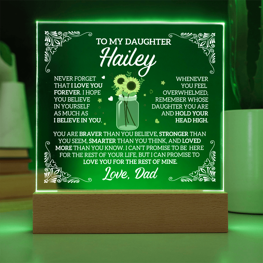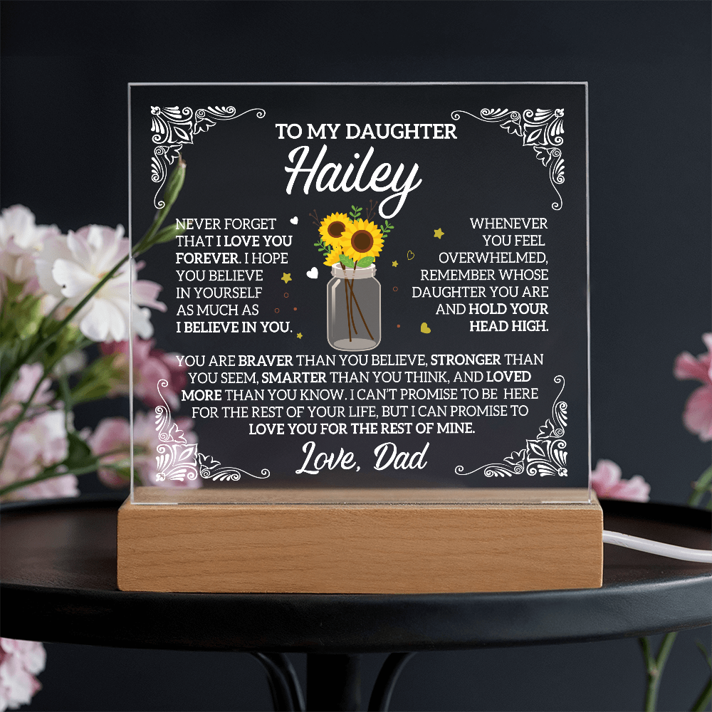 Your plaque will be crafted from premium acrylic with a professionally printed design for a polished look. It comes with a stylish wooden LED base, and you can choose between a USB plug-in option OR a cordless battery-operated option (requires 2 AAA batteries, not included). Both LED bases feature 7 vibrant colors, allowing the user to customize the lighting with various color changes and dynamic cycles.