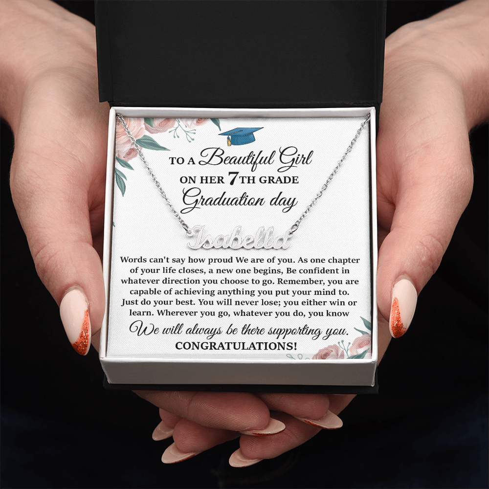 This stylish necklace features a cursive name design suspended on an 16”-18” adjustable cable chain, making it both personal and beautiful! Your necklace will be custom made upon ordering in the name or word of your choice, with up to 10 characters.  It's a gift that they will surely want to keep close to their heart forever!