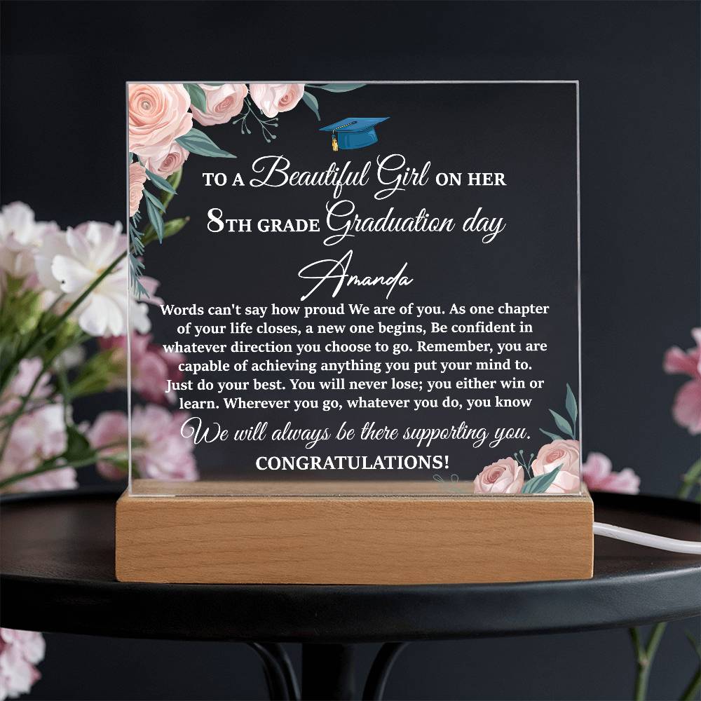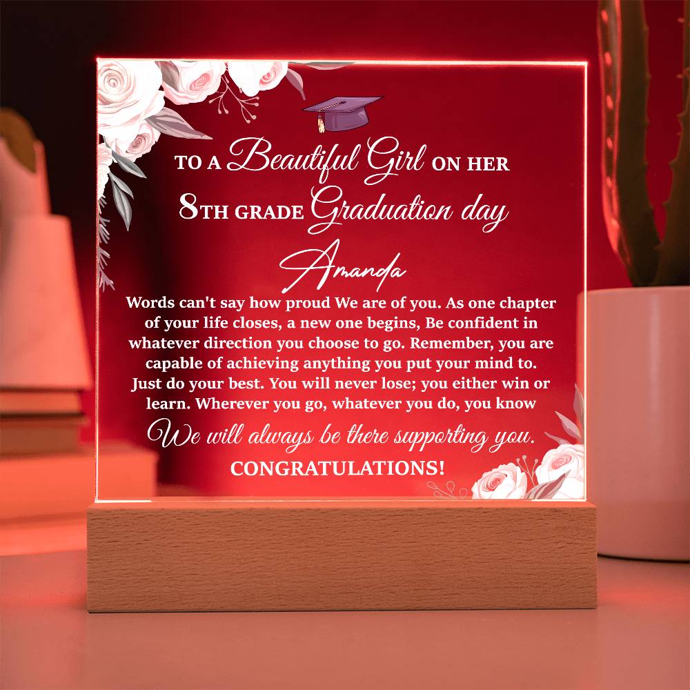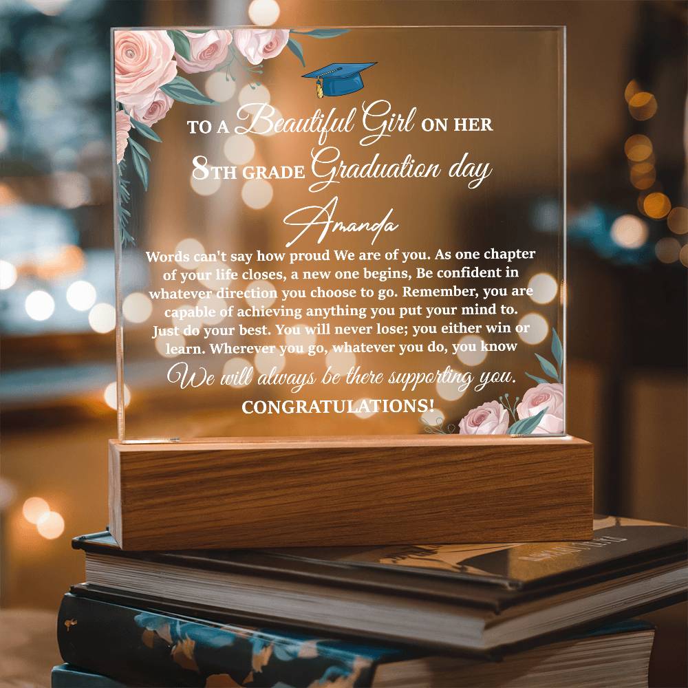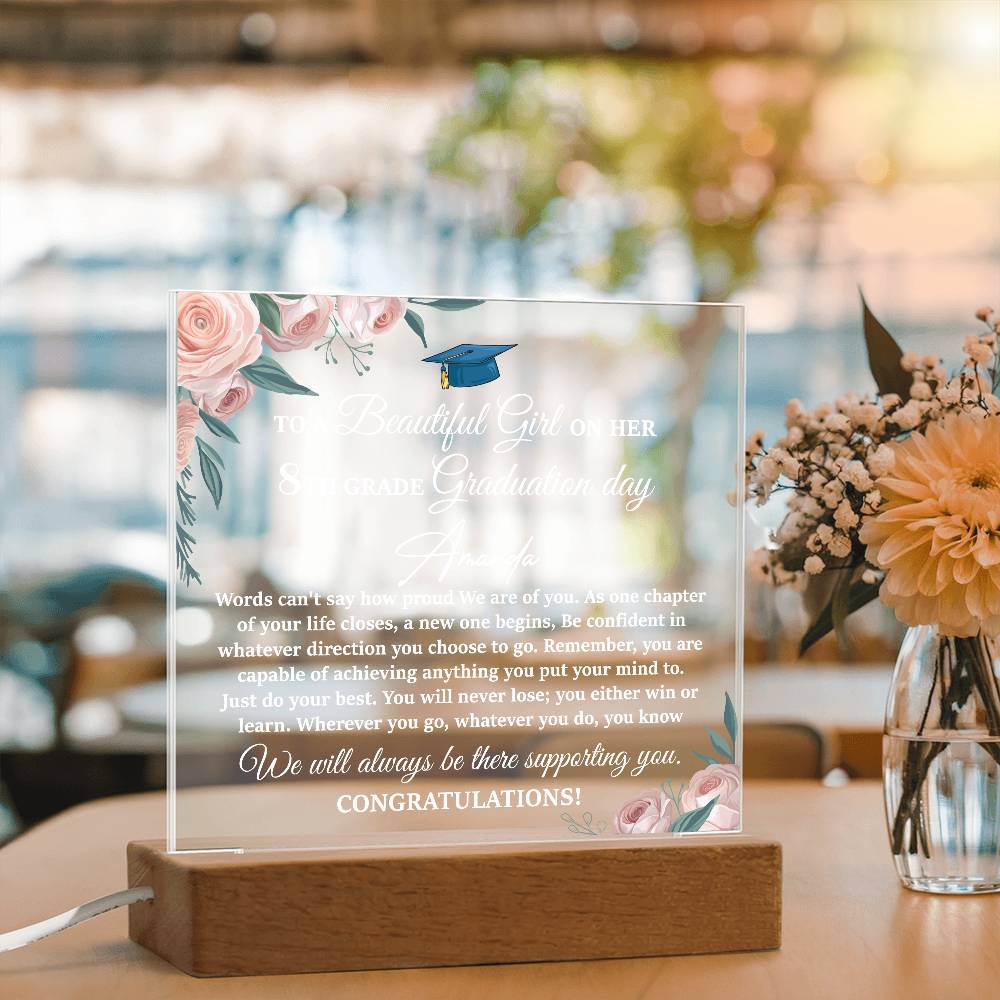 Your plaque will be crafted from premium acrylic with a professionally printed design for a polished look. It comes with a stylish wooden LED base, and you can choose between a USB plug-in option OR a cordless battery-operated option (requires 2 AAA batteries, not included). Both LED bases feature 7 vibrant colors, allowing the user to customize the lighting with various color changes and dynamic cycles.