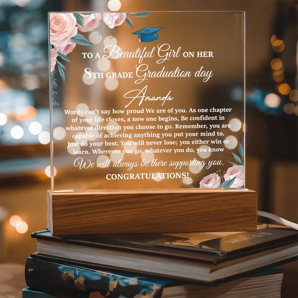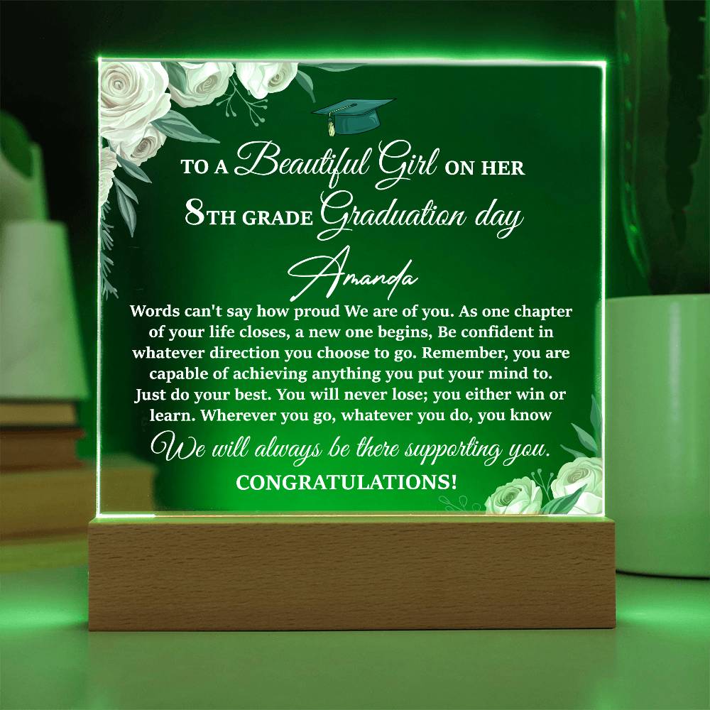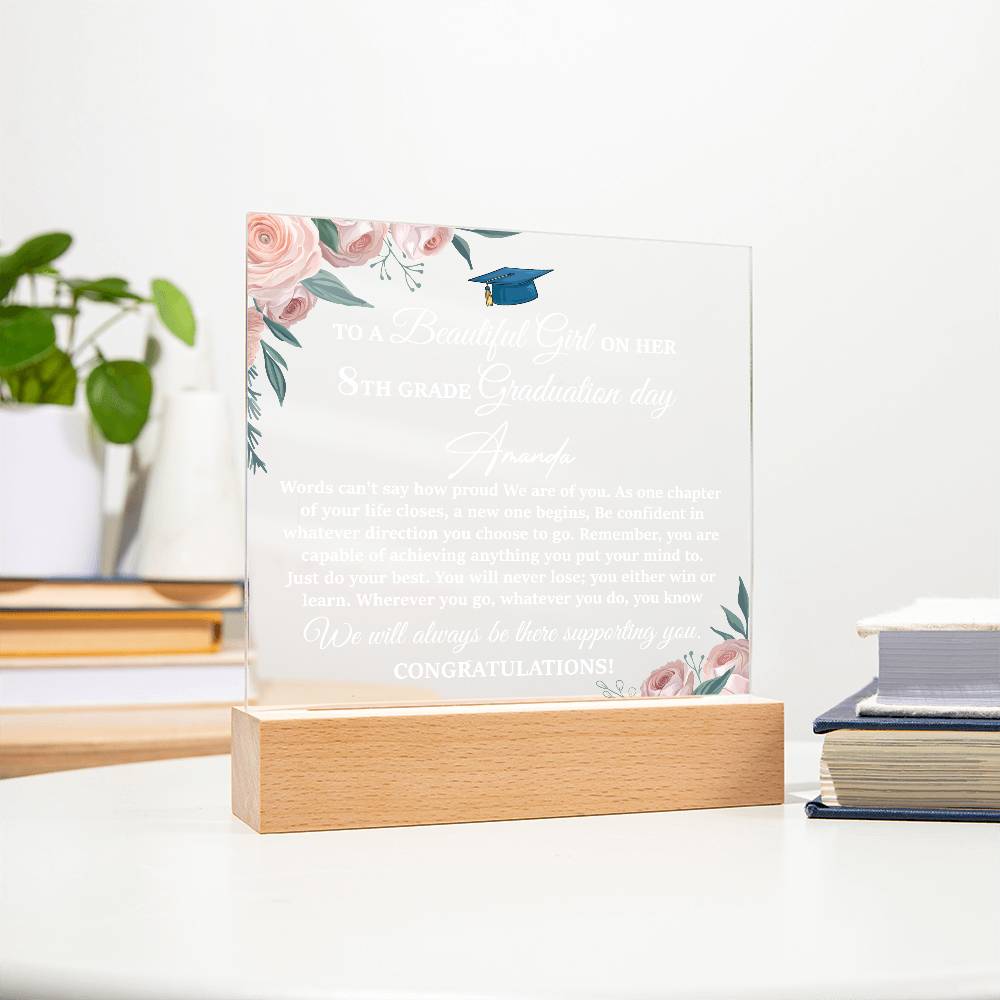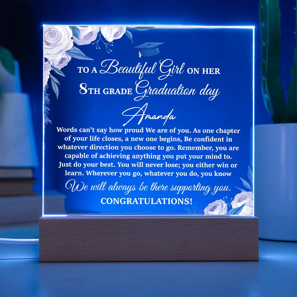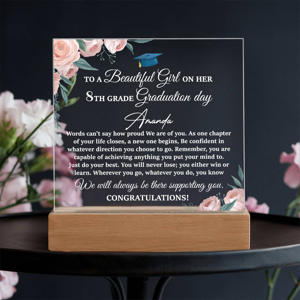 Your plaque will be crafted from premium acrylic with a professionally printed design for a polished look. It comes with a stylish wooden LED base, and you can choose between a USB plug-in option OR a cordless battery-operated option (requires 2 AAA batteries, not included). Both LED bases feature 7 vibrant colors, allowing the user to customize the lighting with various color changes and dynamic cycles.
