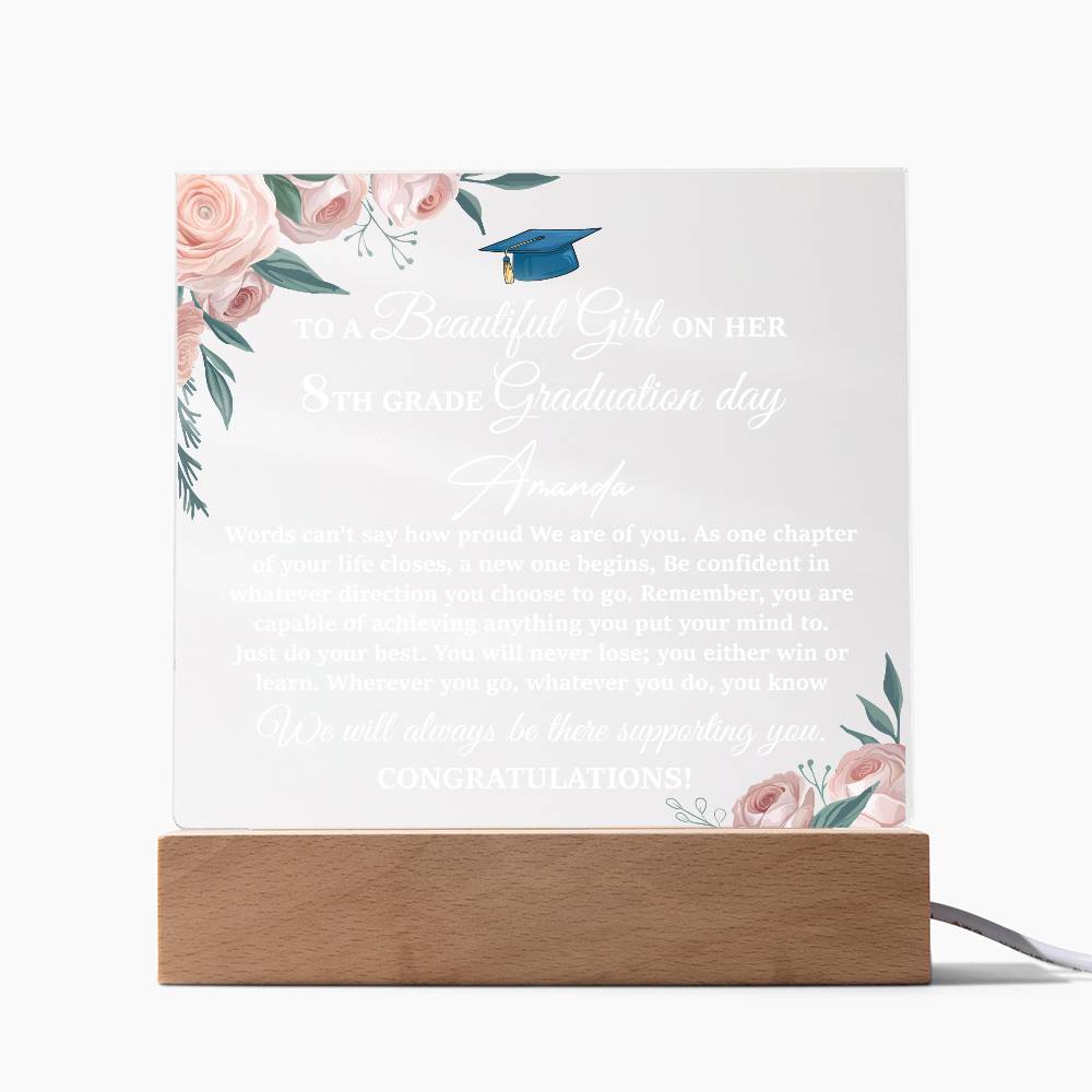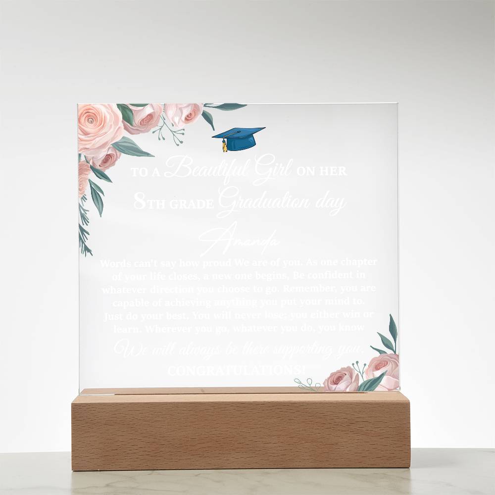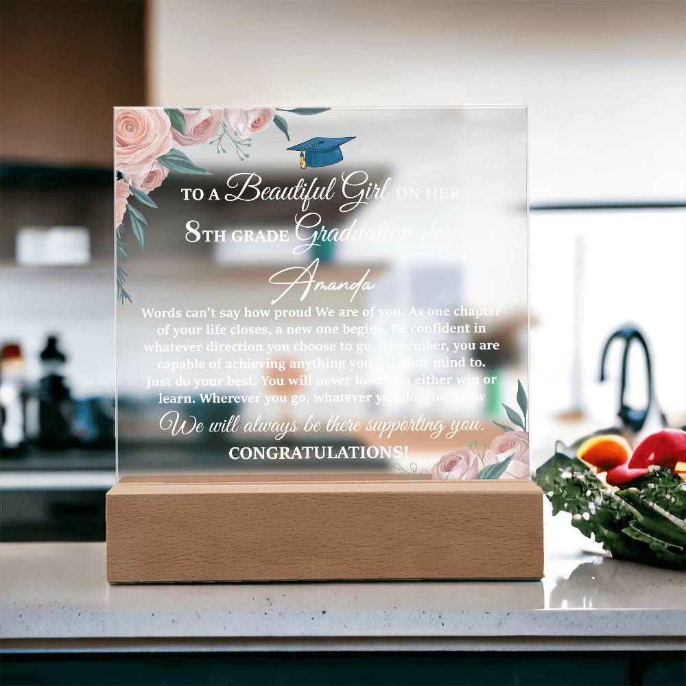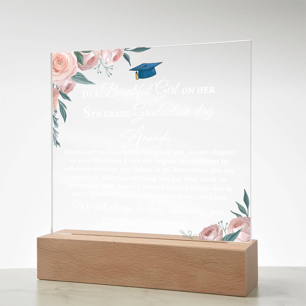 Your plaque will be crafted from premium acrylic with a professionally printed design for a polished look. It comes with a stylish wooden LED base, and you can choose between a USB plug-in option OR a cordless battery-operated option (requires 2 AAA batteries, not included). Both LED bases feature 7 vibrant colors, allowing the user to customize the lighting with various color changes and dynamic cycles.