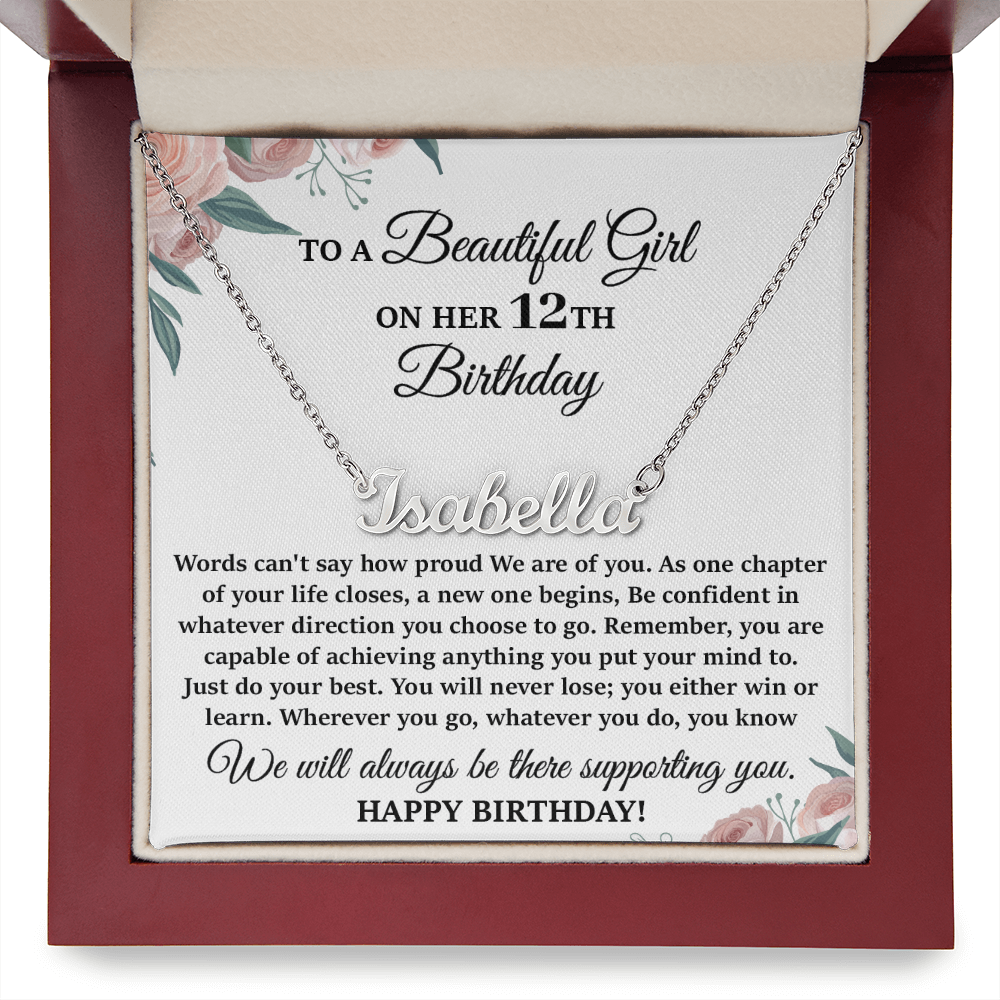 This stylish necklace features a cursive name design suspended on an 16”-18” adjustable cable chain, making it both personal and beautiful! Your necklace will be custom made upon ordering in the name or word of your choice, with up to 10 characters. It's a gift that they will surely want to keep close to their heart forever!