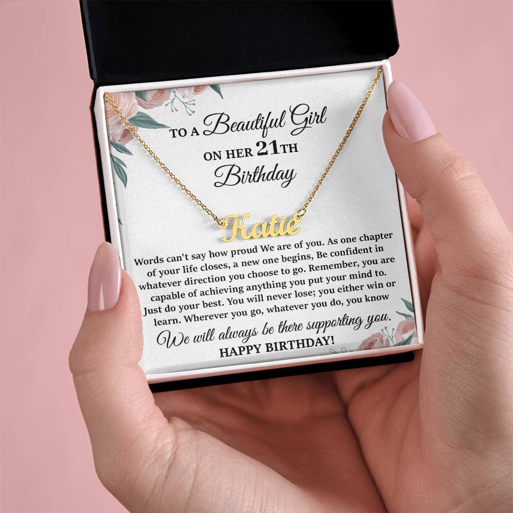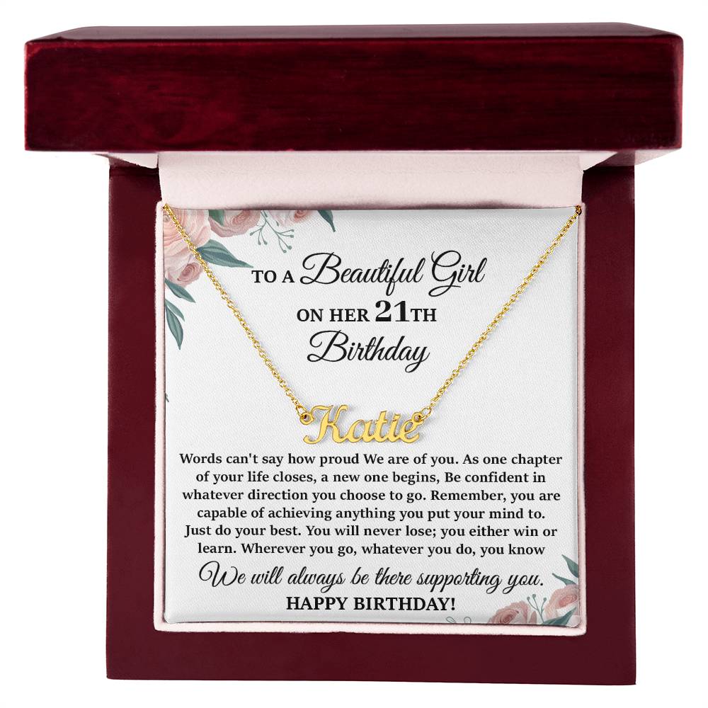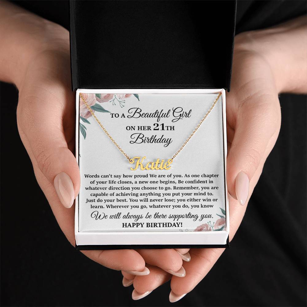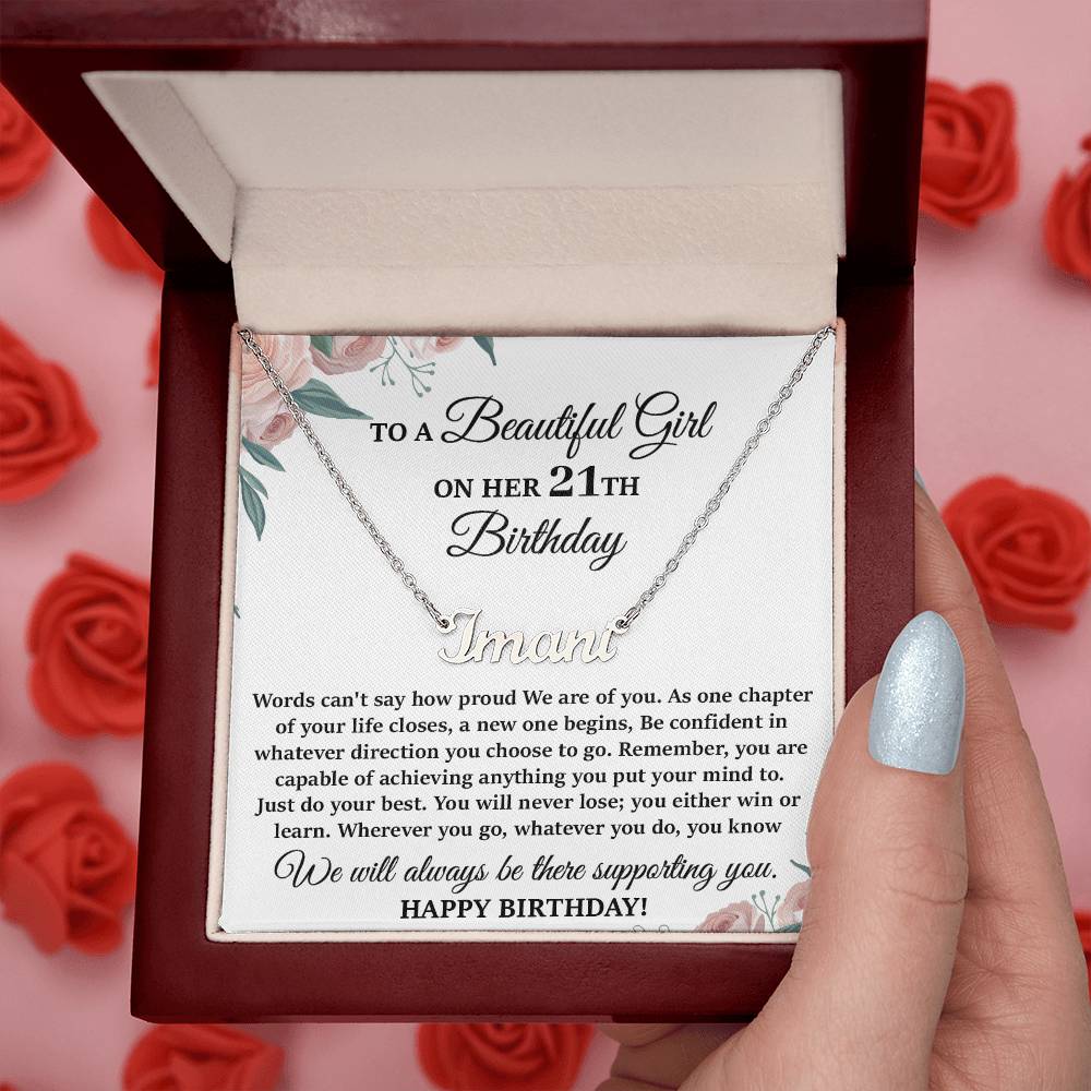 This stylish necklace features a cursive name design suspended on an 16”-18” adjustable cable chain, making it both personal and beautiful! Your necklace will be custom made upon ordering in the name or word of your choice, with up to 10 characters.  It's a gift that they will surely want to keep close to their heart forever!