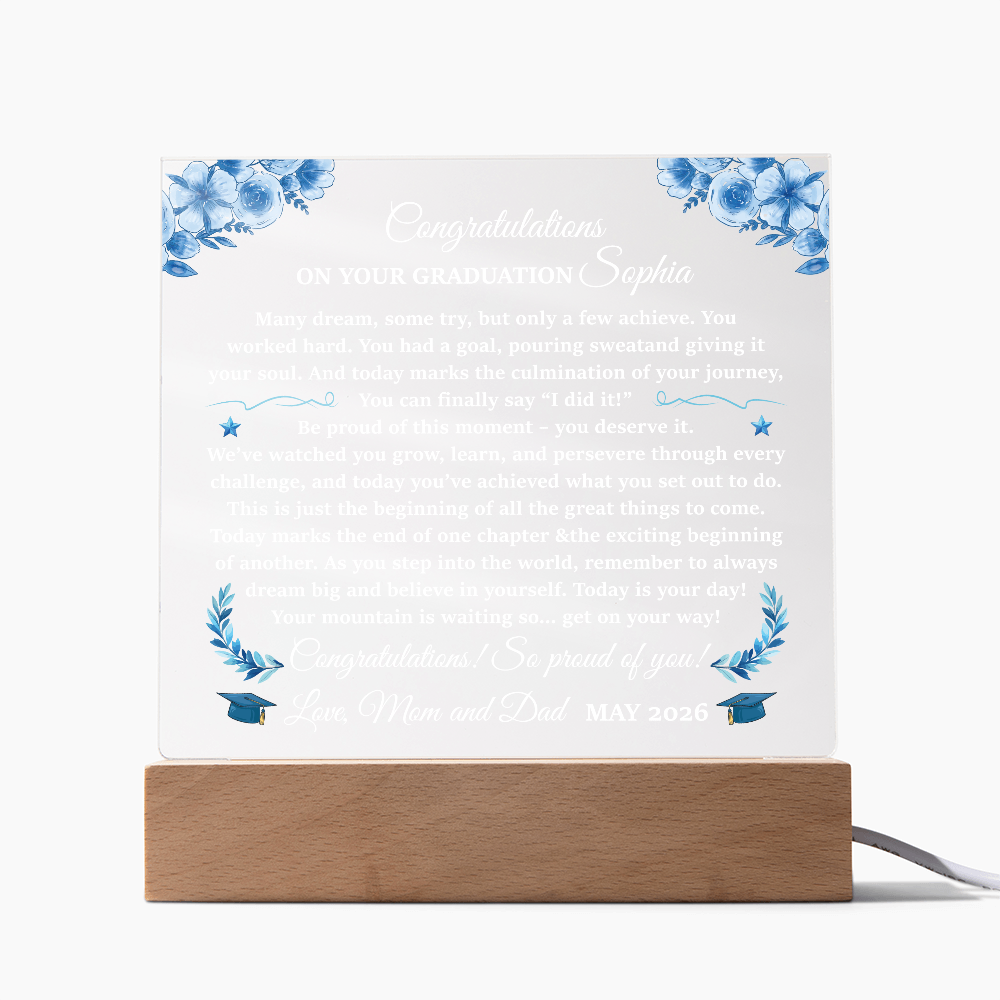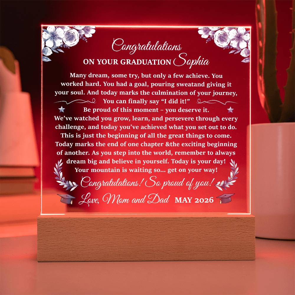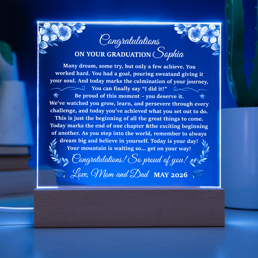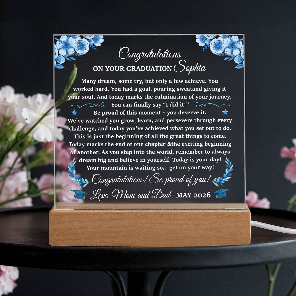 Your plaque will be crafted from premium acrylic with a professionally printed design for a polished look. It comes with a stylish wooden LED base, and you can choose between a USB plug-in option OR a cordless battery-operated option (requires 2 AAA batteries, not included). Both LED bases feature 7 vibrant colors, allowing the user to customize the lighting with various color changes and dynamic cycles.