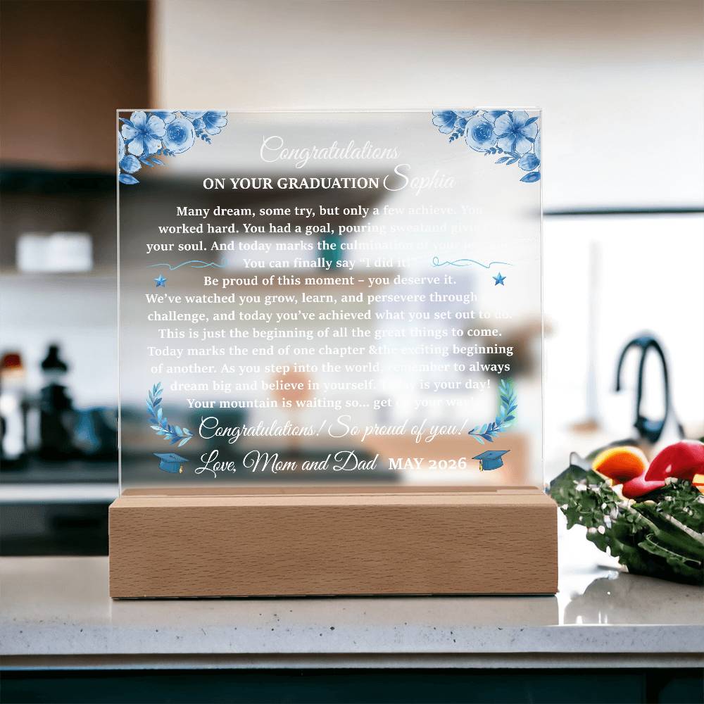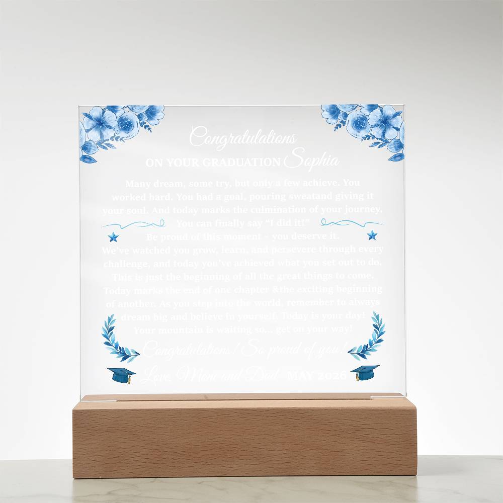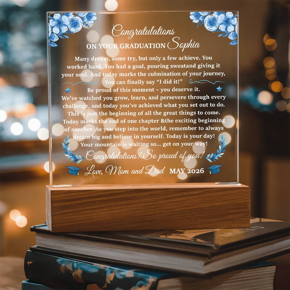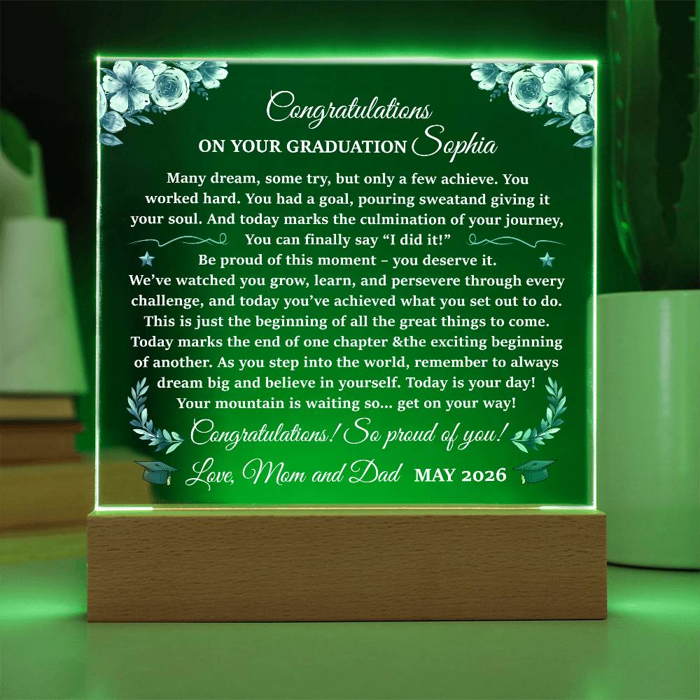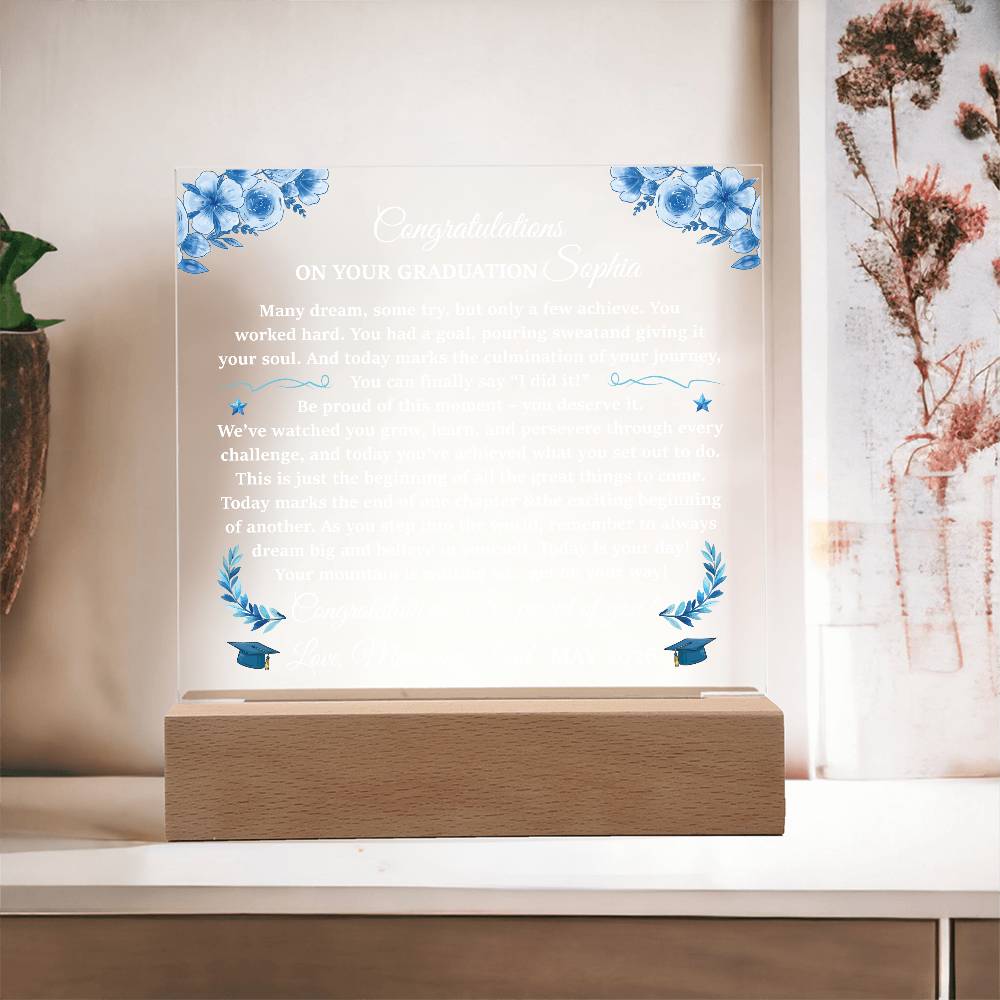 Your plaque will be crafted from premium acrylic with a professionally printed design for a polished look. It comes with a stylish wooden LED base, and you can choose between a USB plug-in option OR a cordless battery-operated option (requires 2 AAA batteries, not included). Both LED bases feature 7 vibrant colors, allowing the user to customize the lighting with various color changes and dynamic cycles.