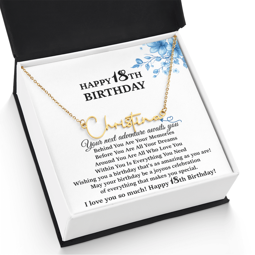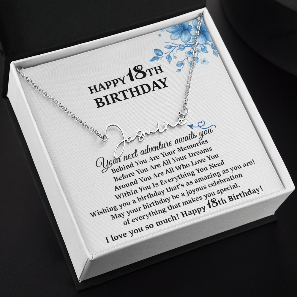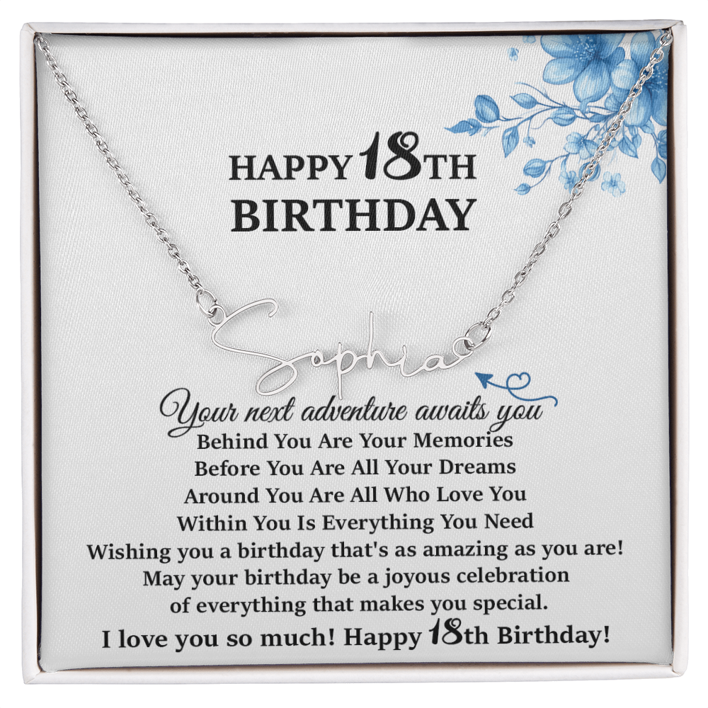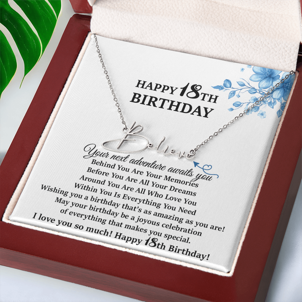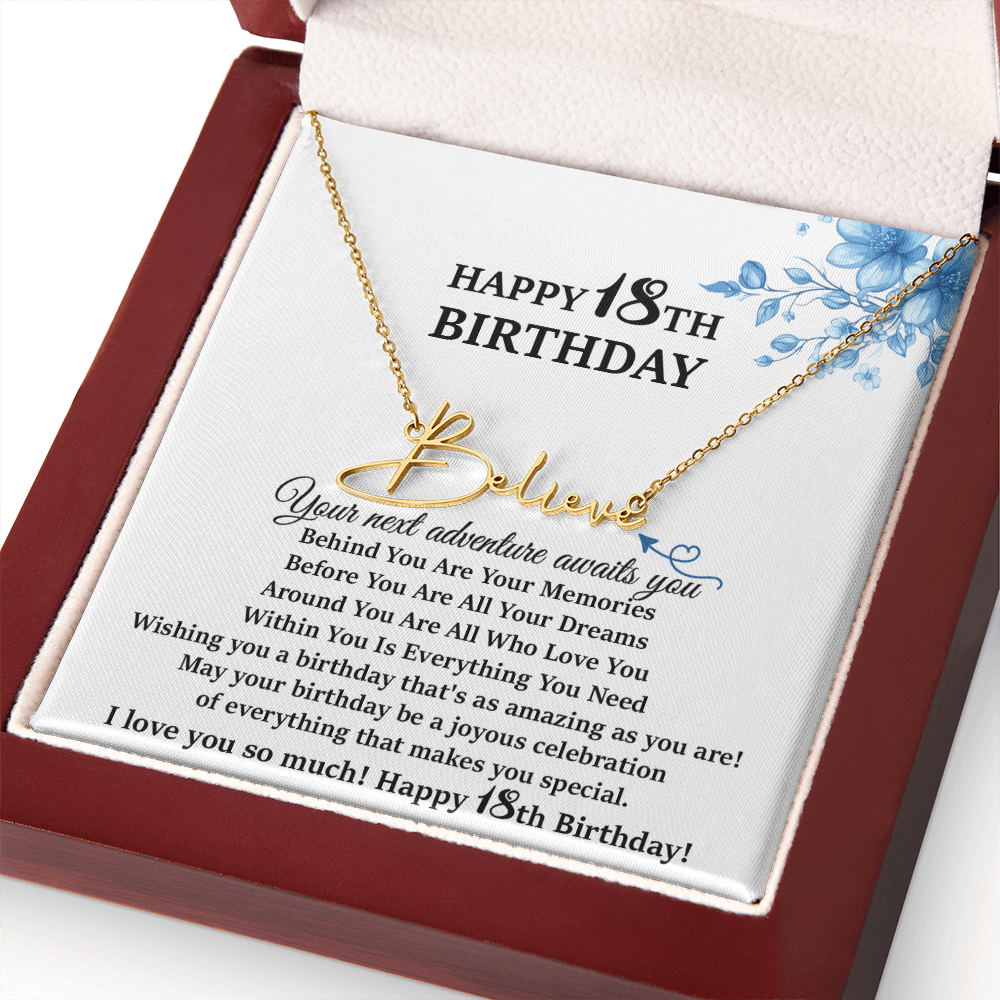 The Signature Style Name Necklace features a pretty stylized font, and is available in polished stainless steel or 18K yellow gold finish. The pendant is dually suspended on an adjustable 16”-18” cable chain for versatility. Your necklace will be custom made upon ordering in the name or word of your choice, with up to 10 characters. It's a gift that they will surely want to keep close to their heart!