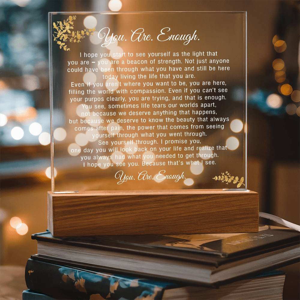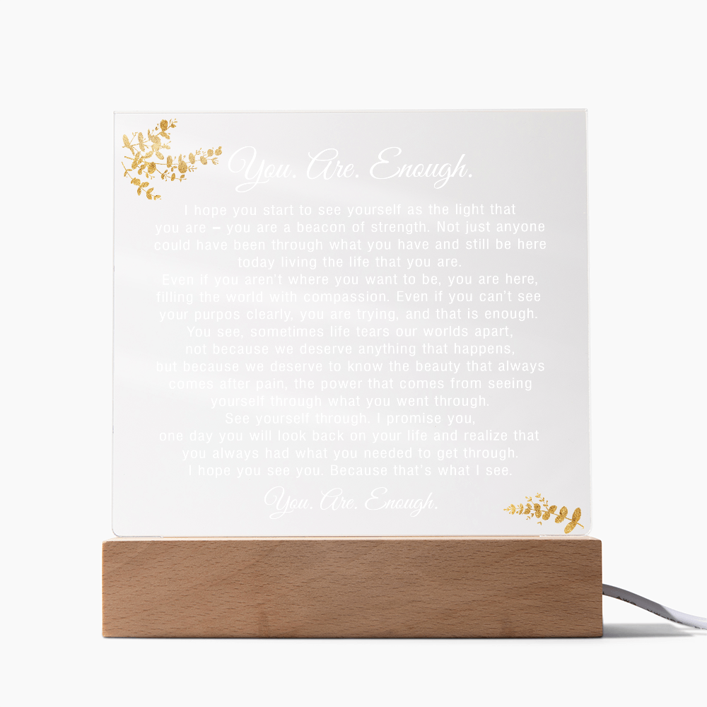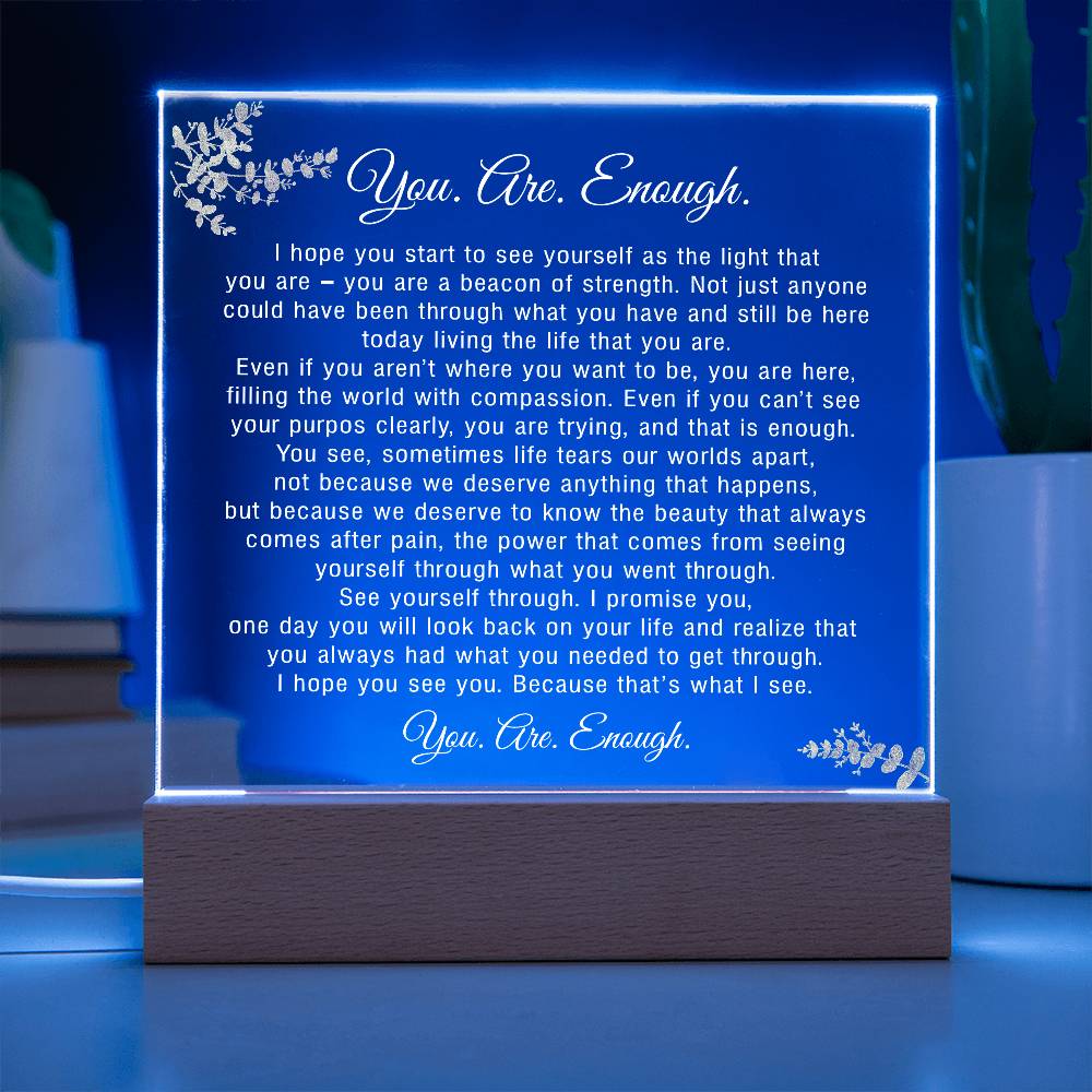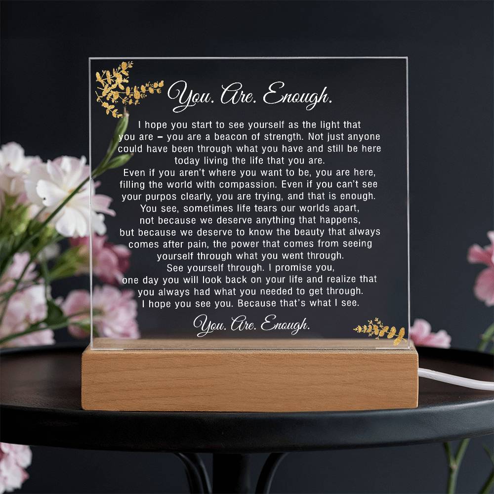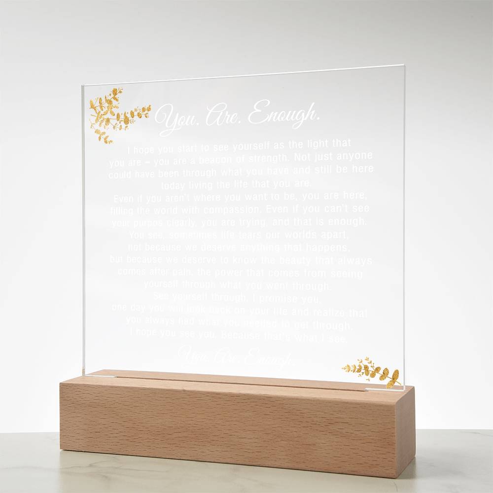 Your plaque will be crafted from premium acrylic with a professionally printed design for a polished look. It comes with a stylish wooden LED base, and you can choose between a USB plug-in option OR a cordless battery-operated option (requires 2 AAA batteries, not included). Both LED bases feature 7 vibrant colors, allowing the user to customize the lighting with various color changes and dynamic cycles.