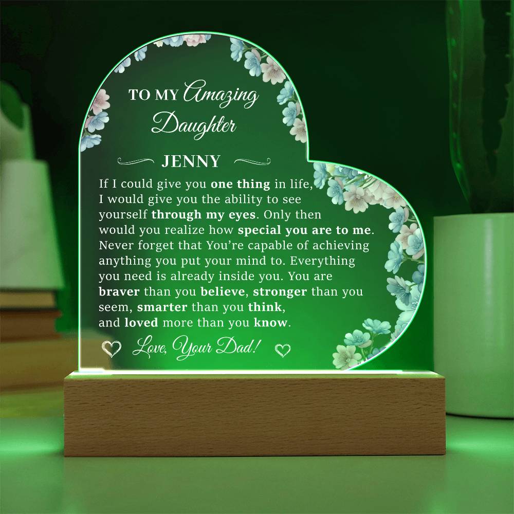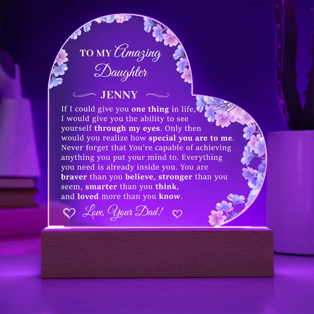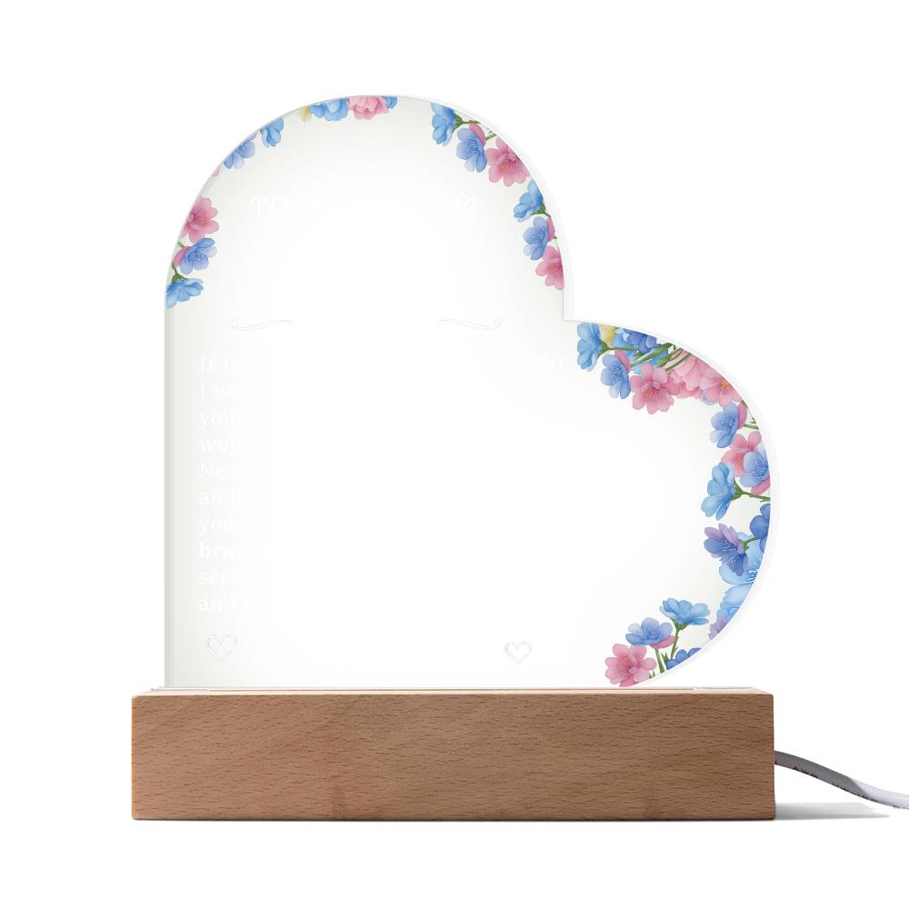 Your plaque will be crafted from premium acrylic with a professionally printed design for a polished look. It comes with a stylish wooden LED base, and you can choose between a USB plug-in option OR a cordless battery-operated option (requires 2 AAA batteries, not included). Both LED bases feature 7 vibrant colors, allowing the user to customize the lighting with various color changes and dynamic cycles.