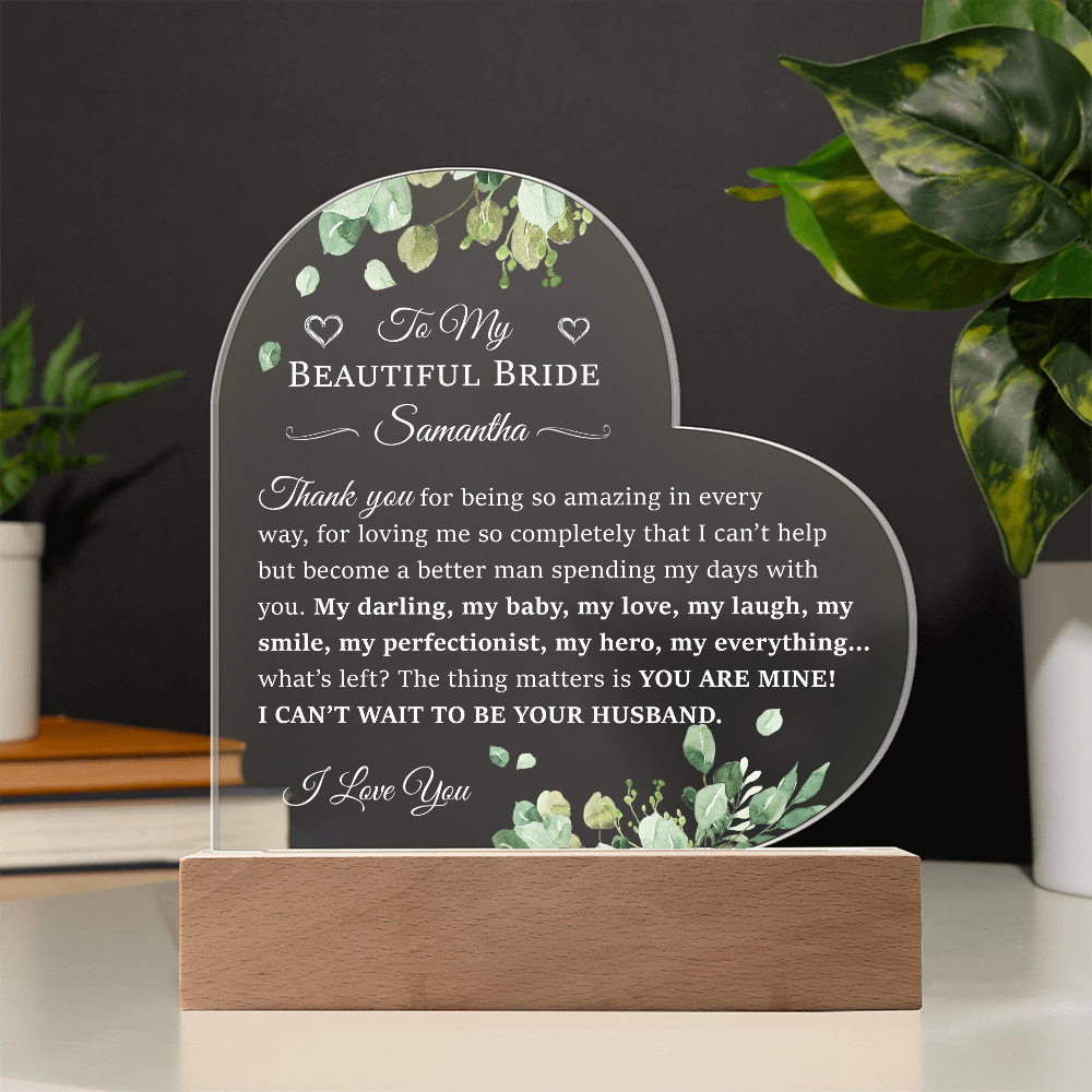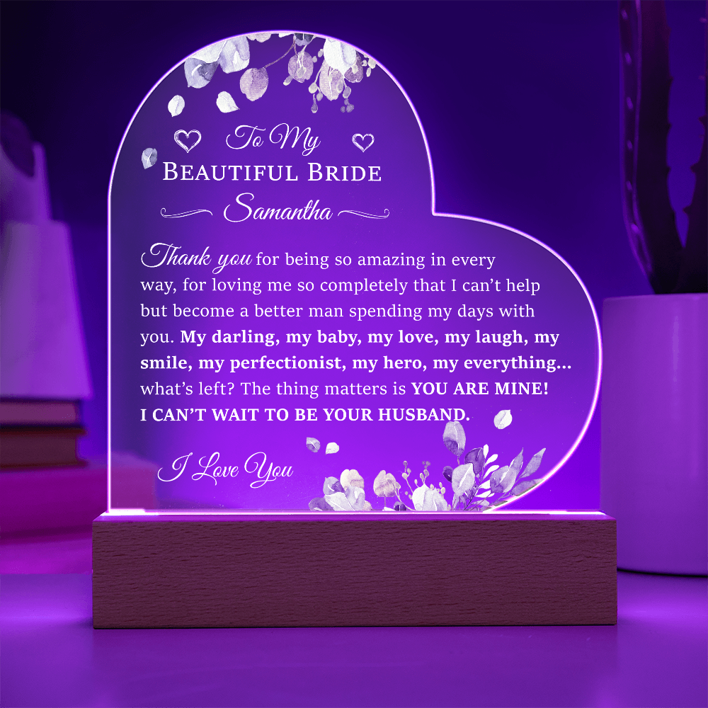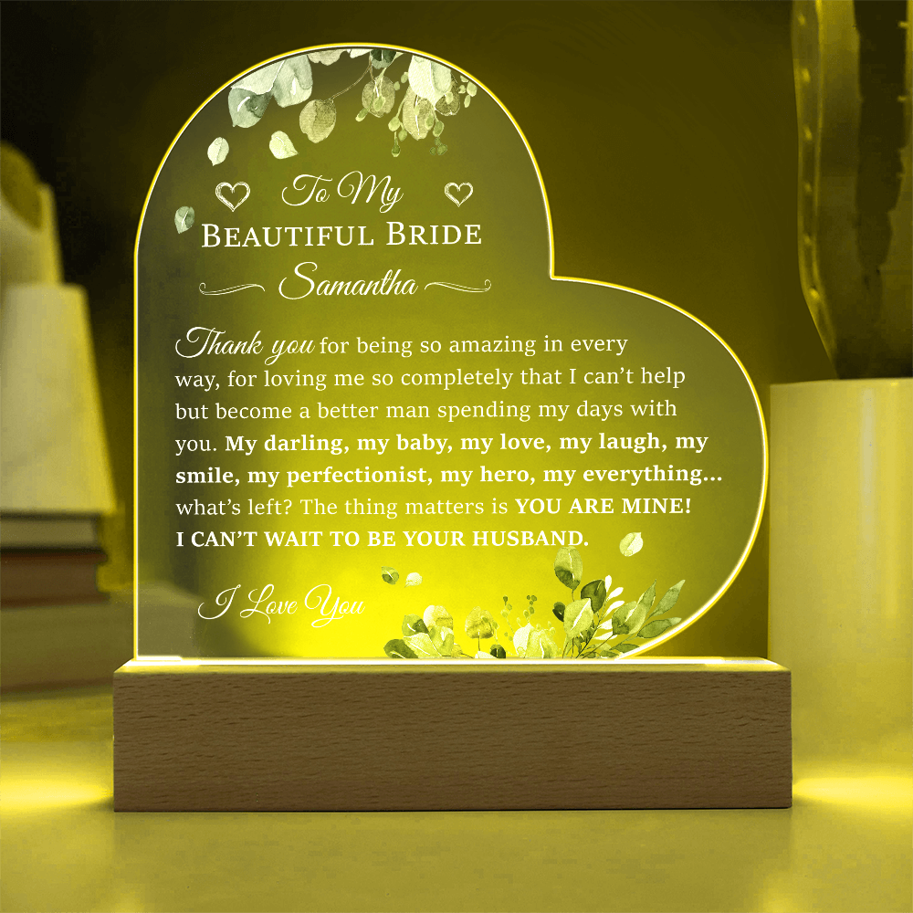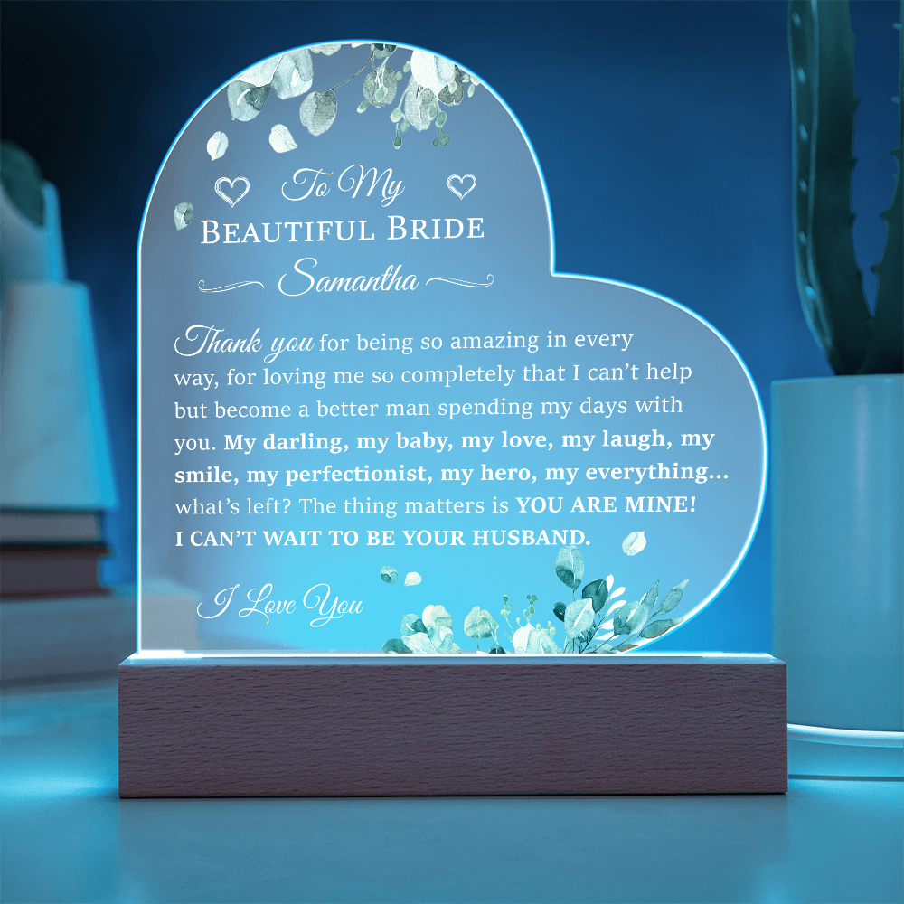 Your plaque will be crafted from premium acrylic with a professionally printed design for a polished look. It comes with a stylish wooden LED base, and you can choose between a USB plug-in option OR a cordless battery-operated option (requires 2 AAA batteries, not included). Both LED bases feature 7 vibrant colors, allowing the user to customize the lighting with various color changes and dynamic cycles.