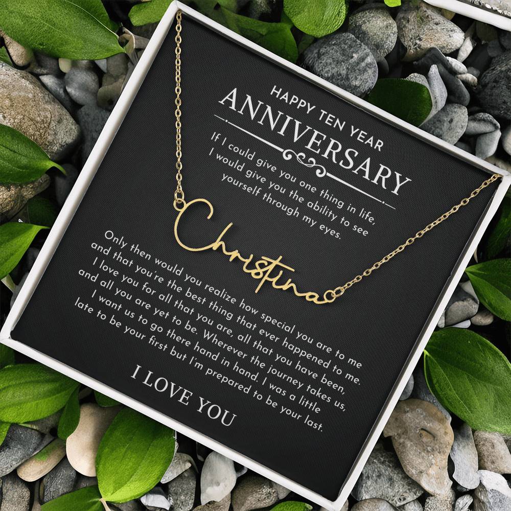 The Signature Style Name Necklace features a pretty stylized font, and is available in polished stainless steel or 18K yellow gold finish. The pendant is dually suspended on an adjustable 16”-18” cable chain for versatility. Your necklace will be custom made upon ordering in the name or word of your choice, with up to 10 characters. It's a gift that they will surely want to keep close to their heart!