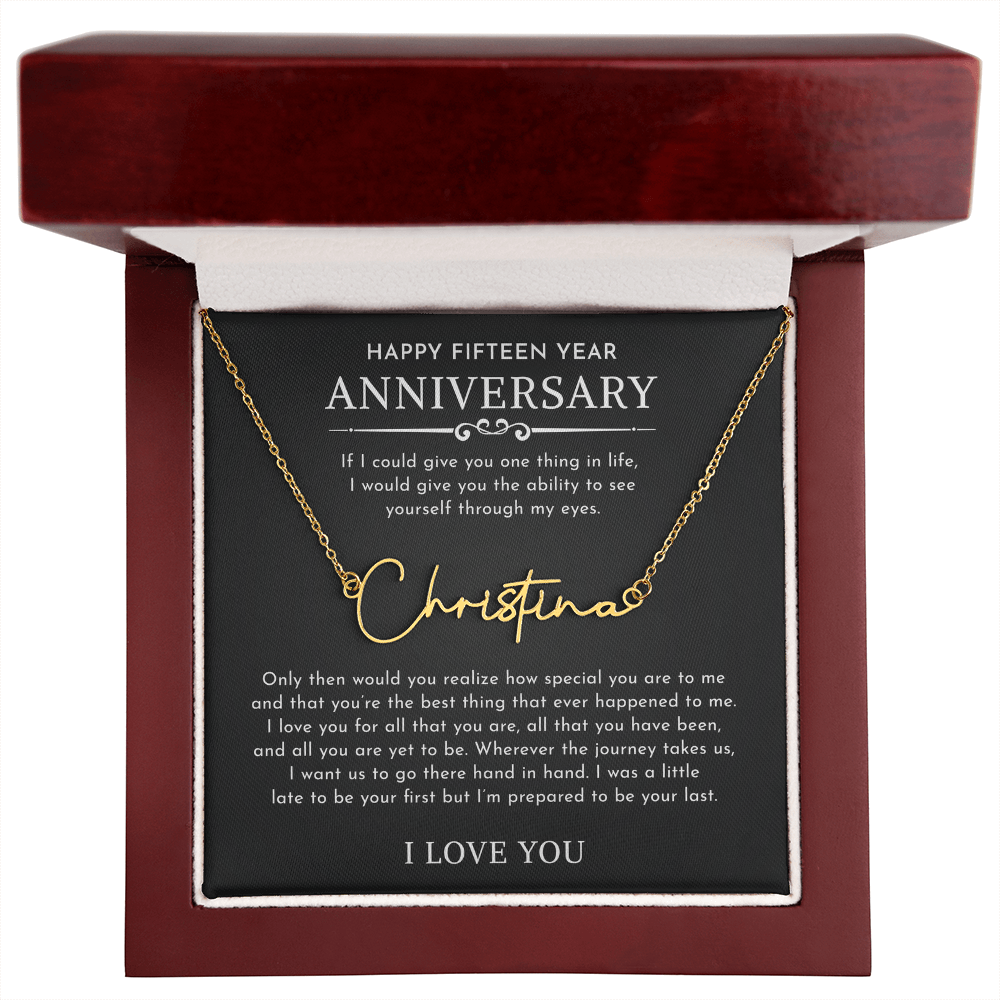 The Signature Style Name Necklace features a pretty stylized font, and is available in polished stainless steel or 18K yellow gold finish. The pendant is dually suspended on an adjustable 16”-18” cable chain for versatility. Your necklace will be custom made upon ordering in the name or word of your choice, with up to 10 characters. It's a gift that they will surely want to keep close to their heart!