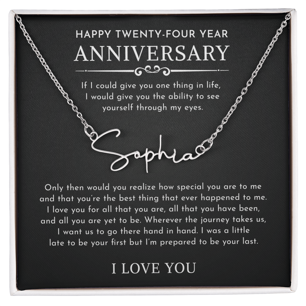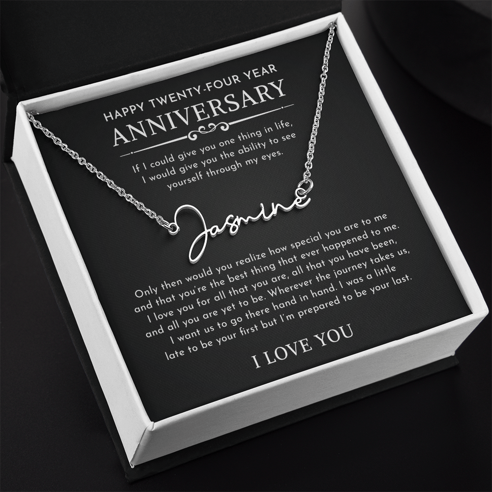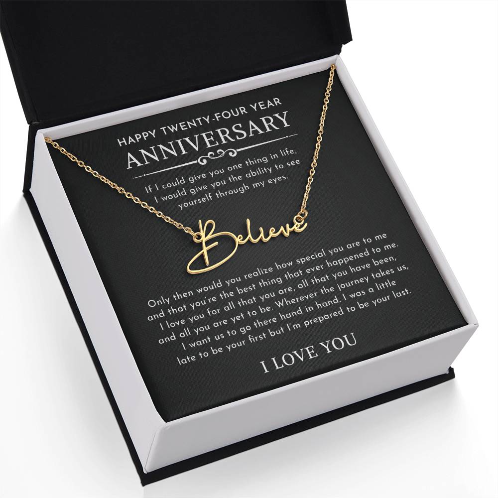 The Signature Style Name Necklace features a pretty stylized font, and is available in polished stainless steel or 18K yellow gold finish. The pendant is dually suspended on an adjustable 16”-18” cable chain for versatility. Your necklace will be custom made upon ordering in the name or word of your choice, with up to 10 characters. It's a gift that they will surely want to keep close to their heart!