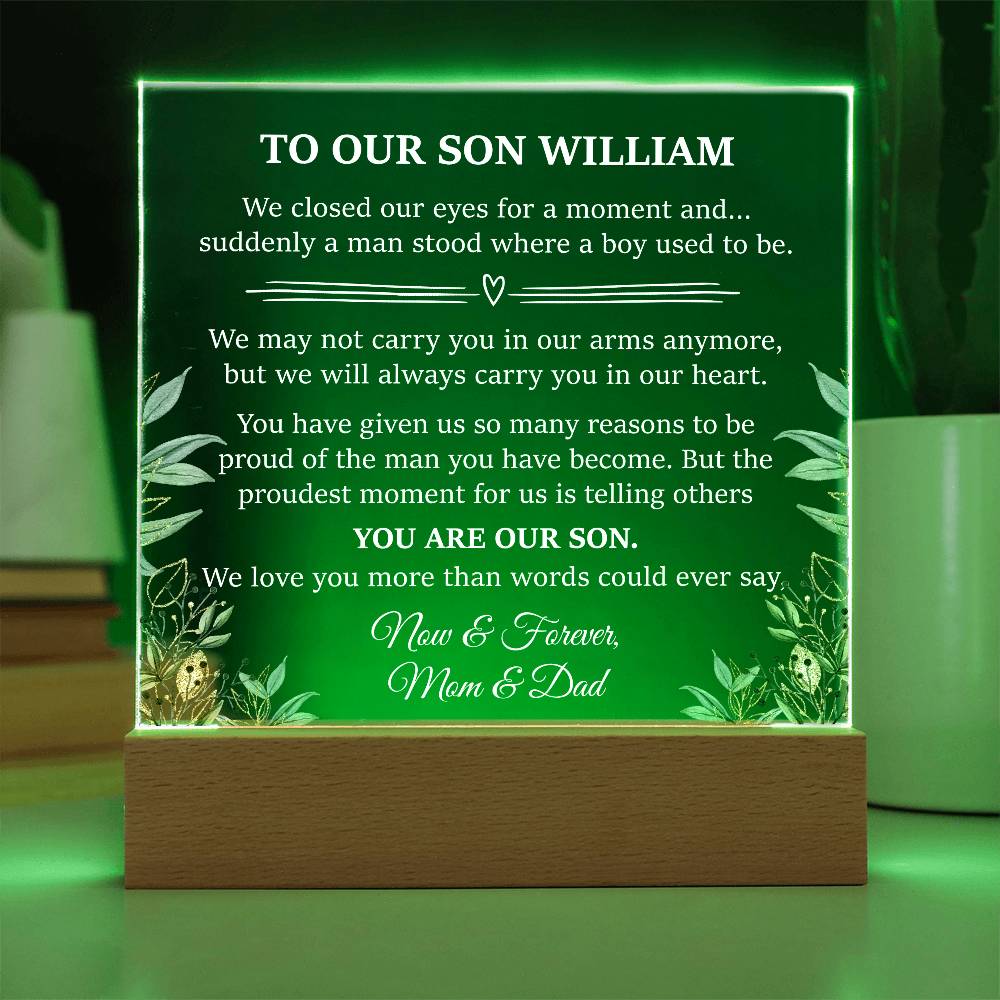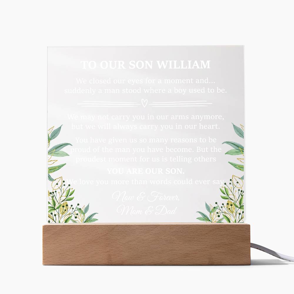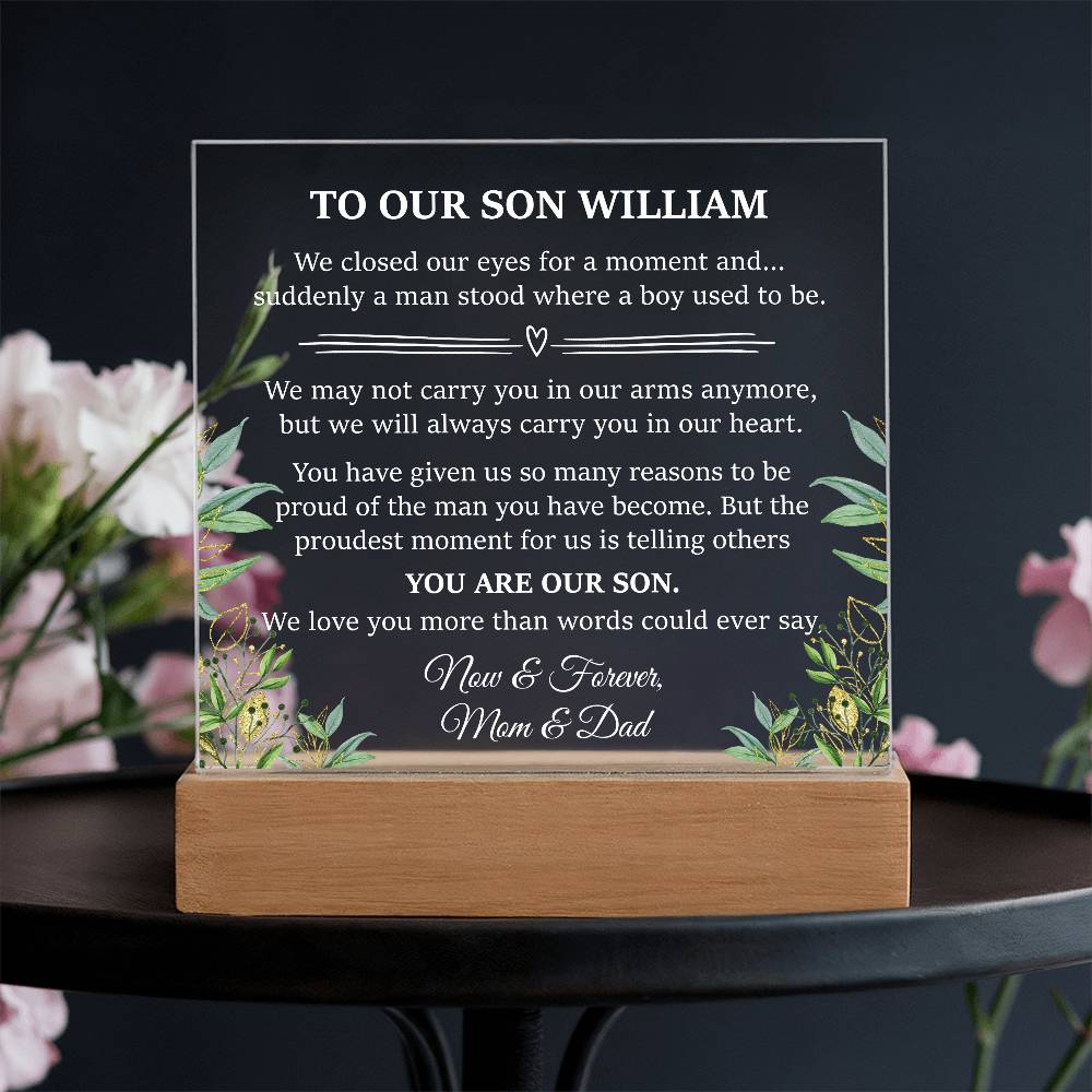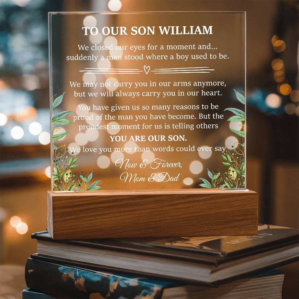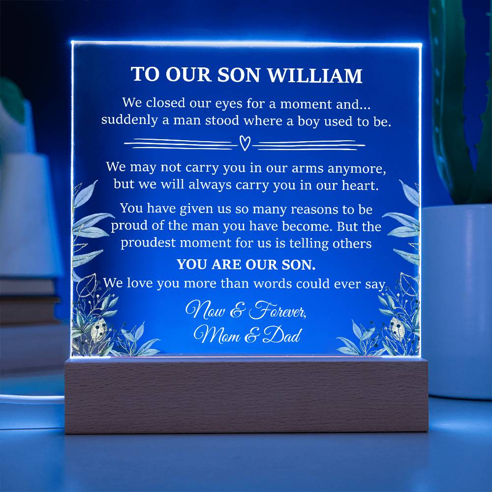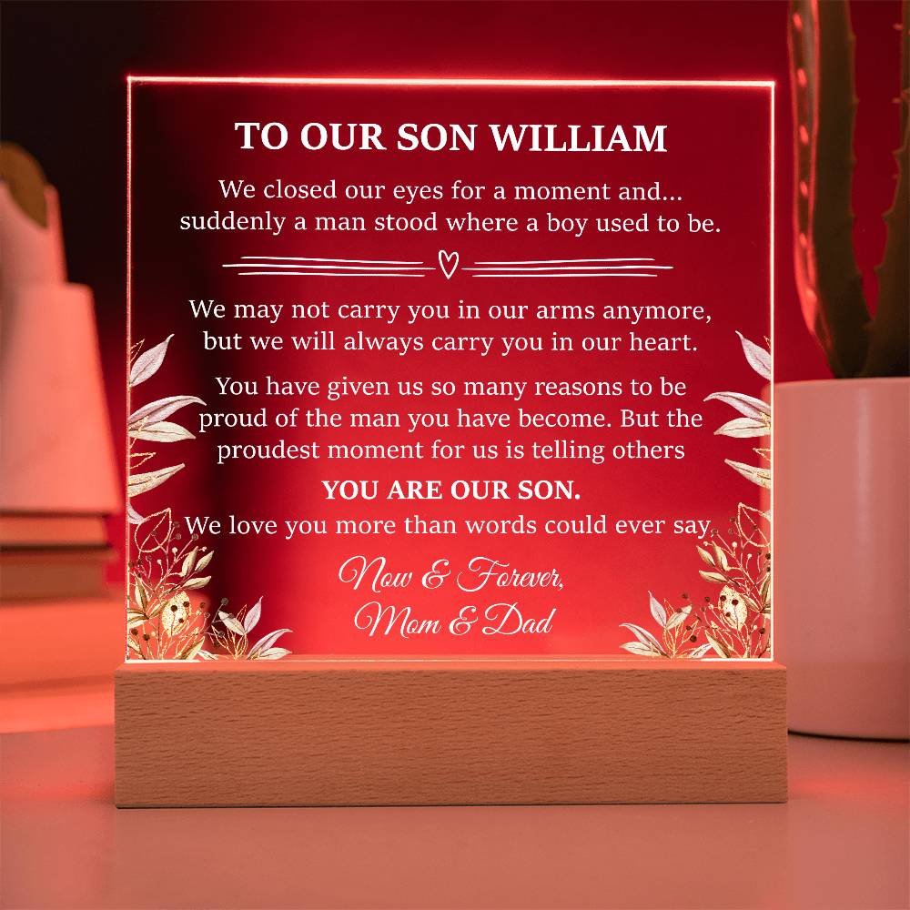 Your plaque will be crafted from premium acrylic with a professionally printed design for a polished look. It comes with a stylish wooden LED base, and you can choose between a USB plug-in option OR a cordless battery-operated option (requires 2 AAA batteries, not included). Both LED bases feature 7 vibrant colors, allowing the user to customize the lighting with various color changes and dynamic cycles.