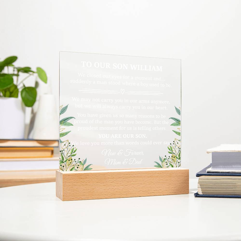 Create a memorable welcome to any room with our Printed Square Acrylic Plaque. This beautiful sign is handcrafted using premium acrylic and a vibrantly printed design. Display your beautiful plaque in your own home or give it as a gift to make a statement. This would make an ideal gift for your beloved partner, family members, or dear friends on special occasions like anniversaries, birthdays, or any event where you want to express your love and appreciation in an unforgettable way.