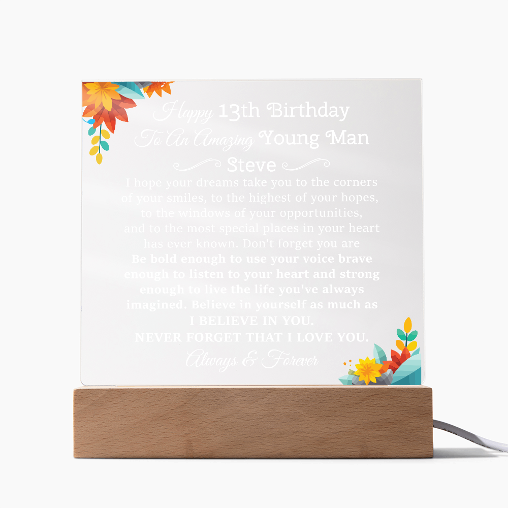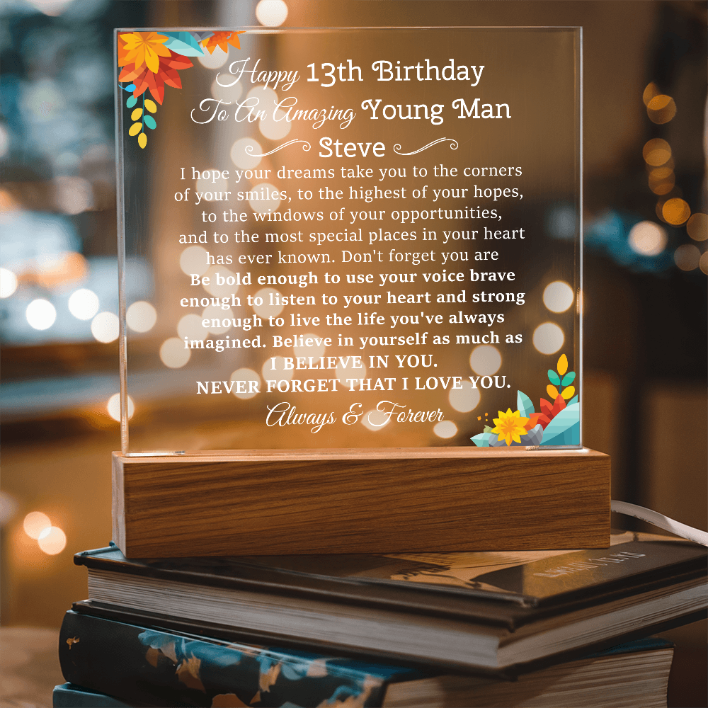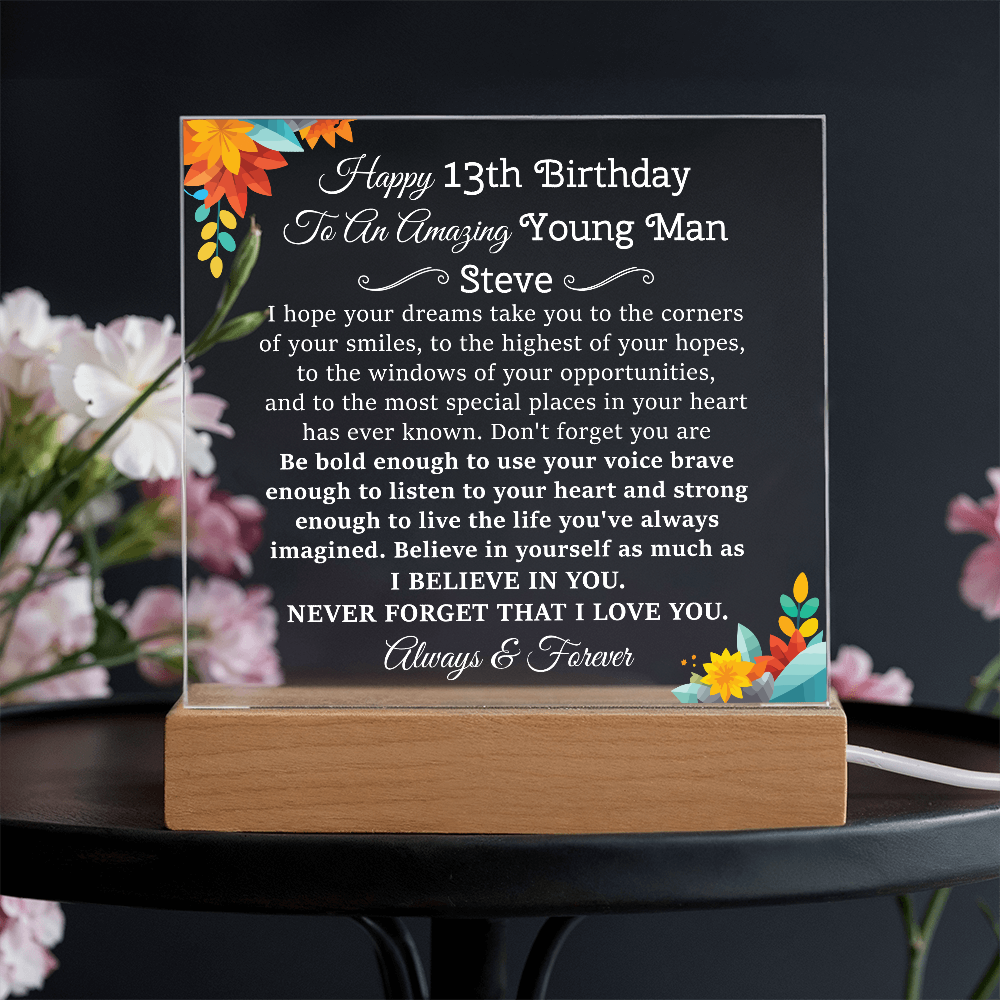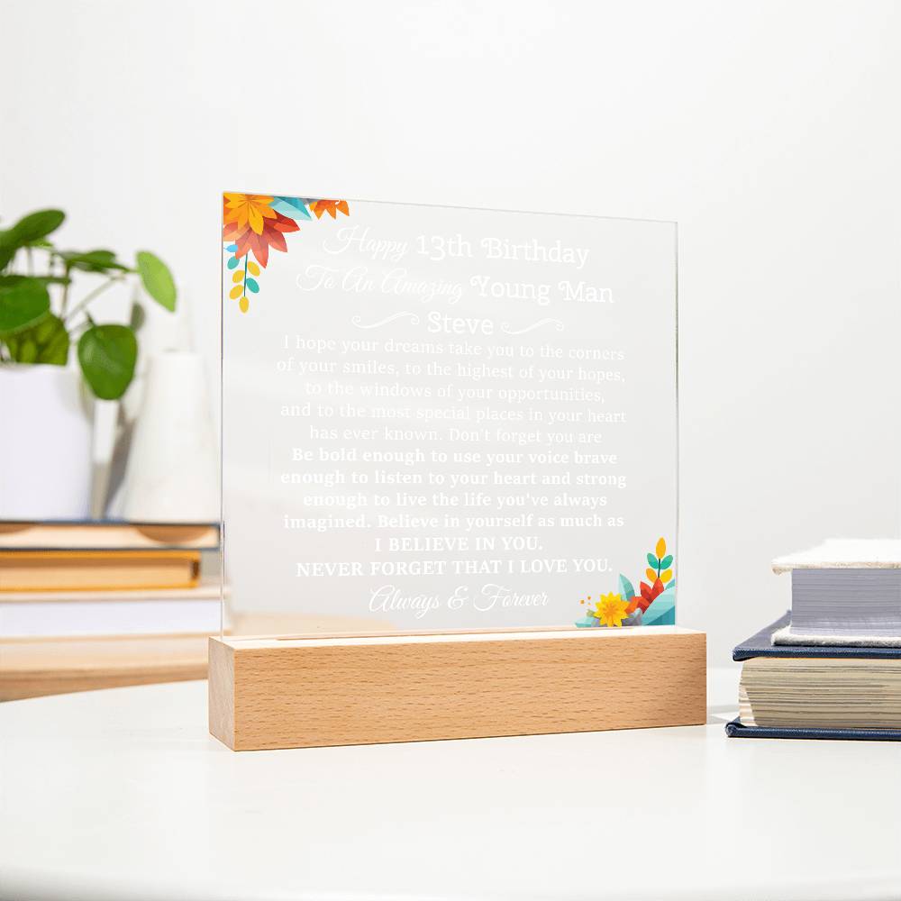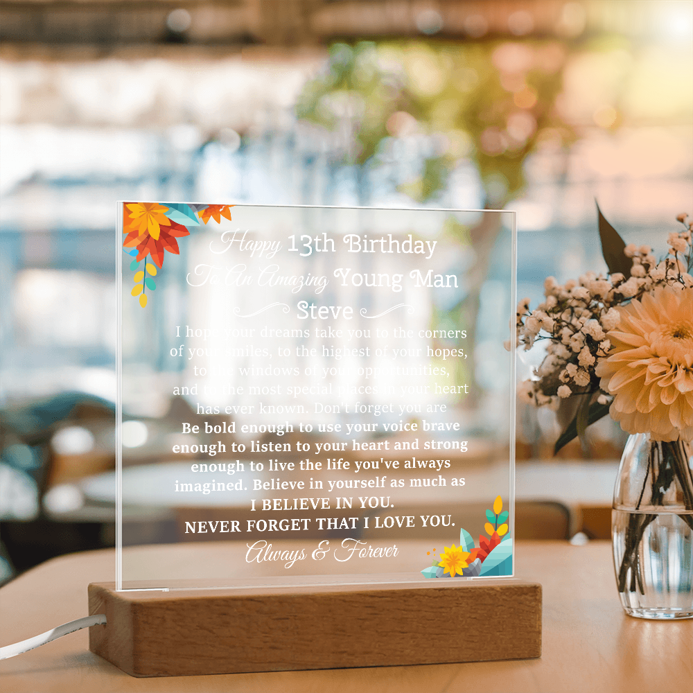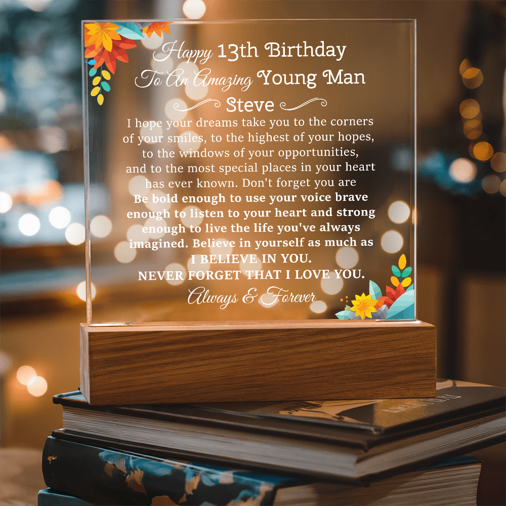 Your plaque will be crafted from premium acrylic with a professionally printed design for a polished look. It comes with a stylish wooden LED base, and you can choose between a USB plug-in option OR a cordless battery-operated option (requires 2 AAA batteries, not included). Both LED bases feature 7 vibrant colors, allowing the user to customize the lighting with various color changes and dynamic cycles.