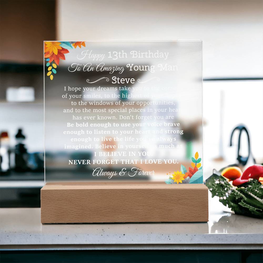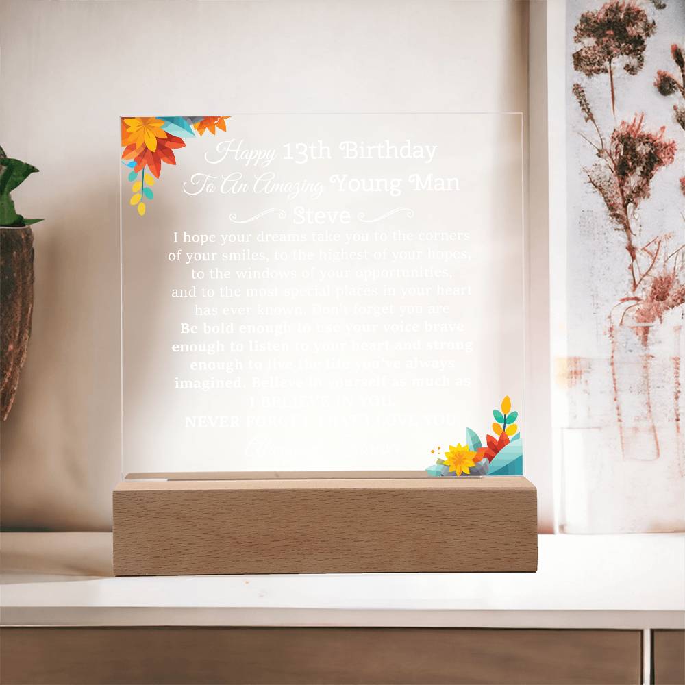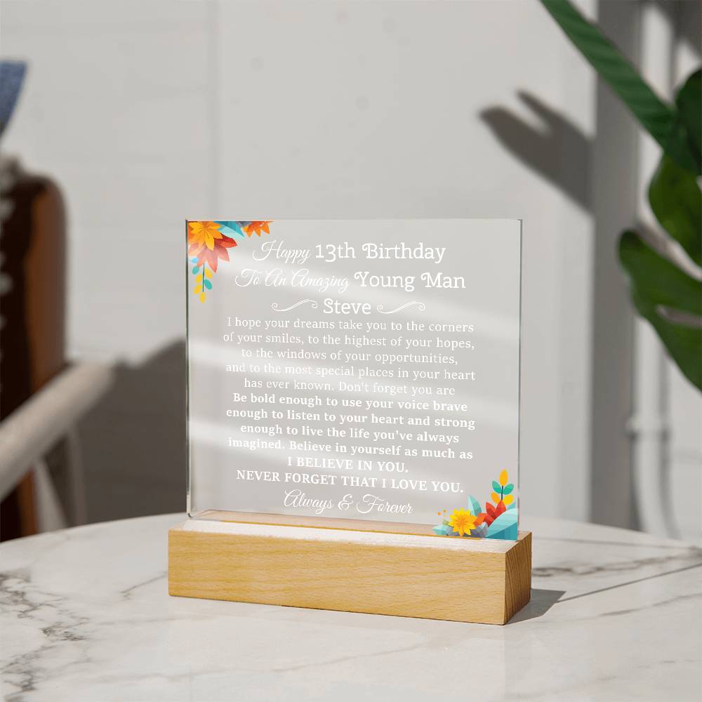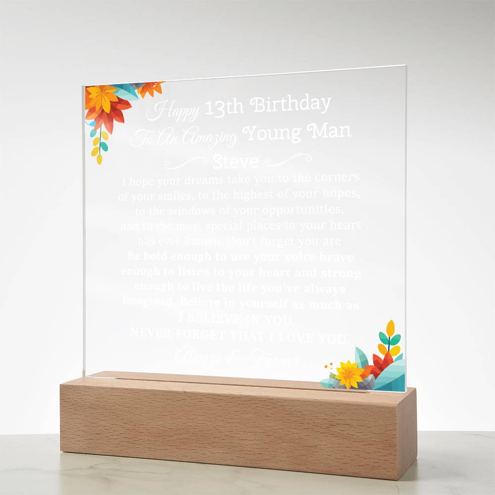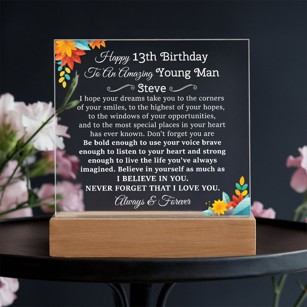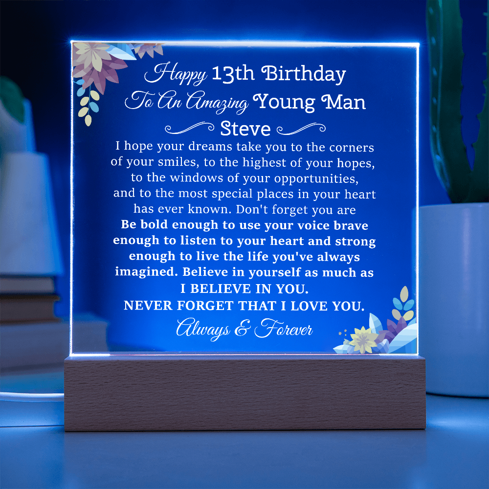 Your plaque will be crafted from premium acrylic with a professionally printed design for a polished look. It comes with a stylish wooden LED base, and you can choose between a USB plug-in option OR a cordless battery-operated option (requires 2 AAA batteries, not included). Both LED bases feature 7 vibrant colors, allowing the user to customize the lighting with various color changes and dynamic cycles.