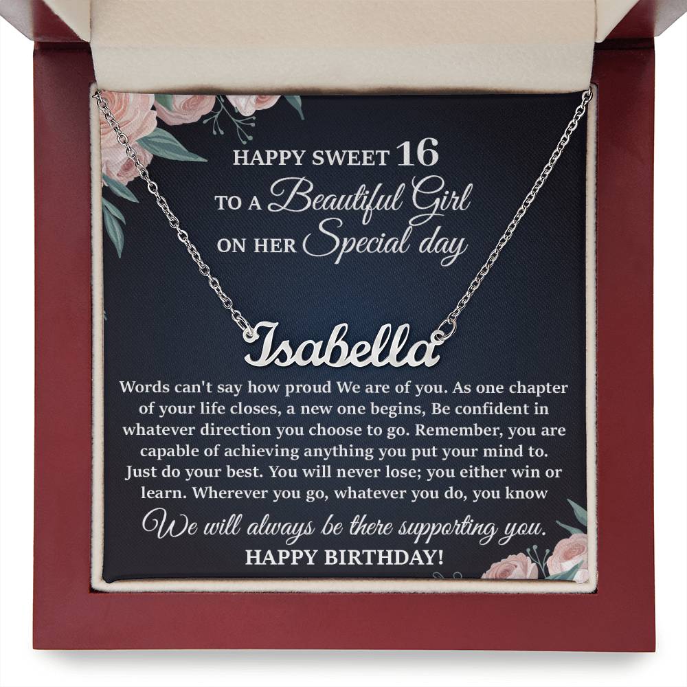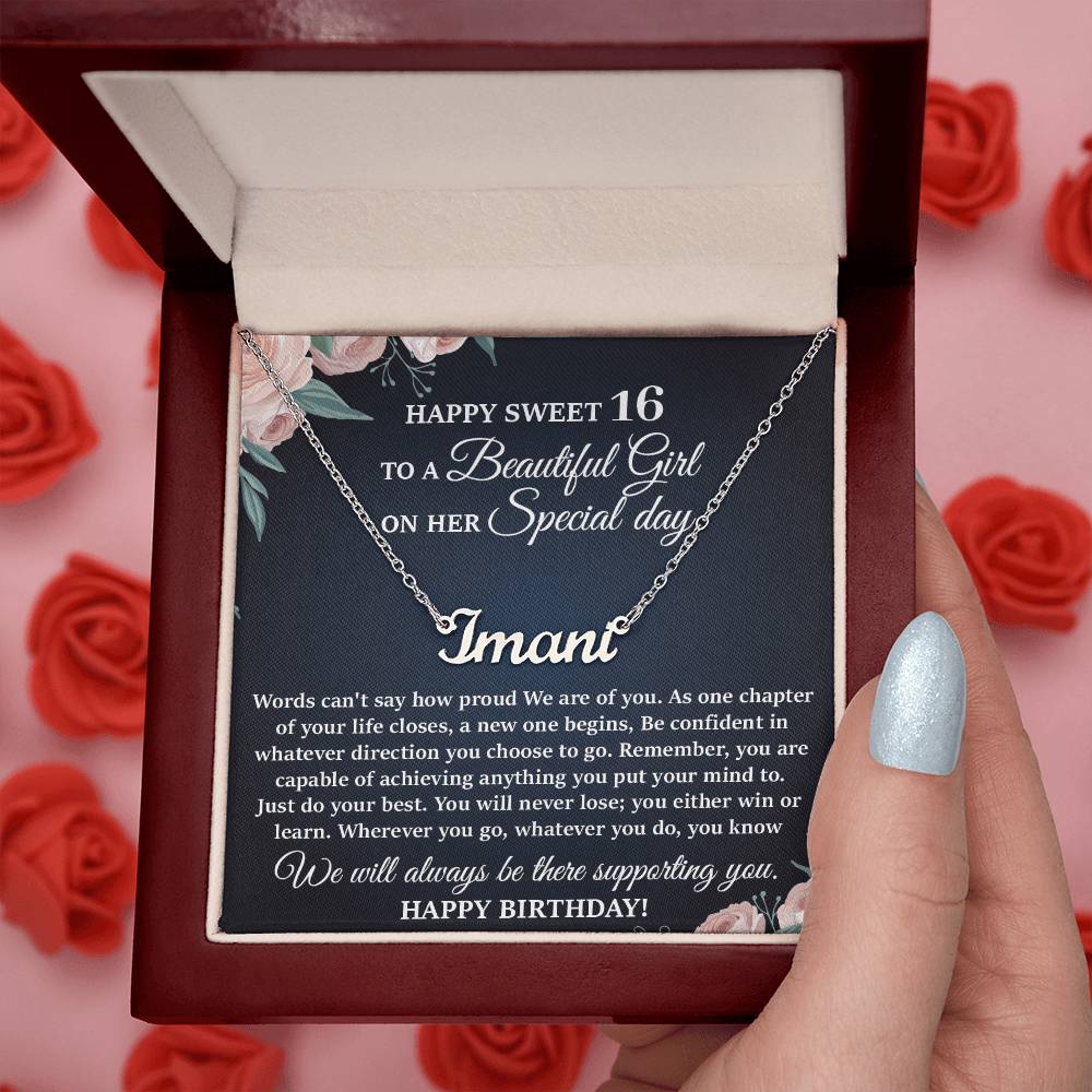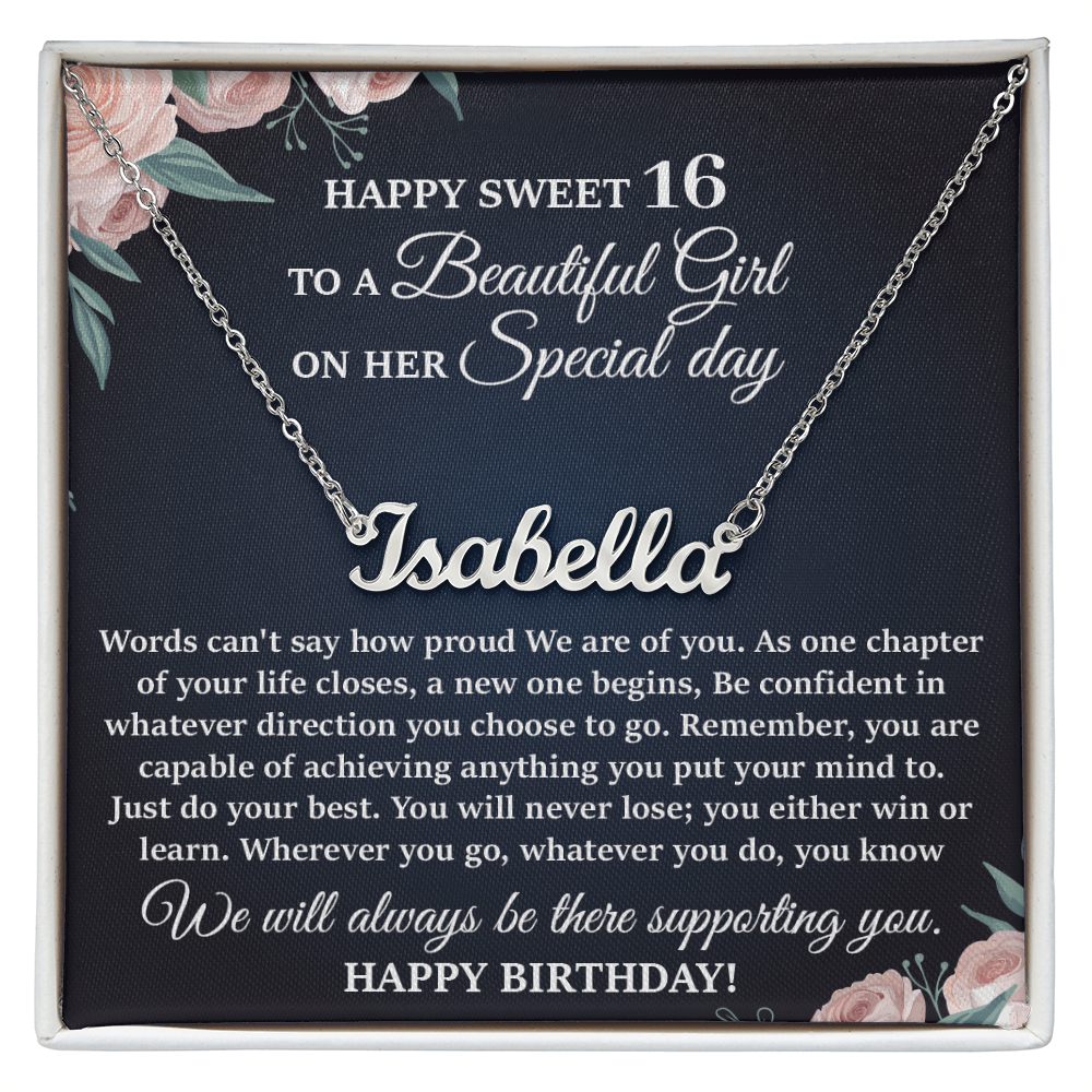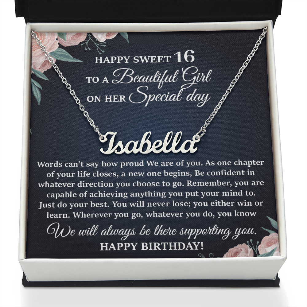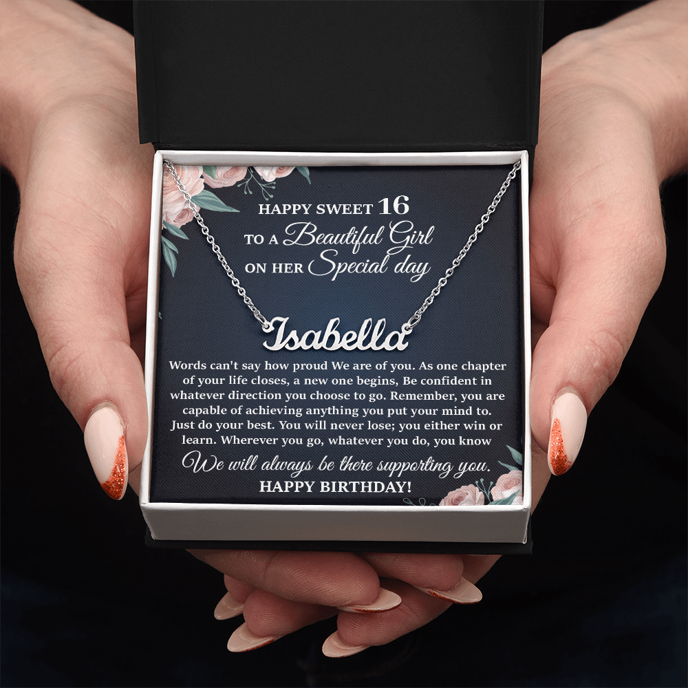 This stylish necklace features a cursive name design suspended on an 16”-18” adjustable cable chain, making it both personal and beautiful! Your necklace will be custom made upon ordering in the name or word of your choice, with up to 10 characters. It's a gift that they will surely want to keep close to their heart forever!