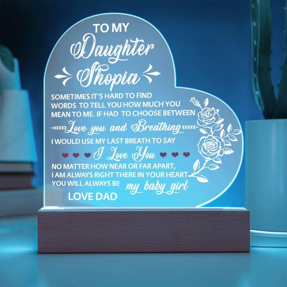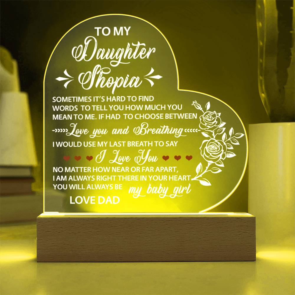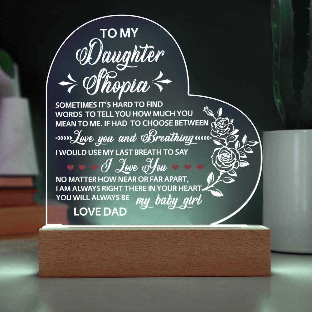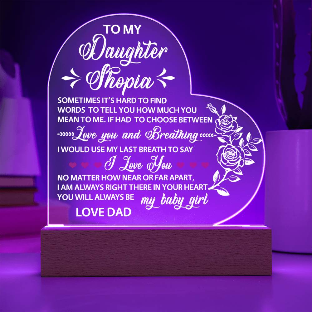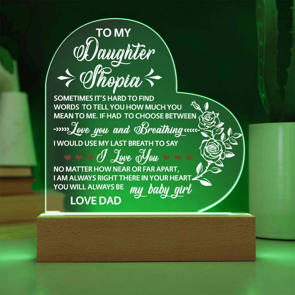 Your plaque will be crafted from premium acrylic with a professionally printed design for a polished look. It comes with a stylish wooden LED base, and you can choose between a USB plug-in option OR a cordless battery-operated option (requires 2 AAA batteries, not included). Both LED bases feature 7 vibrant colors, allowing the user to customize the lighting with various color changes and dynamic cycles.