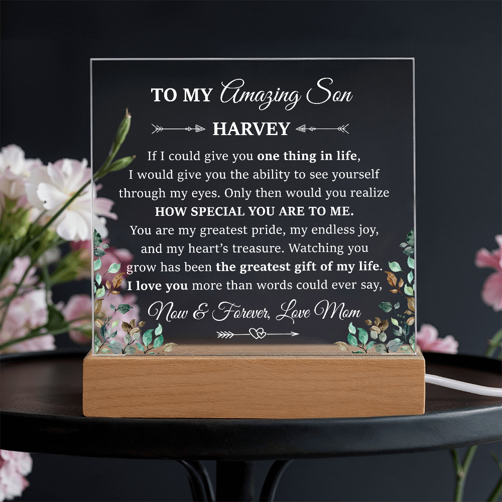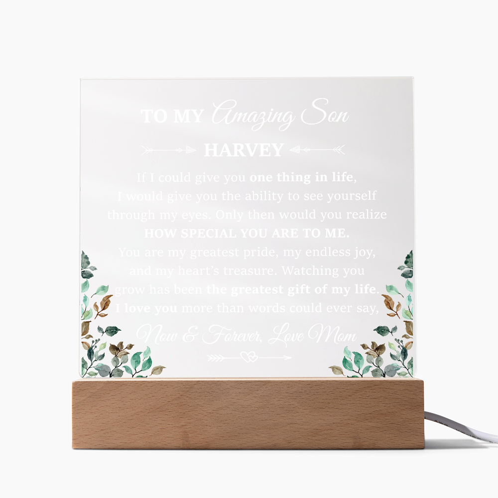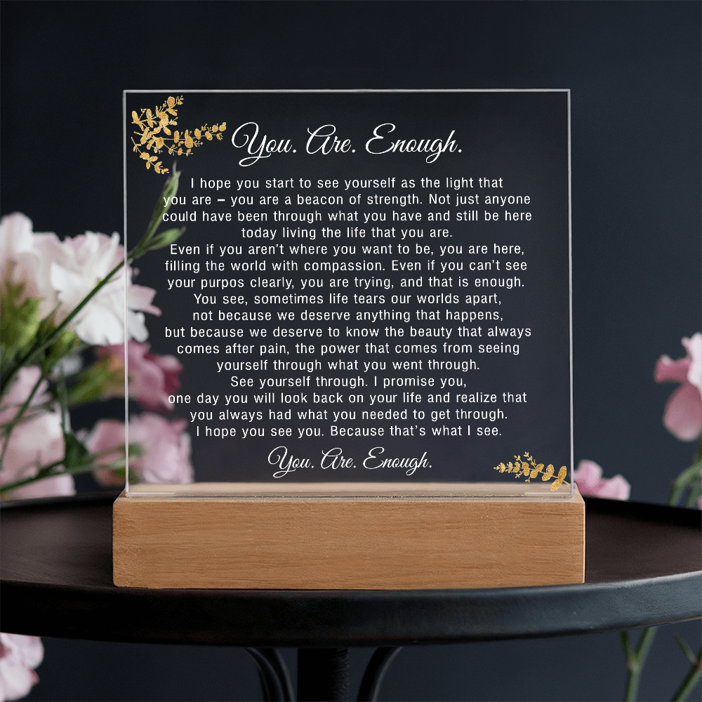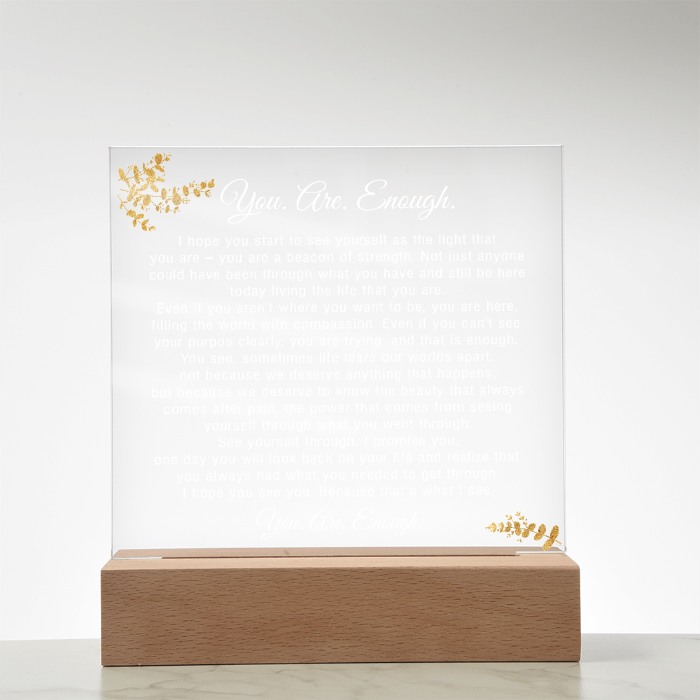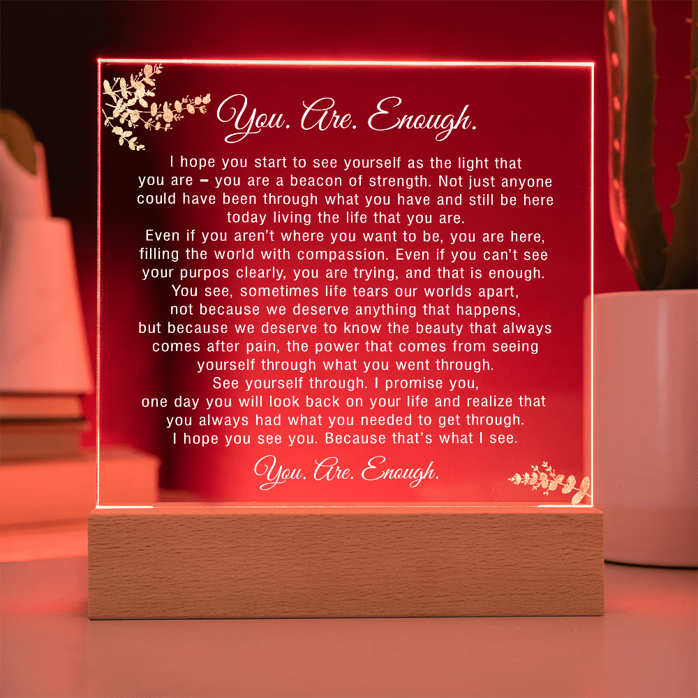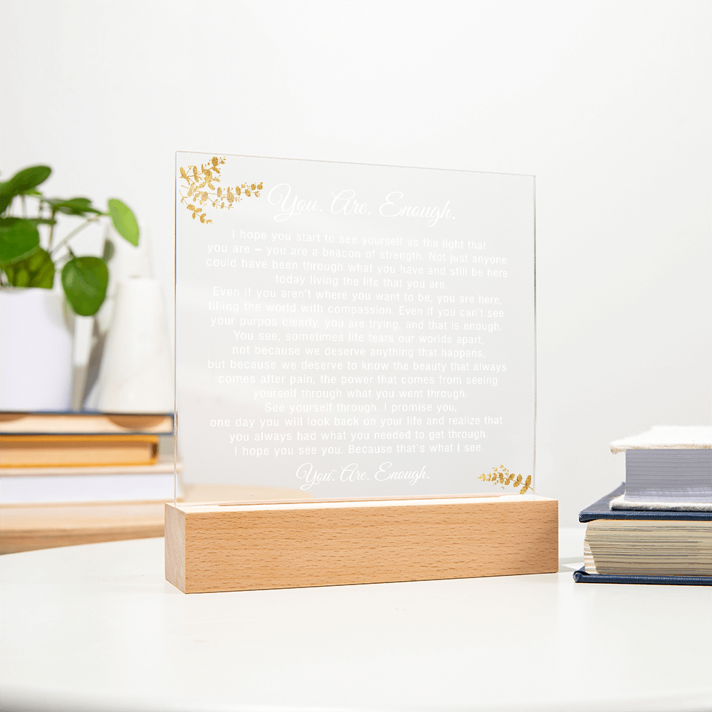 Your plaque will be crafted from premium acrylic with a professionally printed design for a polished look. It comes with a stylish wooden LED base, and you can choose between a USB plug-in option OR a cordless battery-operated option (requires 2 AAA batteries, not included). Both LED bases feature 7 vibrant colors, allowing the user to customize the lighting with various color changes and dynamic cycles.