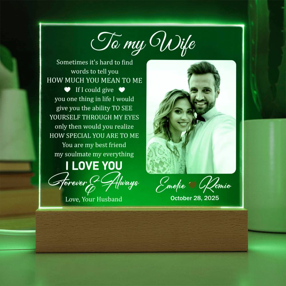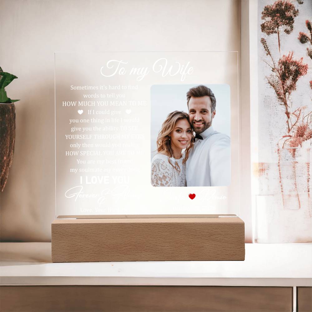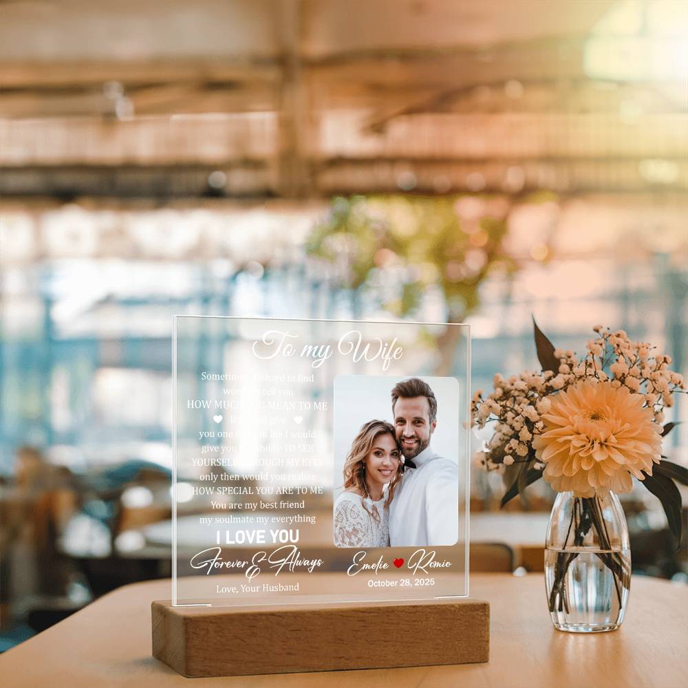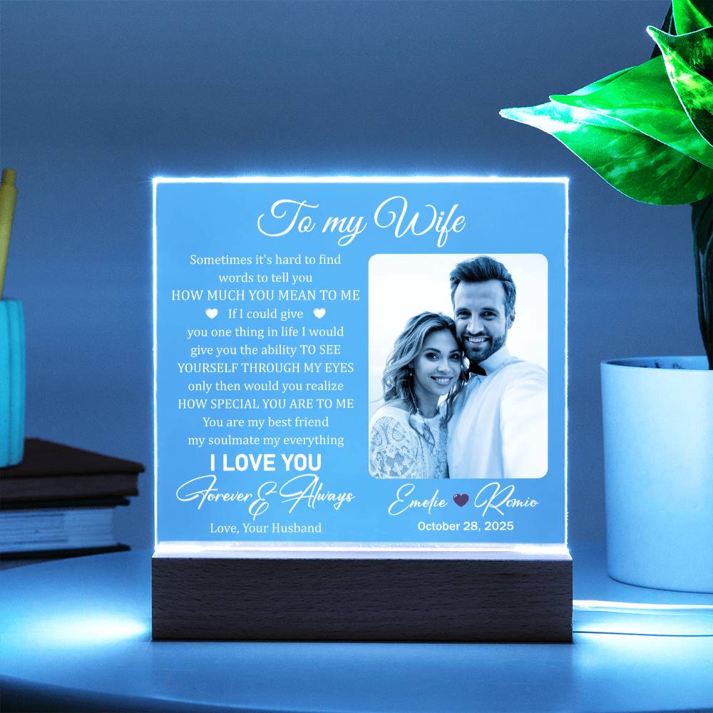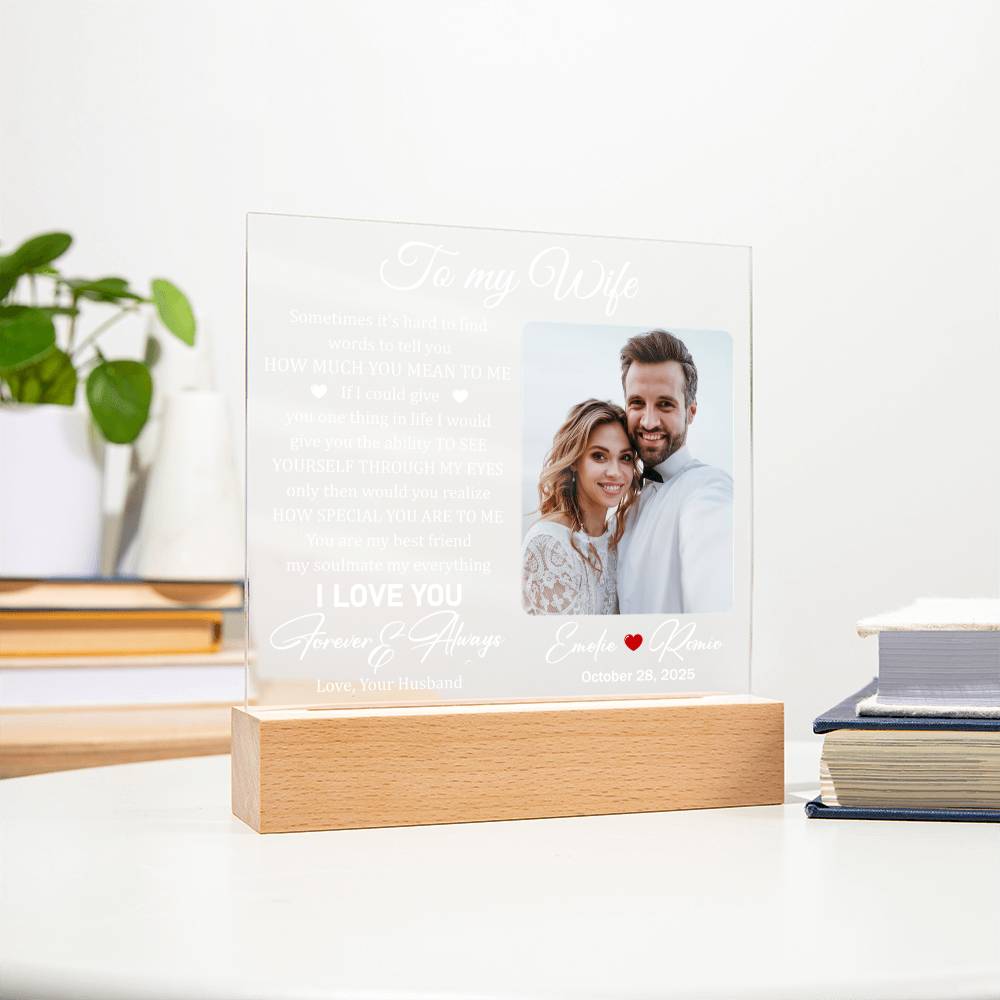Your plaque will be crafted from premium acrylic with a professionally printed design for a polished look. It comes with a stylish wooden LED base, and you can choose between a USB plug-in option OR a cordless battery-operated option (requires 2 AAA batteries, not included). Both LED bases feature 7 vibrant colors, allowing the user to customize the lighting with various color changes and dynamic cycles.