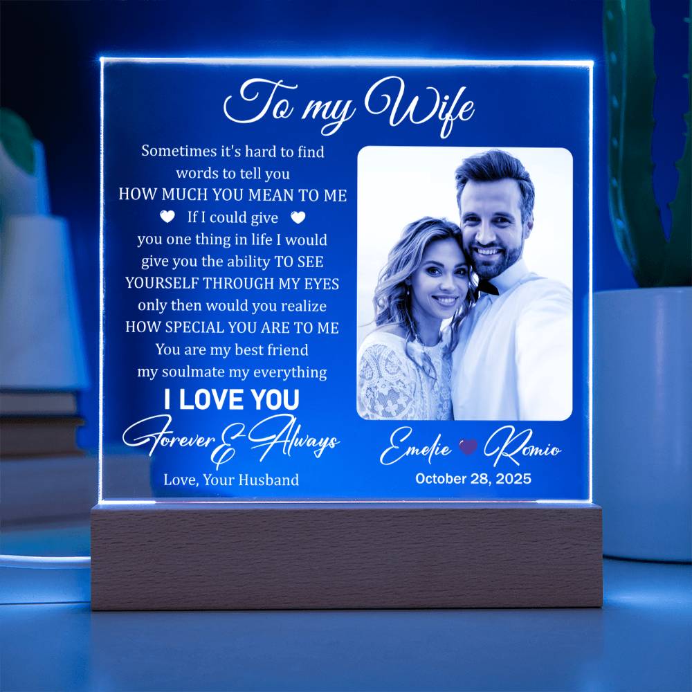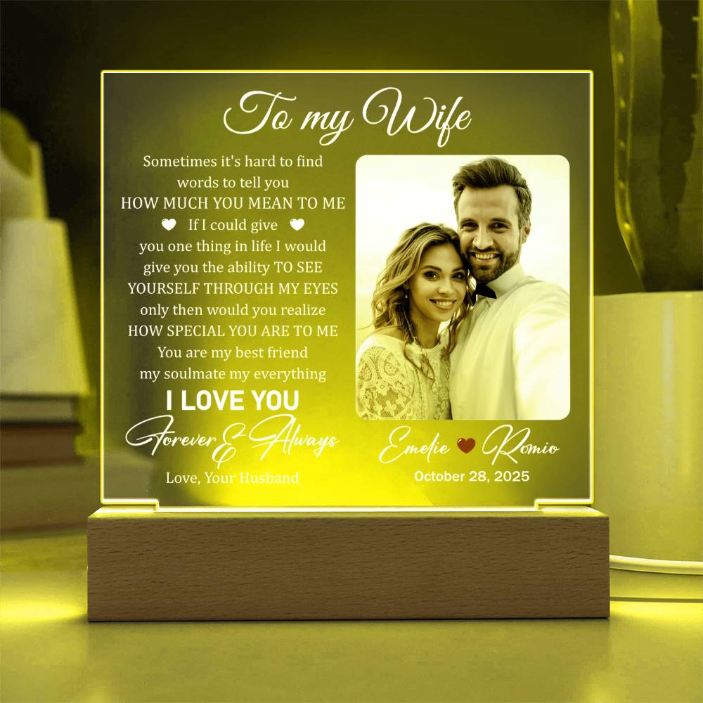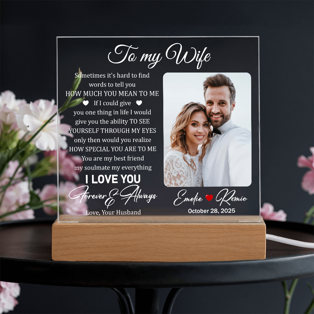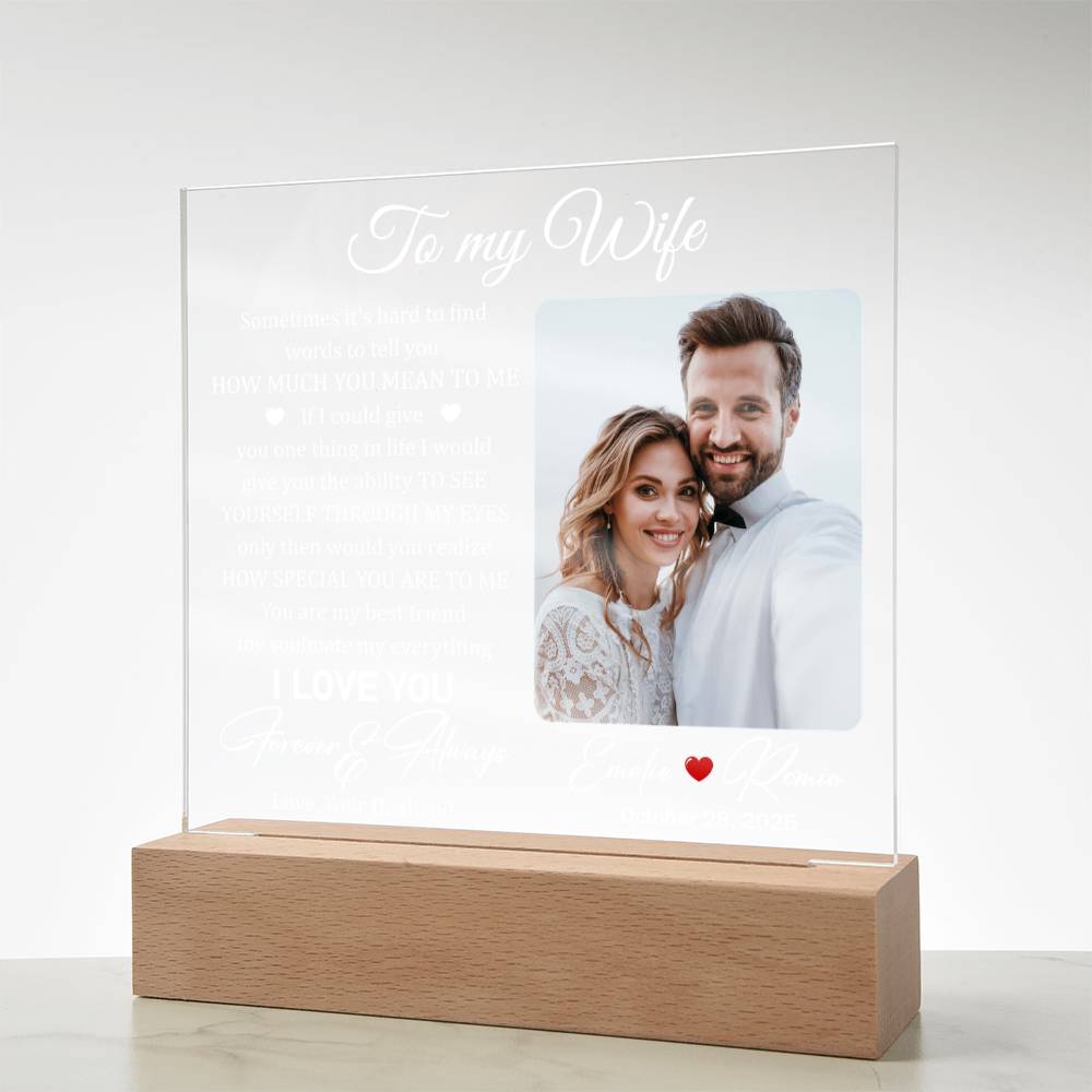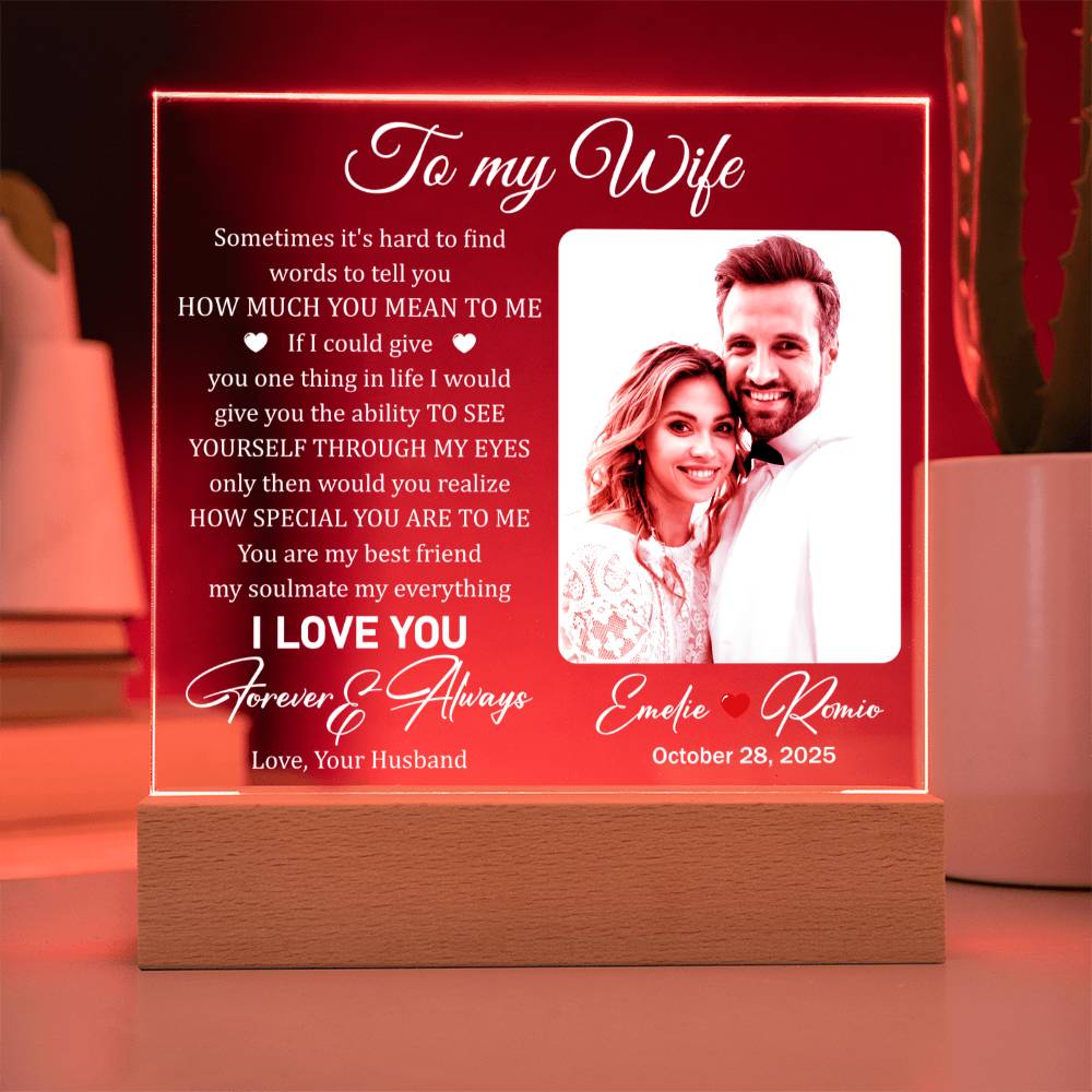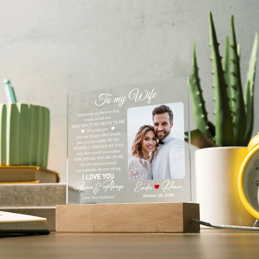 Your plaque will be crafted from premium acrylic with a professionally printed design for a polished look. It comes with a stylish wooden LED base, and you can choose between a USB plug-in option OR a cordless battery-operated option (requires 2 AAA batteries, not included). Both LED bases feature 7 vibrant colors, allowing the user to customize the lighting with various color changes and dynamic cycles.