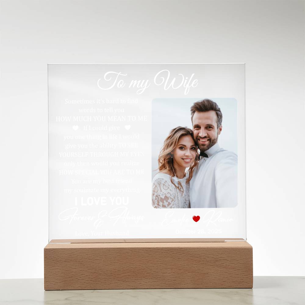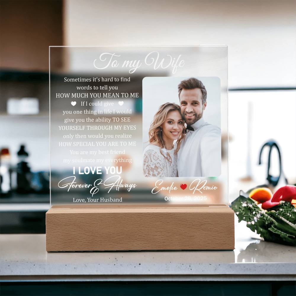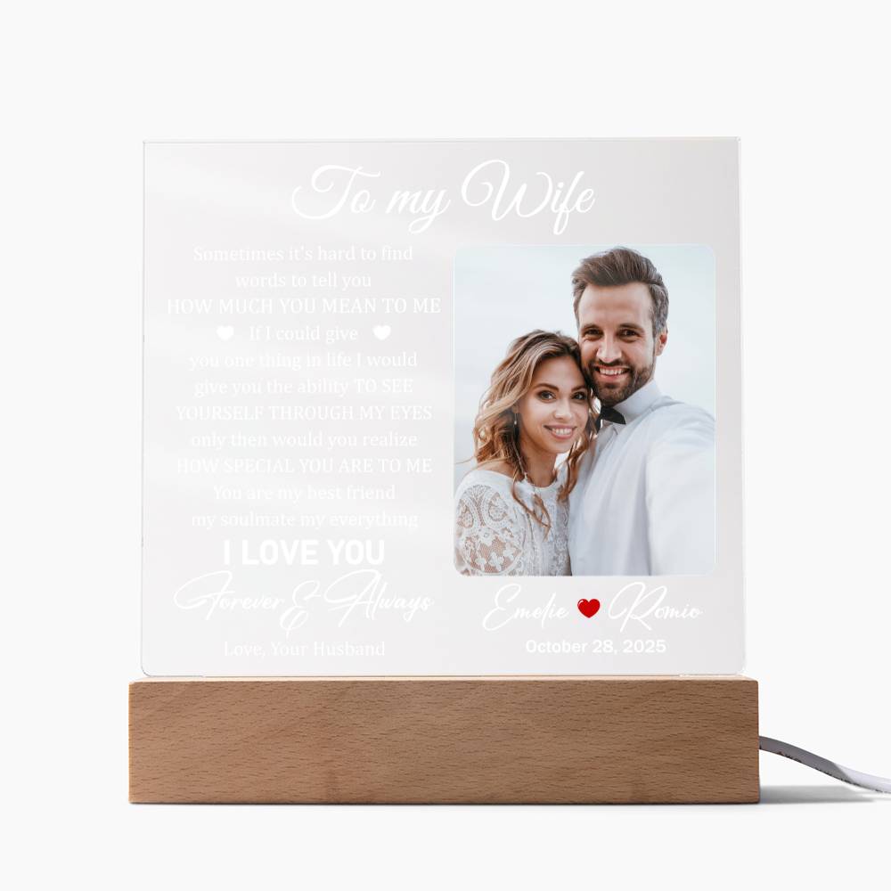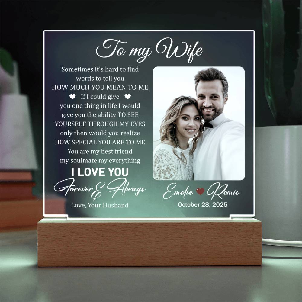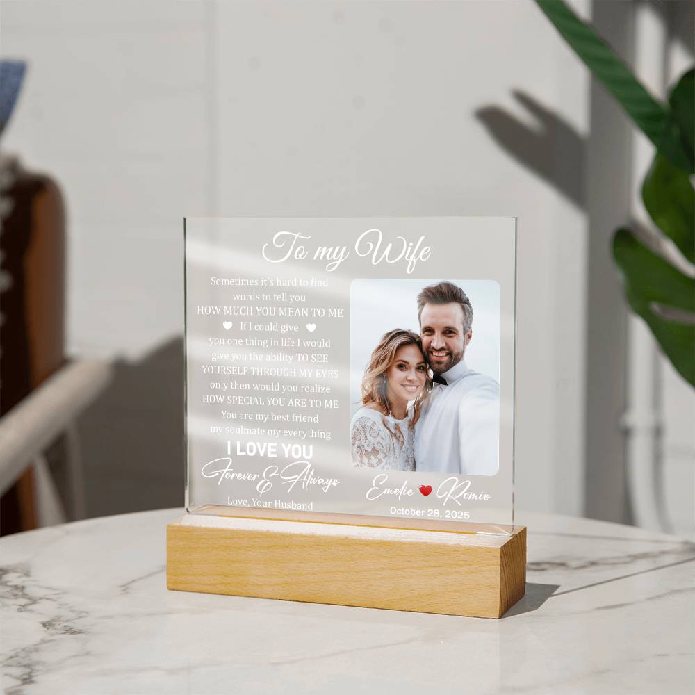 Your plaque will be crafted from premium acrylic with a professionally printed design for a polished look. It comes with a stylish wooden LED base, and you can choose between a USB plug-in option OR a cordless battery-operated option (requires 2 AAA batteries, not included). Both LED bases feature 7 vibrant colors, allowing the user to customize the lighting with various color changes and dynamic cycles.