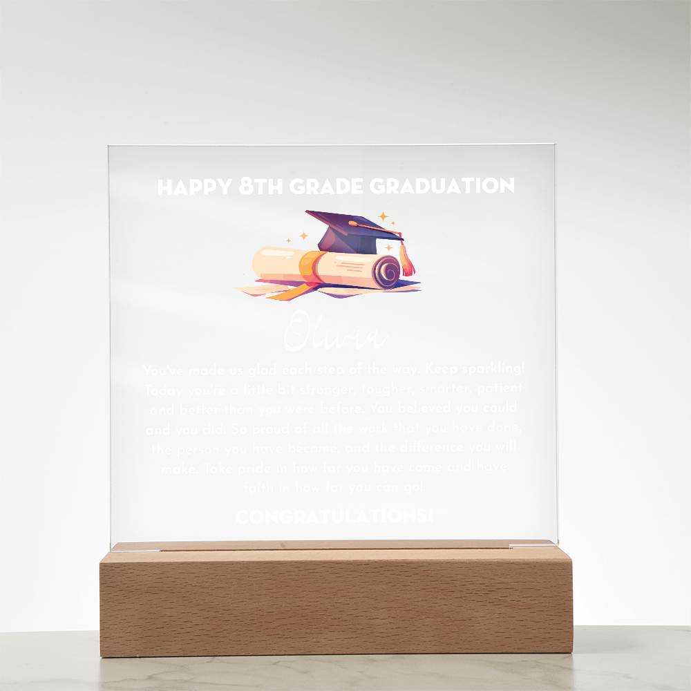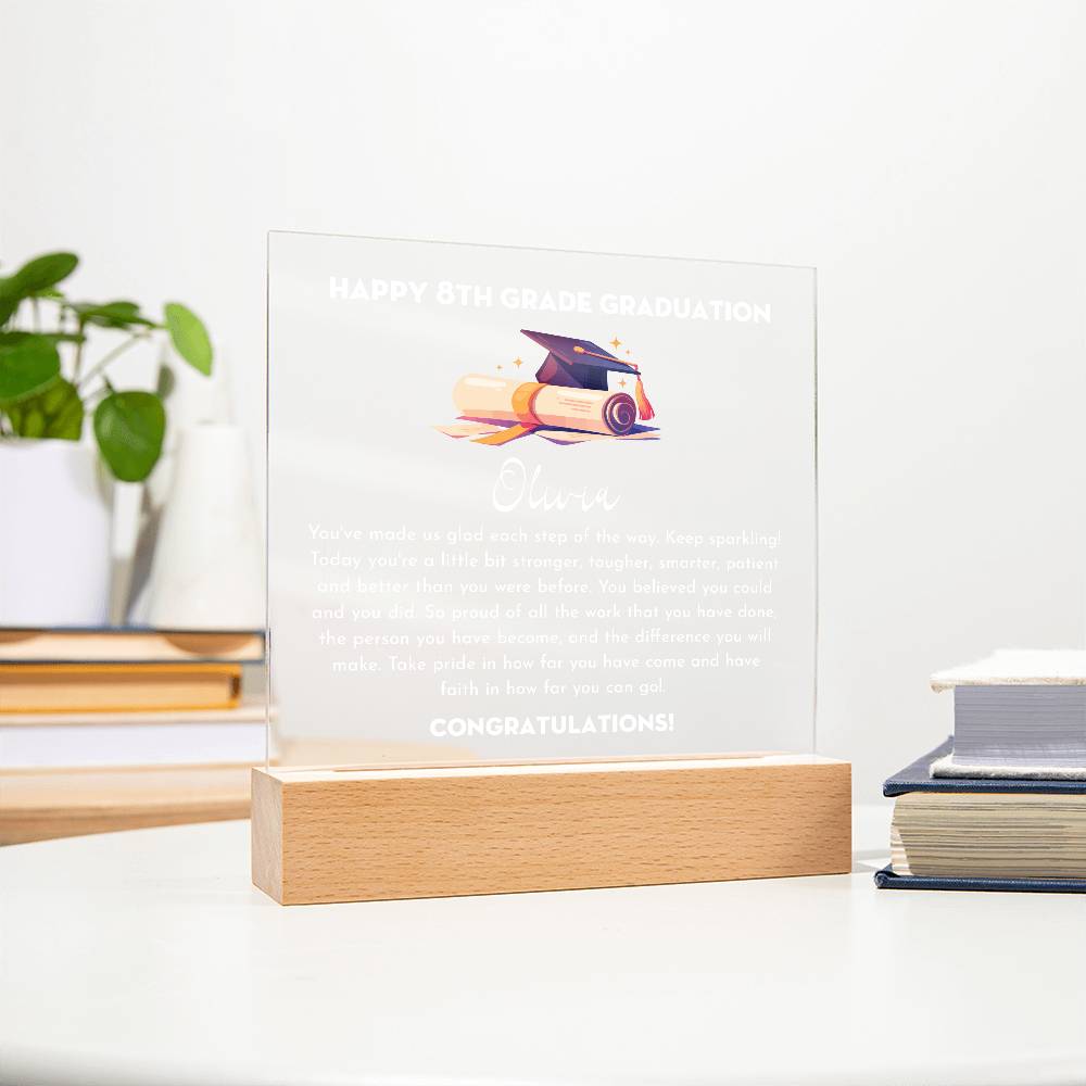 Your plaque will be crafted from premium acrylic with a professionally printed design for a polished look. It comes with a stylish wooden LED base, and you can choose between a USB plug-in option OR a cordless battery-operated option (requires 2 AAA batteries, not included). Both LED bases feature 7 vibrant colors, allowing the user to customize the lighting with various color changes and dynamic cycles.