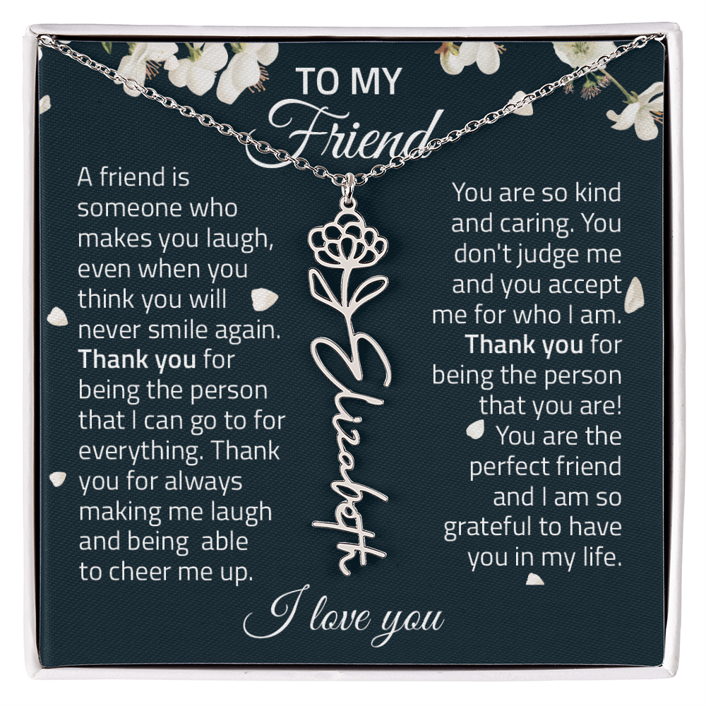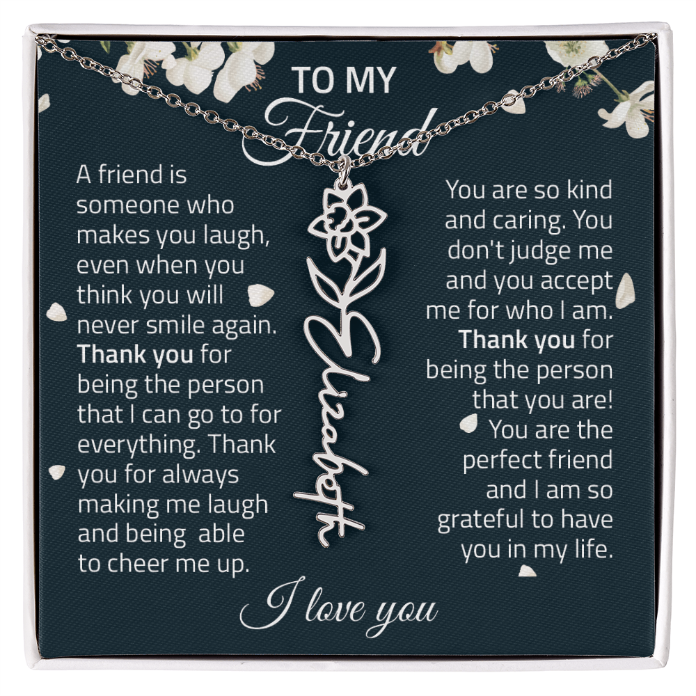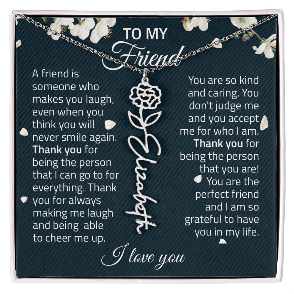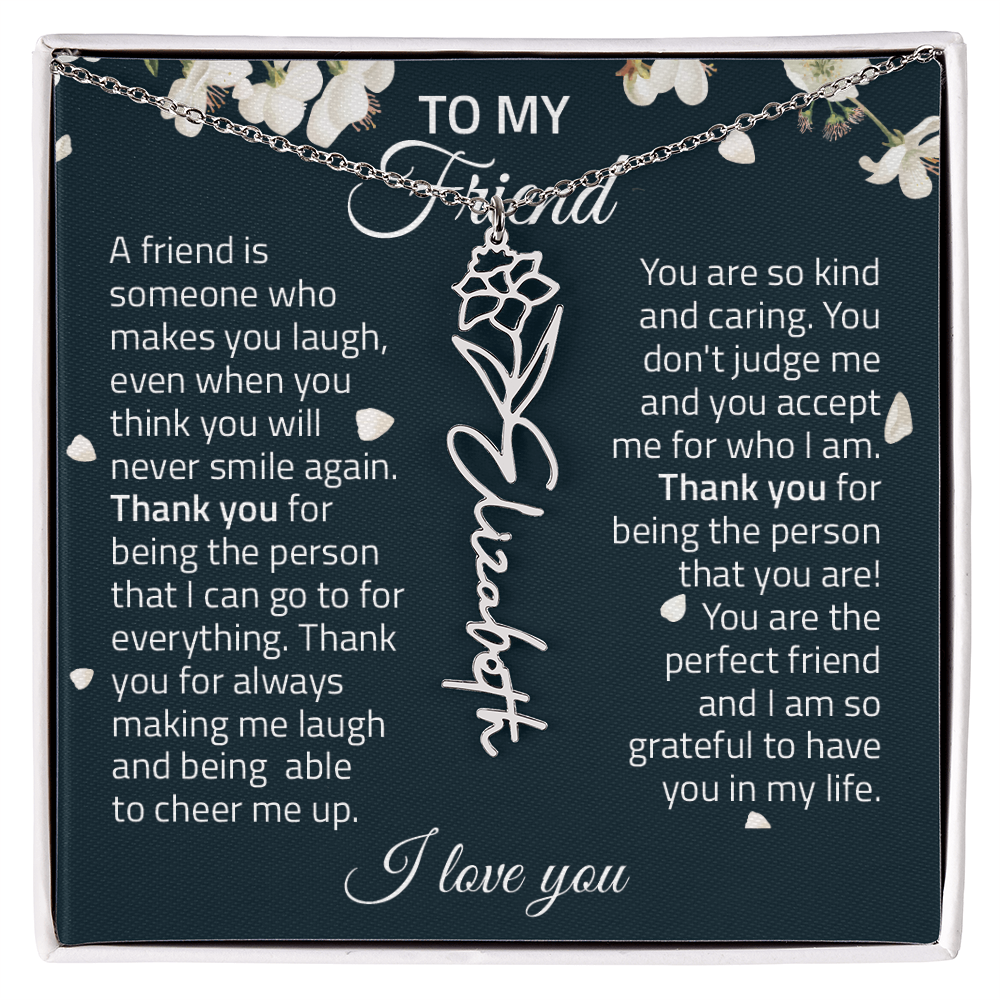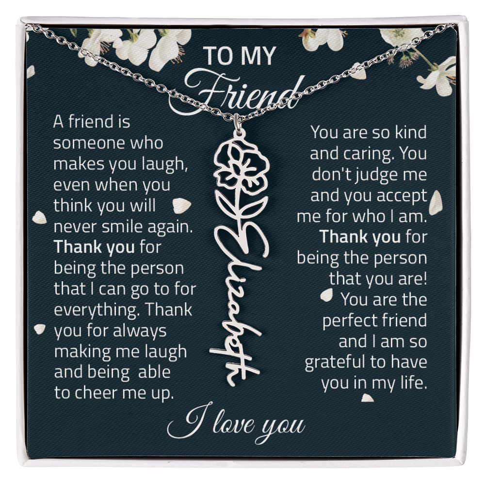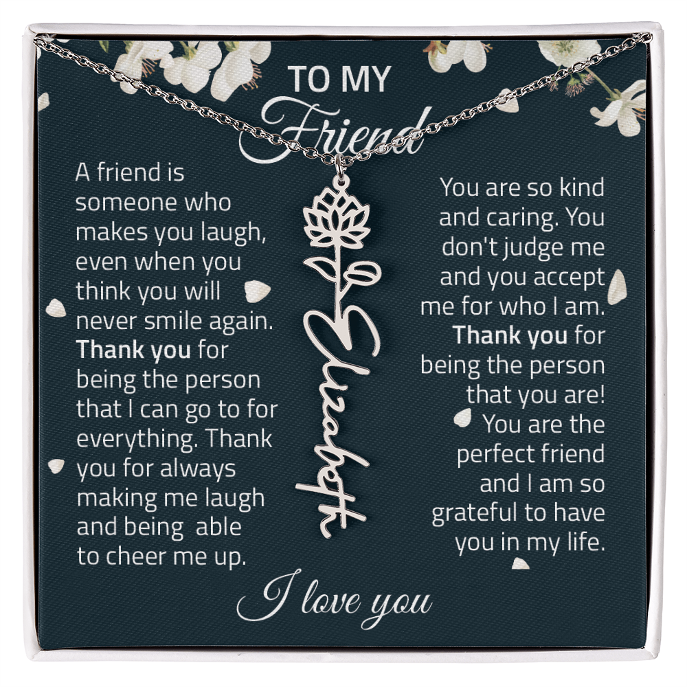 Need a gift that's as unique as she is? Then look no further than our Flower Name Necklace! With a customizable birth flower design, this necklace is a meaningful addition to any jewelry collection. Whether you're dressing up for a special occasion or simply want to add some flair to your everyday look, this necklace is perfect for your special someone. Handcrafted from high-quality materials, it is both stylish and durable. So why wait? Personalize your own floral name necklace today!