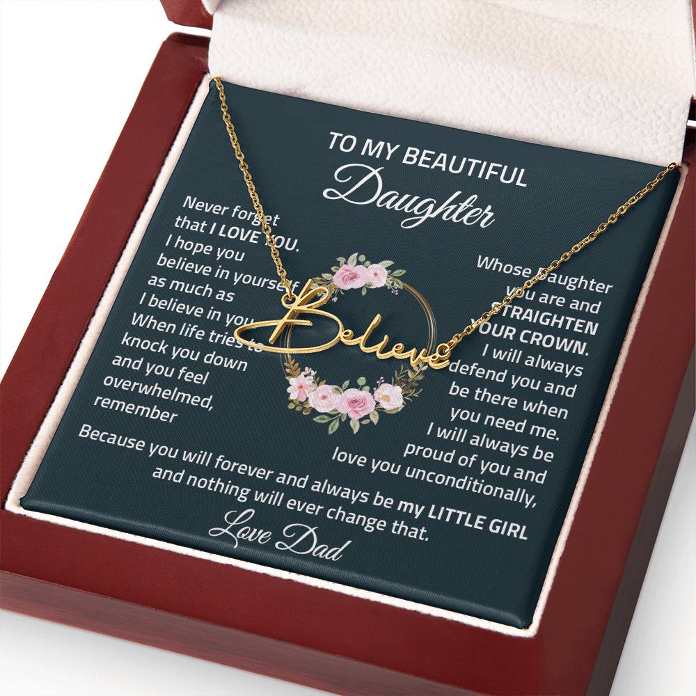 The Signature Style Name Necklace features a pretty stylized font, and is available in polished stainless steel or 18K yellow gold finish. The pendant is dually suspended on an adjustable 16”-18” cable chain for versatility. Your necklace will be custom made upon ordering in the name or word of your choice, with up to 10 characters. It's a gift that they will surely want to keep close to their heart!