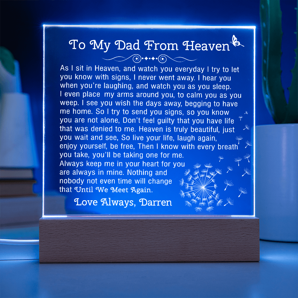 Your plaque will be crafted from premium acrylic with a professionally printed design for a polished look. It comes with a stylish wooden LED base, and you can choose between a USB plug-in option OR a cordless battery-operated option (requires 2 AAA batteries, not included). Both LED bases feature 7 vibrant colors, allowing the user to customize the lighting with various color changes and dynamic cycles.