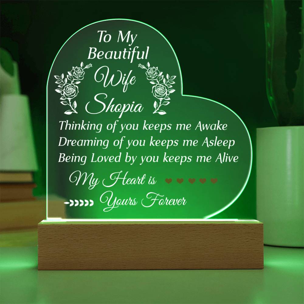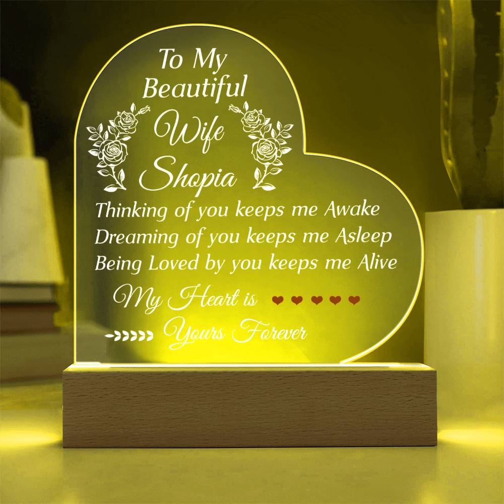 Your plaque will be crafted from premium acrylic with a professionally printed design for a polished look. It comes with a stylish wooden LED base, and you can choose between a USB plug-in option OR a cordless battery-operated option (requires 2 AAA batteries, not included). Both LED bases feature 7 vibrant colors, allowing the user to customize the lighting with various color changes and dynamic cycles.