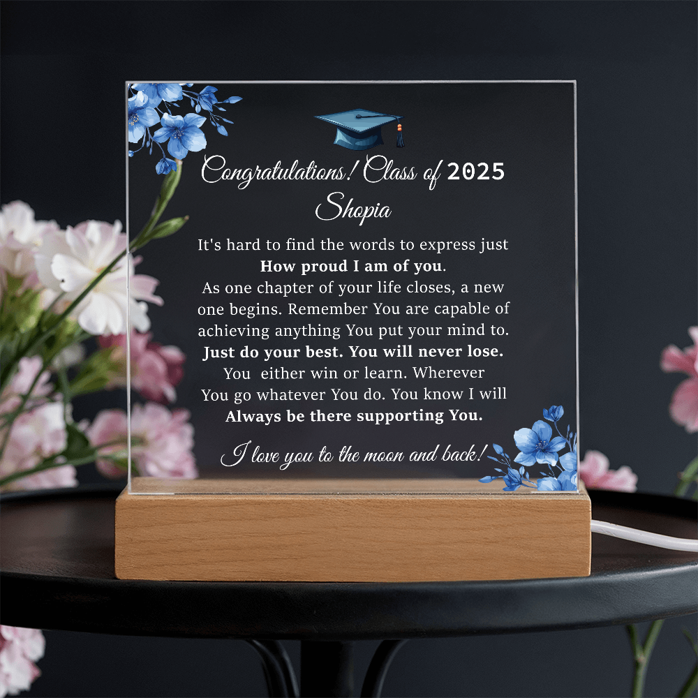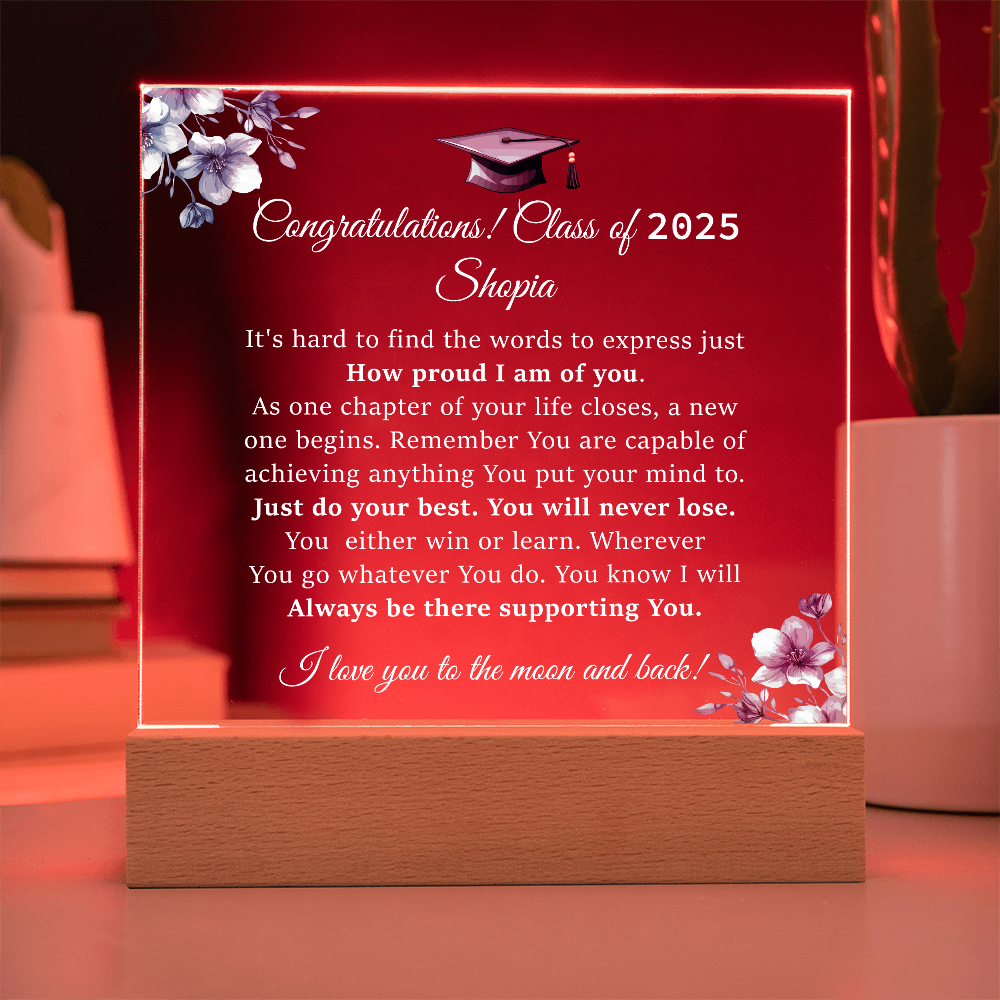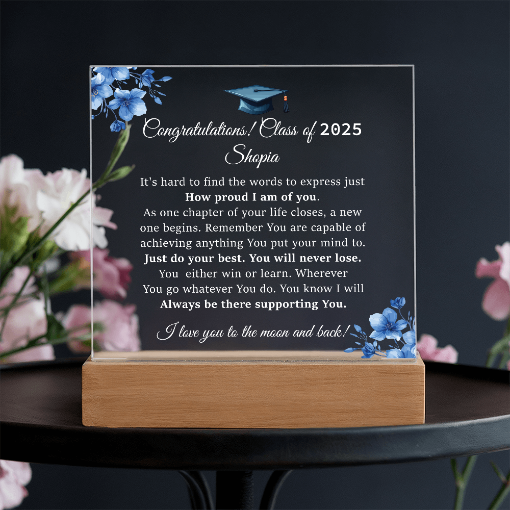 Your plaque will be crafted from premium acrylic with a professionally printed design for a polished look. It comes with a stylish wooden LED base, and you can choose between a USB plug-in option OR a cordless battery-operated option (requires 2 AAA batteries, not included). Both LED bases feature 7 vibrant colors, allowing the user to customize the lighting with various color changes and dynamic cycles.