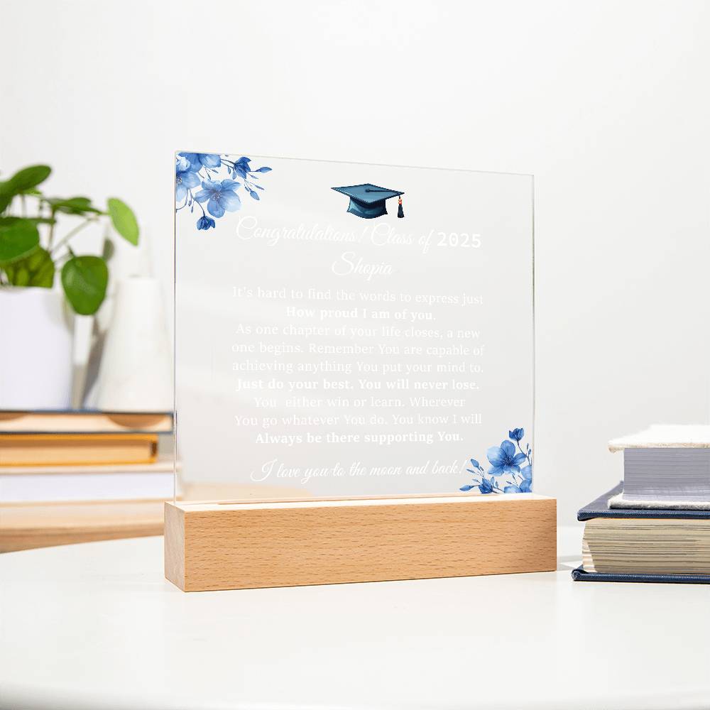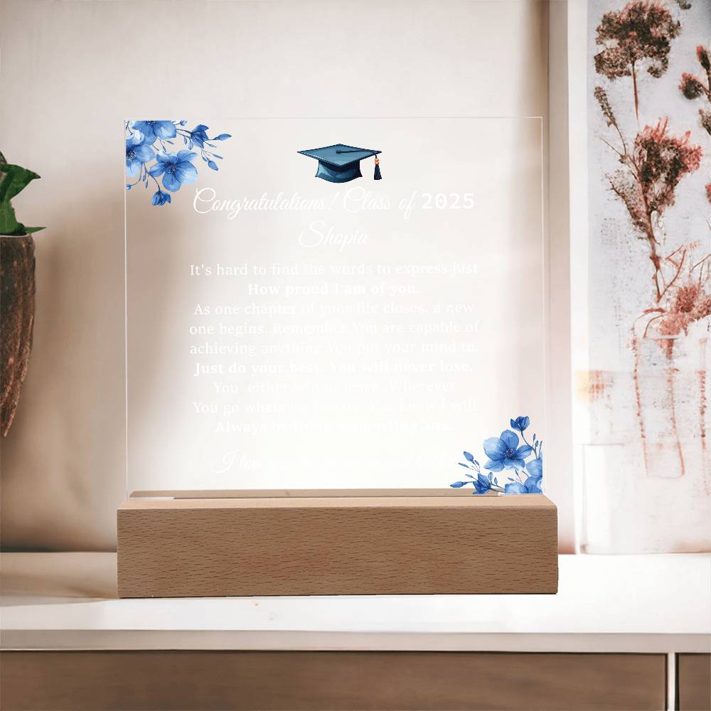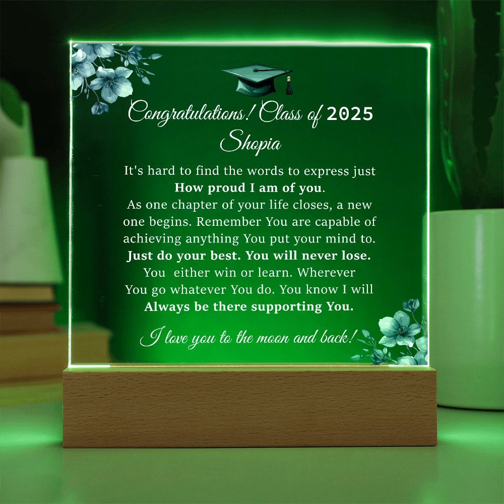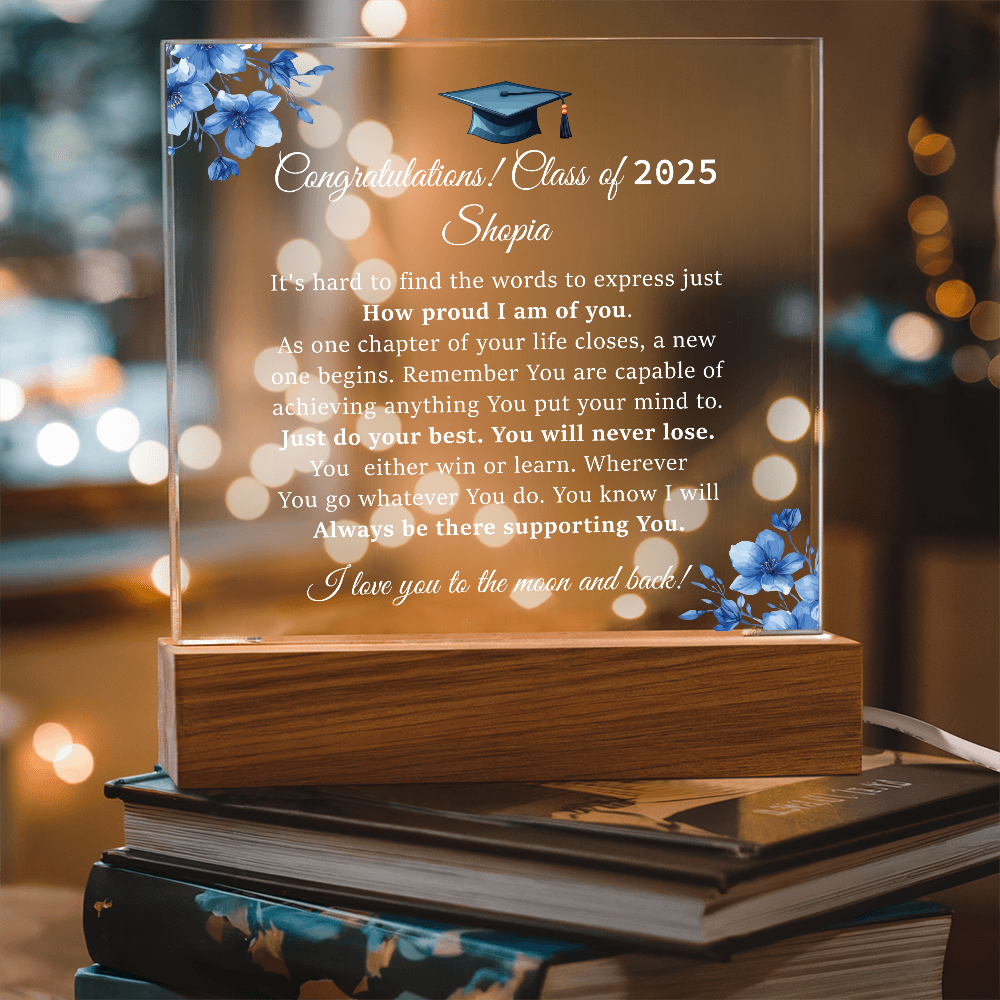 Your plaque will be crafted from premium acrylic with a professionally printed design for a polished look. It comes with a stylish wooden LED base, and you can choose between a USB plug-in option OR a cordless battery-operated option (requires 2 AAA batteries, not included). Both LED bases feature 7 vibrant colors, allowing the user to customize the lighting with various color changes and dynamic cycles.