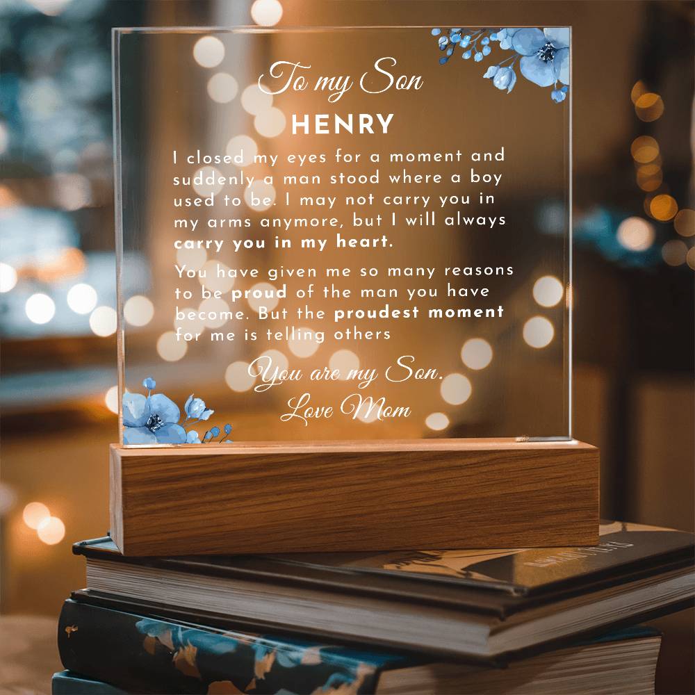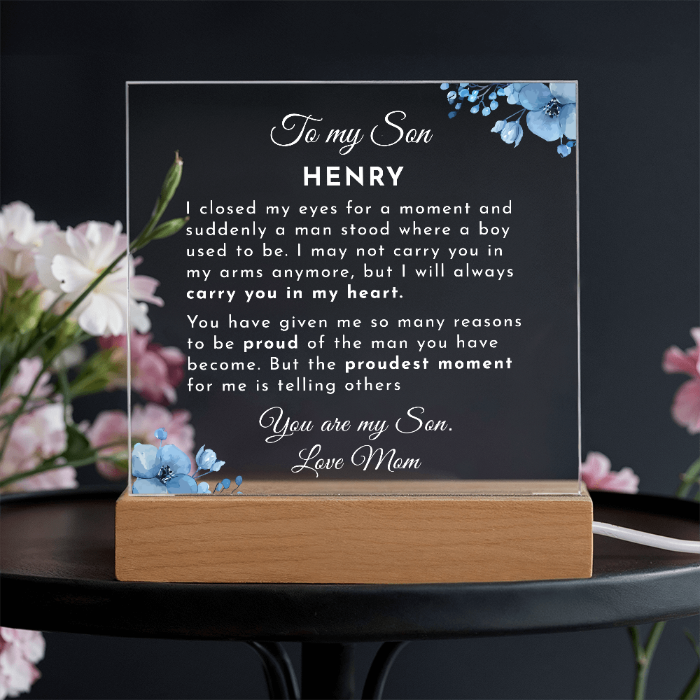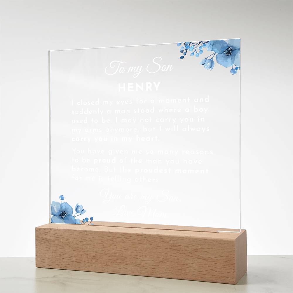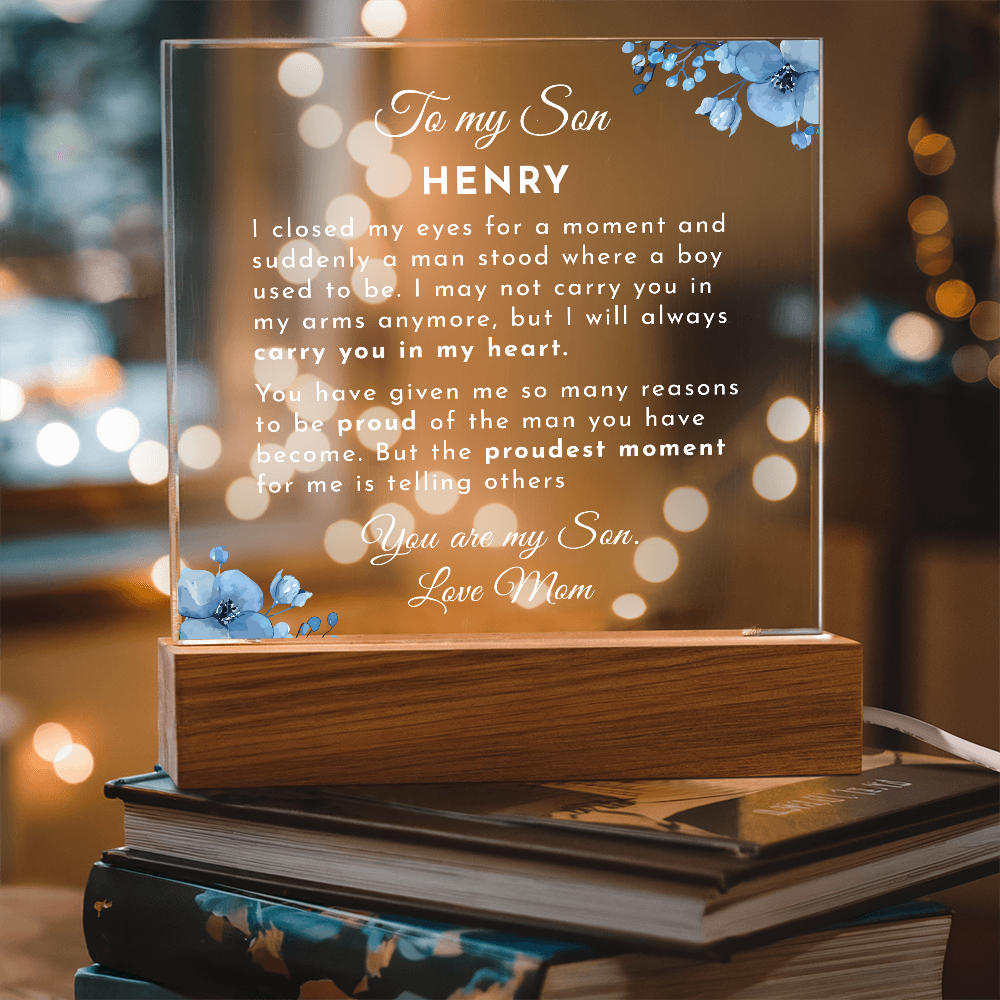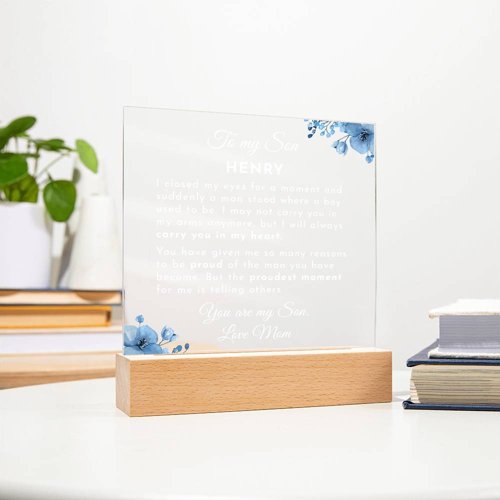 Your plaque will be crafted from premium acrylic with a professionally printed design for a polished look. It comes with a stylish wooden LED base, and you can choose between a USB plug-in option OR a cordless battery-operated option (requires 2 AAA batteries, not included). Both LED bases feature 7 vibrant colors, allowing the user to customize the lighting with various color changes and dynamic cycles.