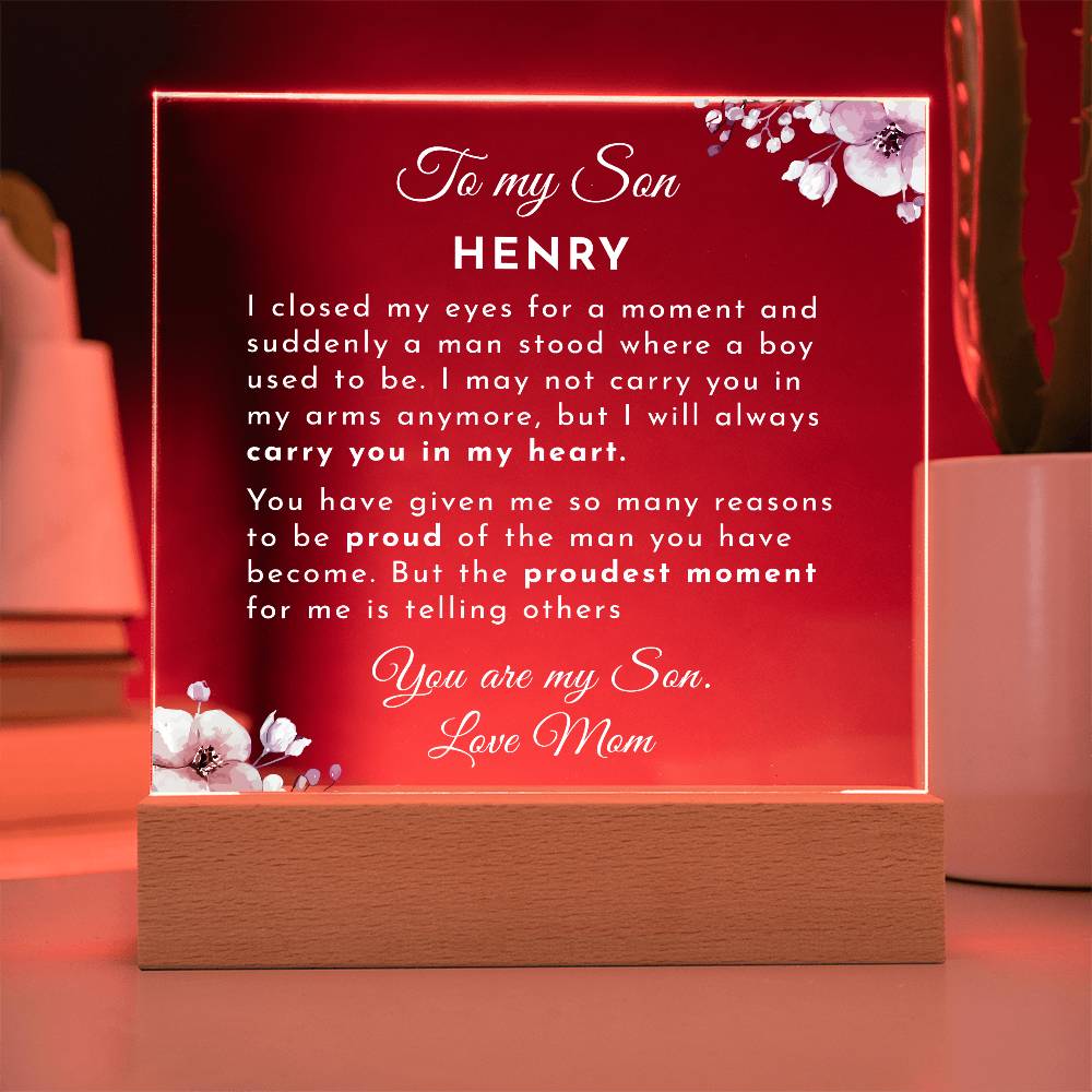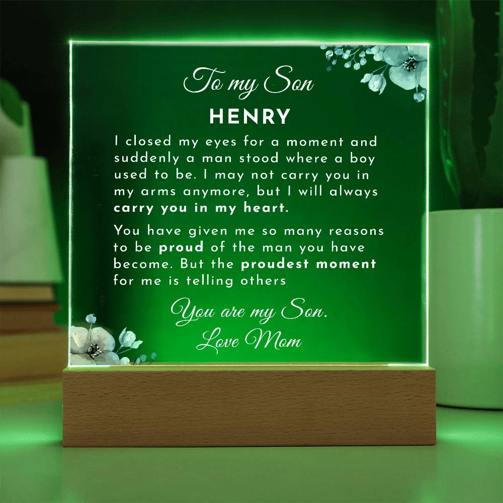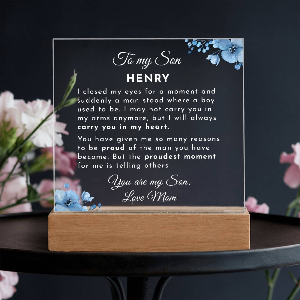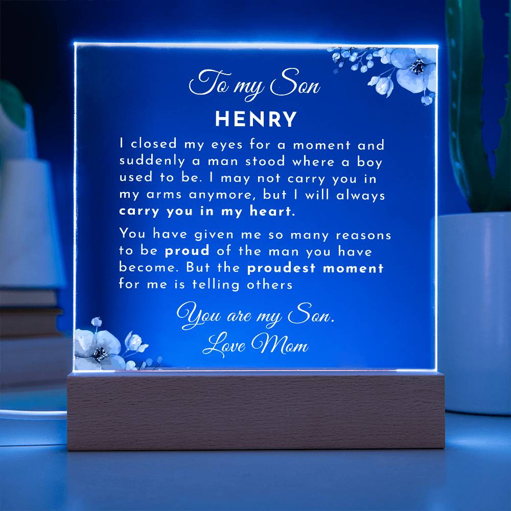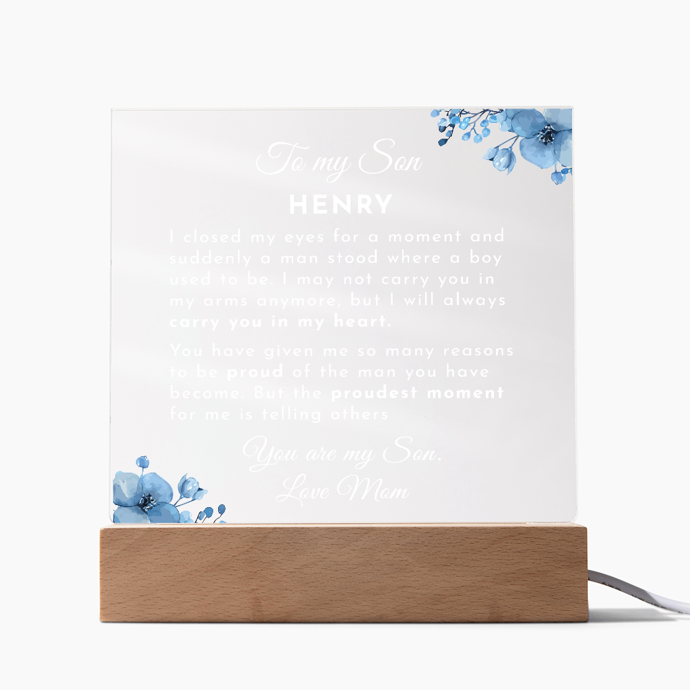 Your plaque will be crafted from premium acrylic with a professionally printed design for a polished look. It comes with a stylish wooden LED base, and you can choose between a USB plug-in option OR a cordless battery-operated option (requires 2 AAA batteries, not included). Both LED bases feature 7 vibrant colors, allowing the user to customize the lighting with various color changes and dynamic cycles.
