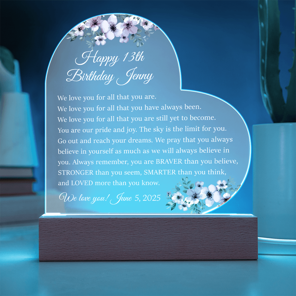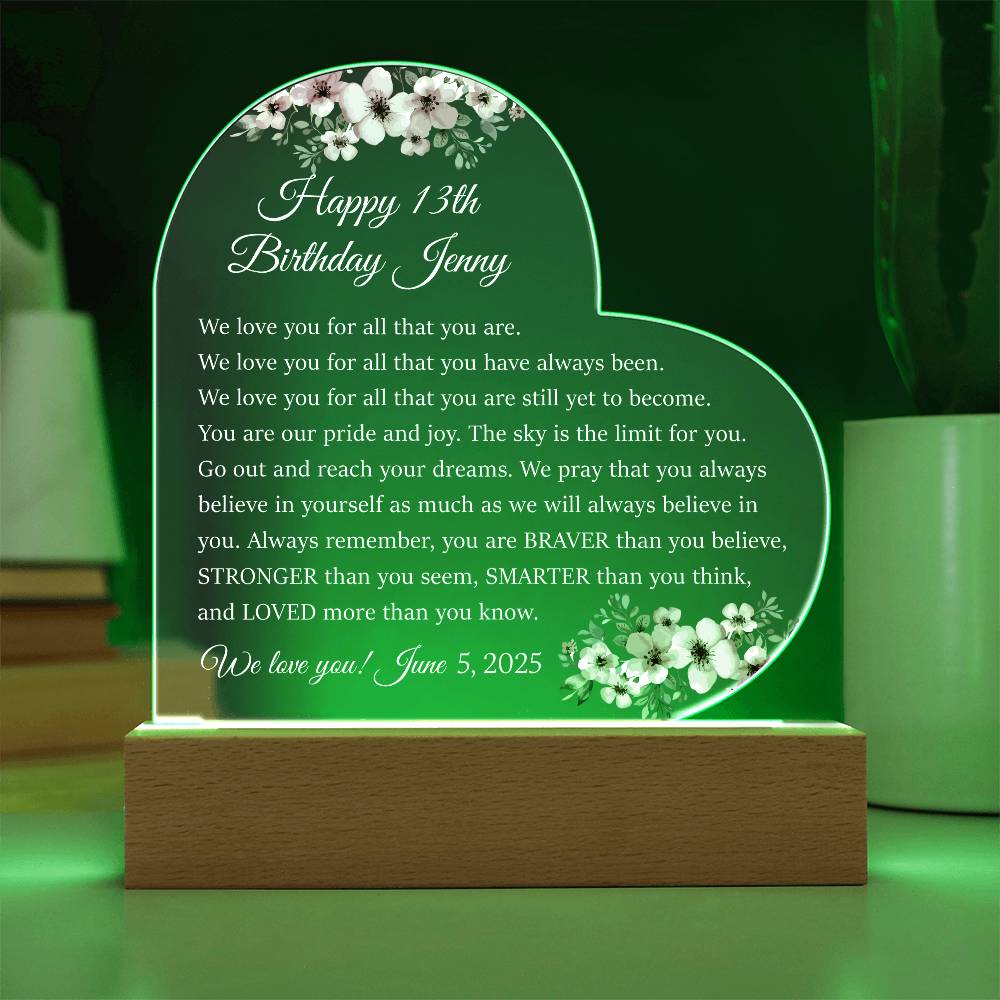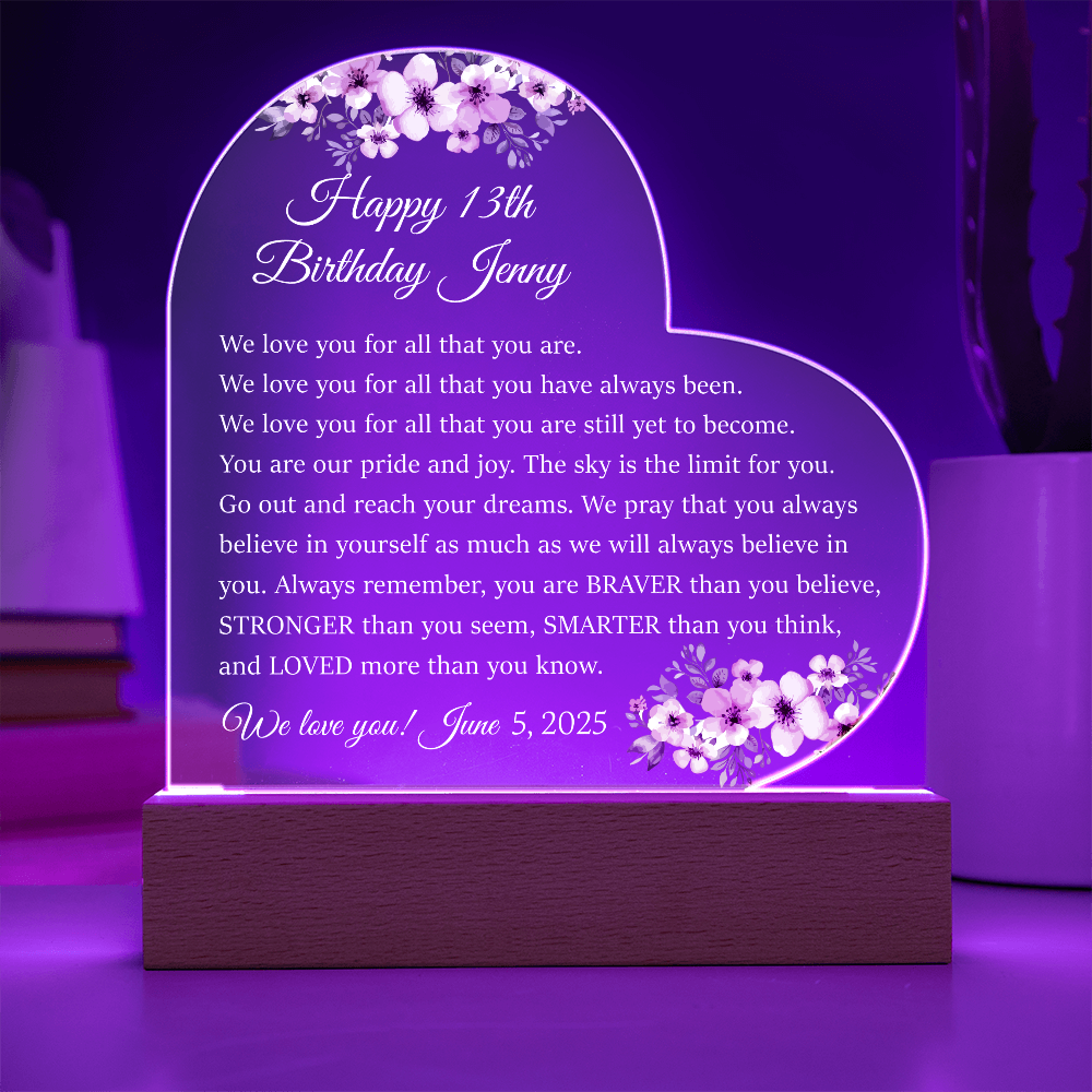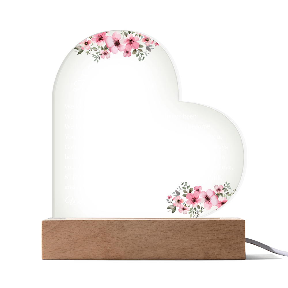 Your plaque will be crafted from premium acrylic with a professionally printed design for a polished look. It comes with a stylish wooden LED base, and you can choose between a USB plug-in option OR a cordless battery-operated option (requires 2 AAA batteries, not included). Both LED bases feature 7 vibrant colors, allowing the user to customize the lighting with various color changes and dynamic cycles.