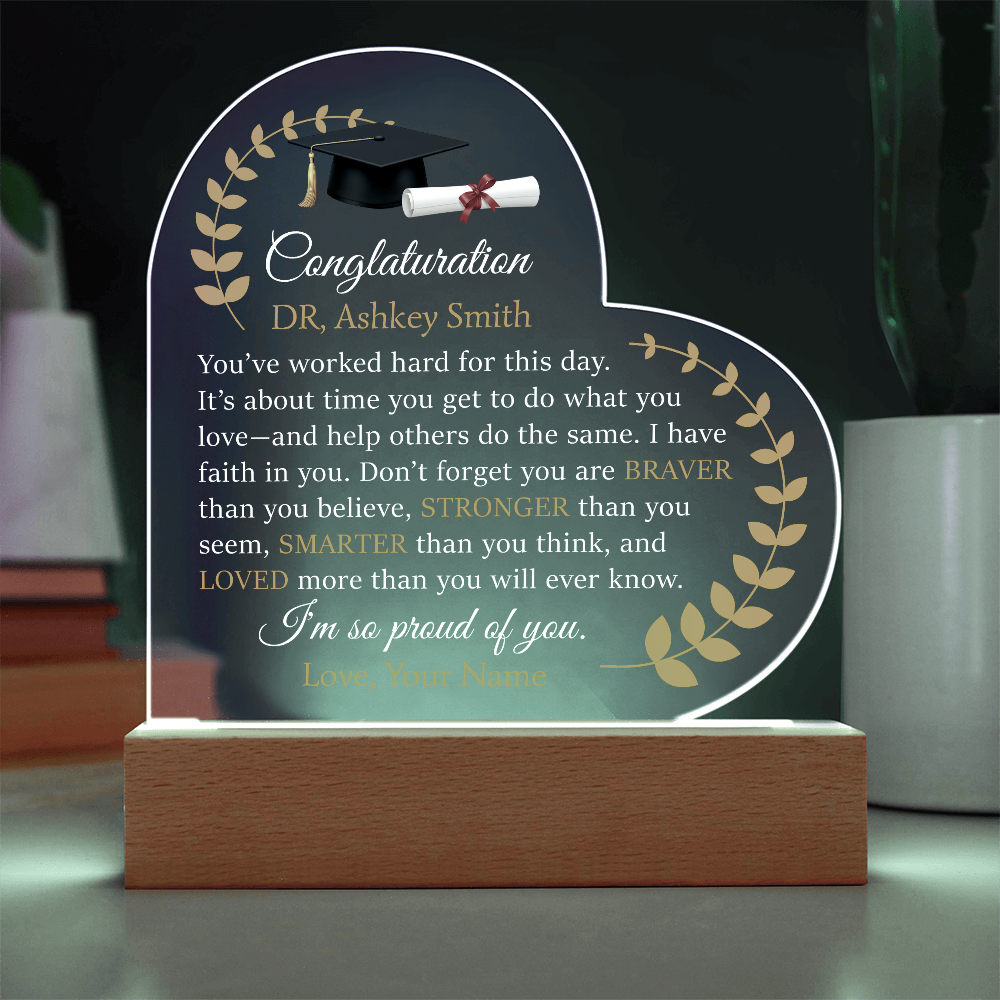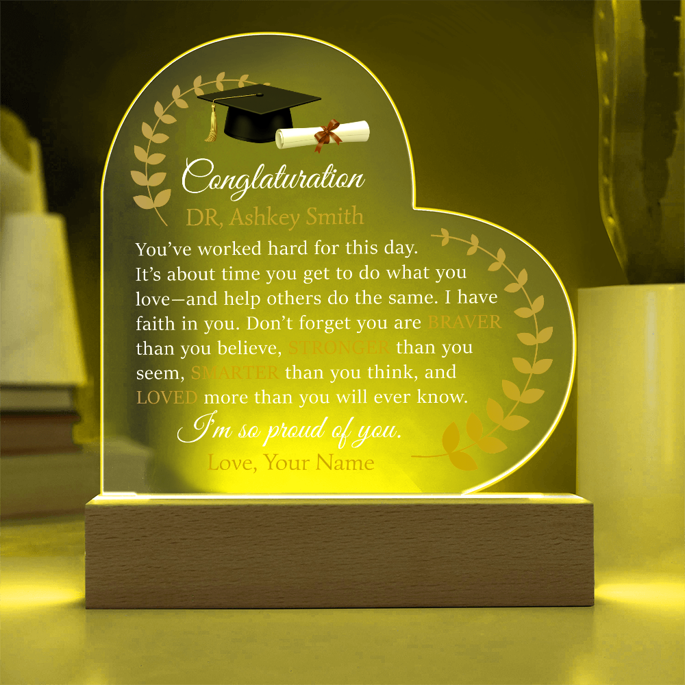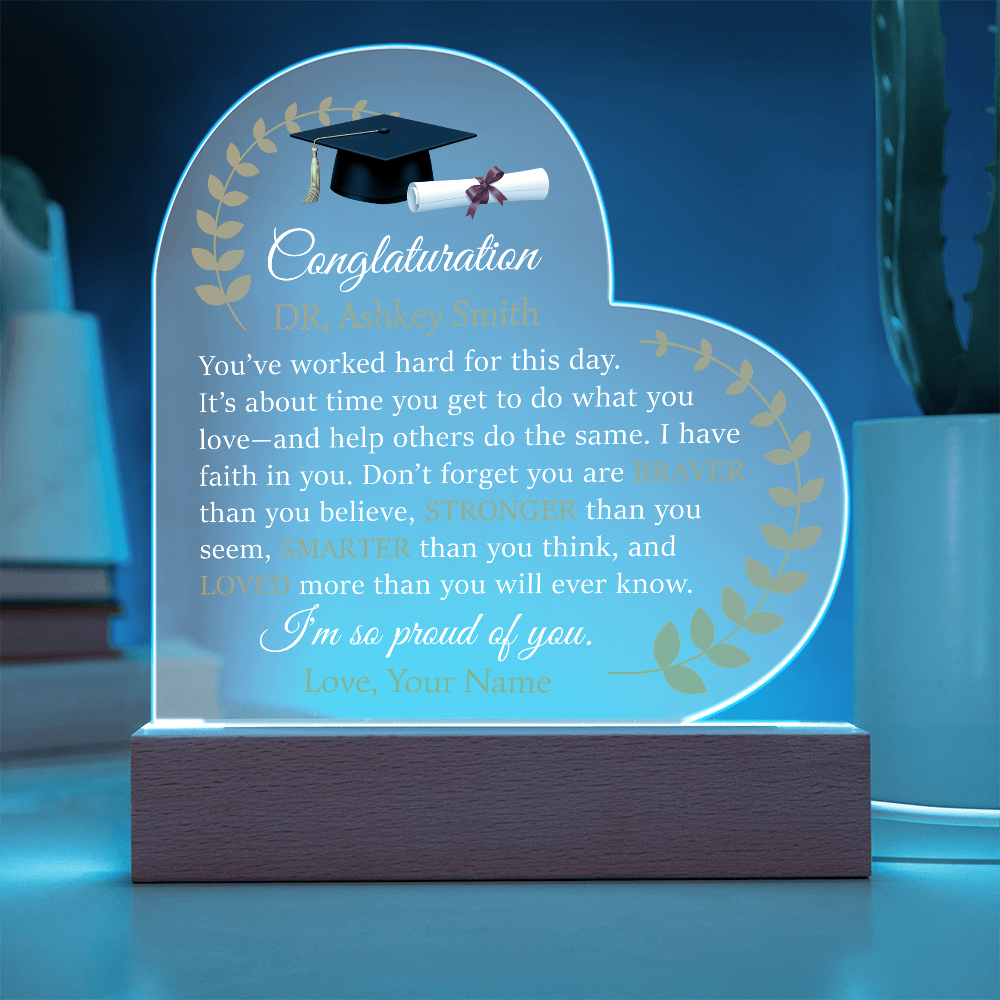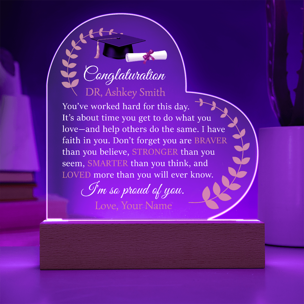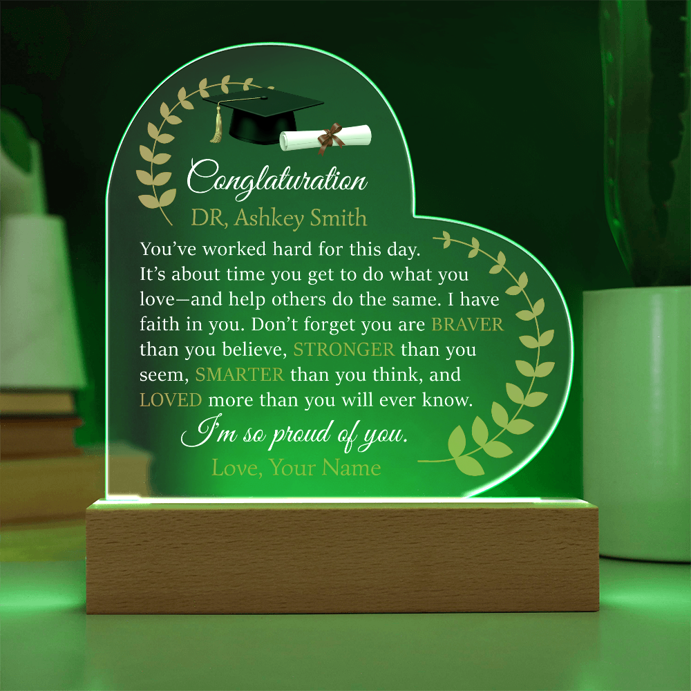 Your plaque will be crafted from premium acrylic with a professionally printed design for a polished look. It comes with a stylish wooden LED base, and you can choose between a USB plug-in option OR a cordless battery-operated option (requires 2 AAA batteries, not included). Both LED bases feature 7 vibrant colors, allowing the user to customize the lighting with various color changes and dynamic cycles.