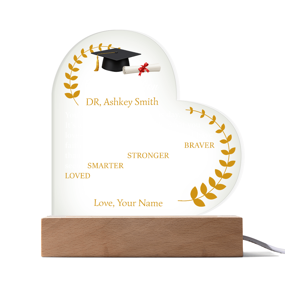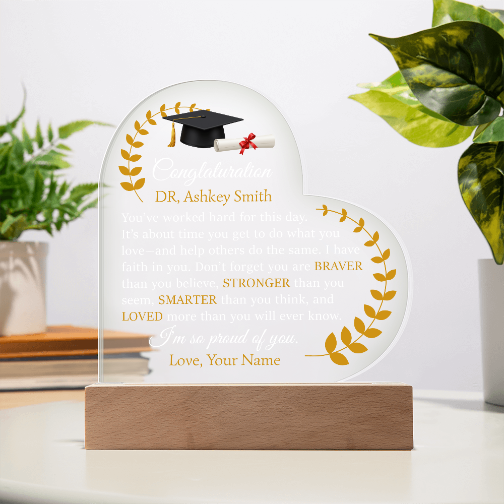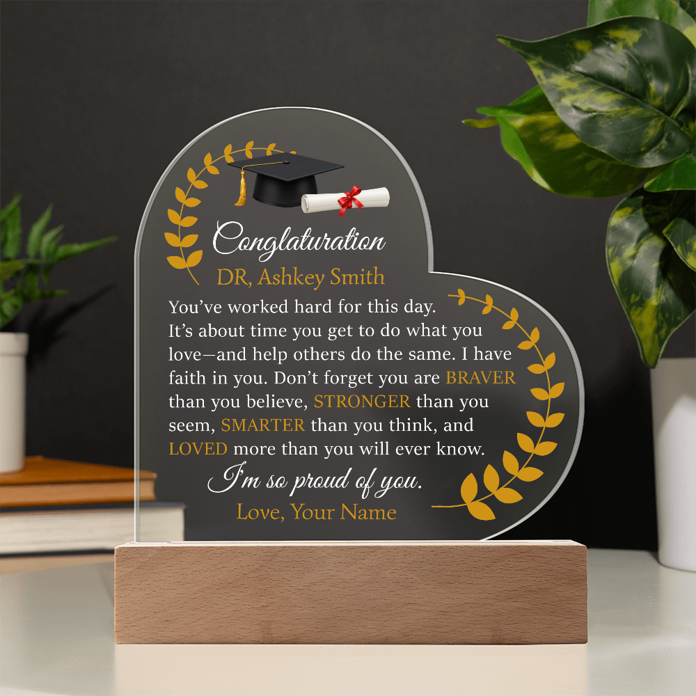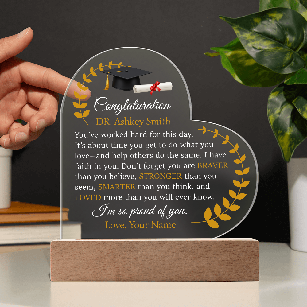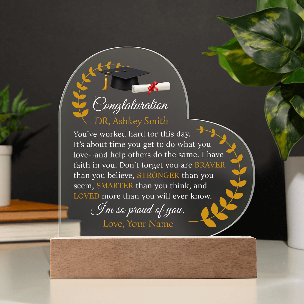 Your plaque will be crafted from premium acrylic with a professionally printed design for a polished look. It comes with a stylish wooden LED base, and you can choose between a USB plug-in option OR a cordless battery-operated option (requires 2 AAA batteries, not included). Both LED bases feature 7 vibrant colors, allowing the user to customize the lighting with various color changes and dynamic cycles.