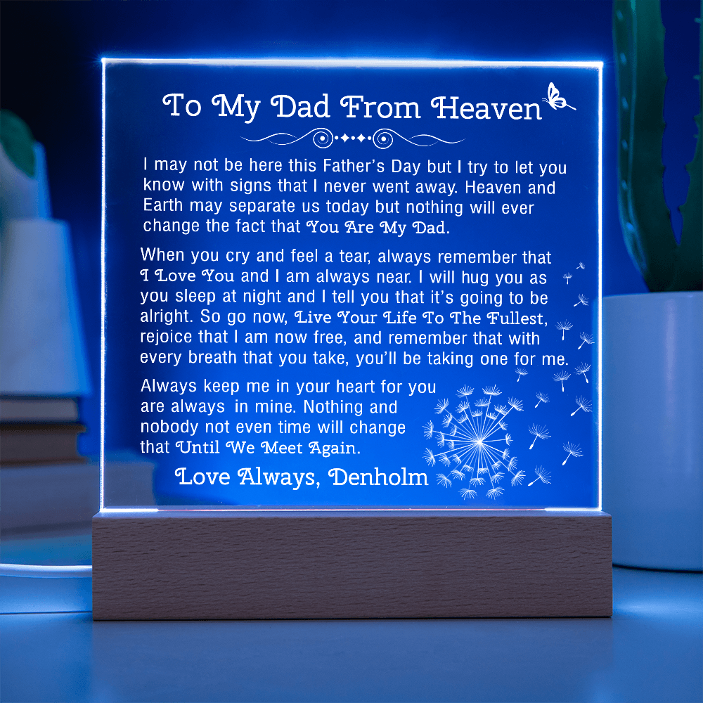 Your plaque will be crafted from premium acrylic with a professionally printed design for a polished look. It comes with a stylish wooden LED base, and you can choose between a USB plug-in option OR a cordless battery-operated option (requires 2 AAA batteries, not included). Both LED bases feature 7 vibrant colors, allowing the user to customize the lighting with various color changes and dynamic cycles.