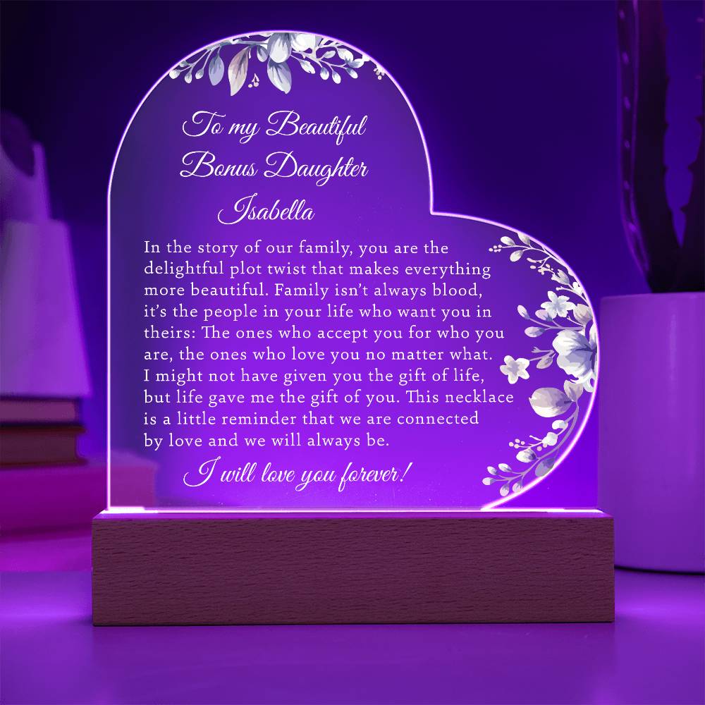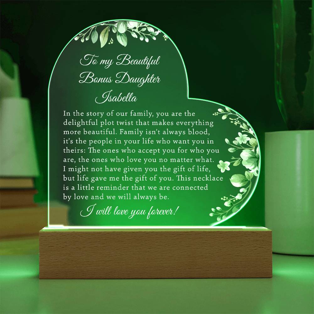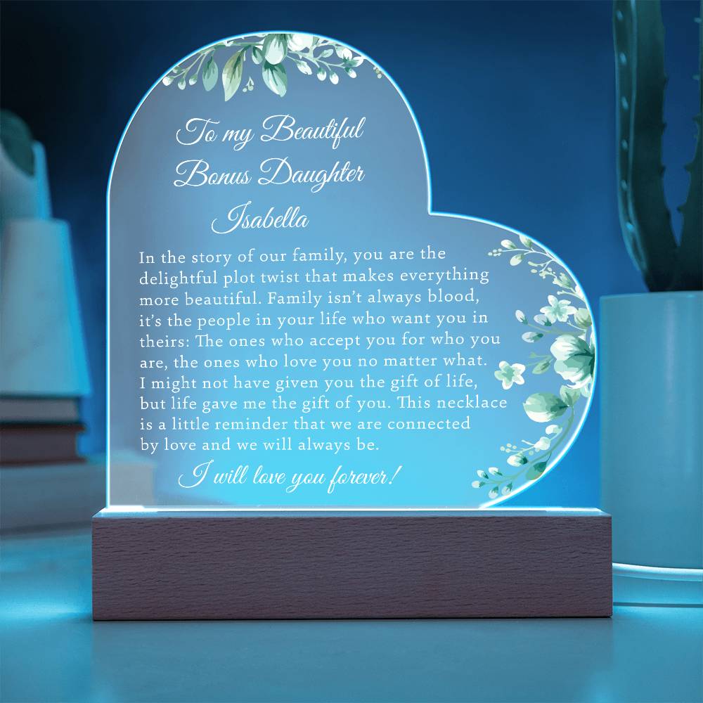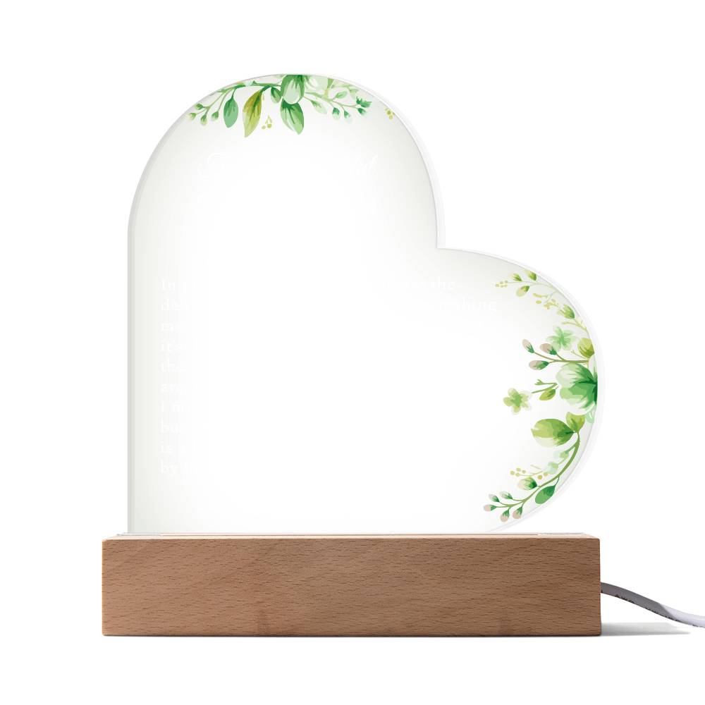 Your plaque will be crafted from premium acrylic with a professionally printed design for a polished look. It comes with a stylish wooden LED base, and you can choose between a USB plug-in option OR a cordless battery-operated option (requires 2 AAA batteries, not included). Both LED bases feature 7 vibrant colors, allowing the user to customize the lighting with various color changes and dynamic cycles.