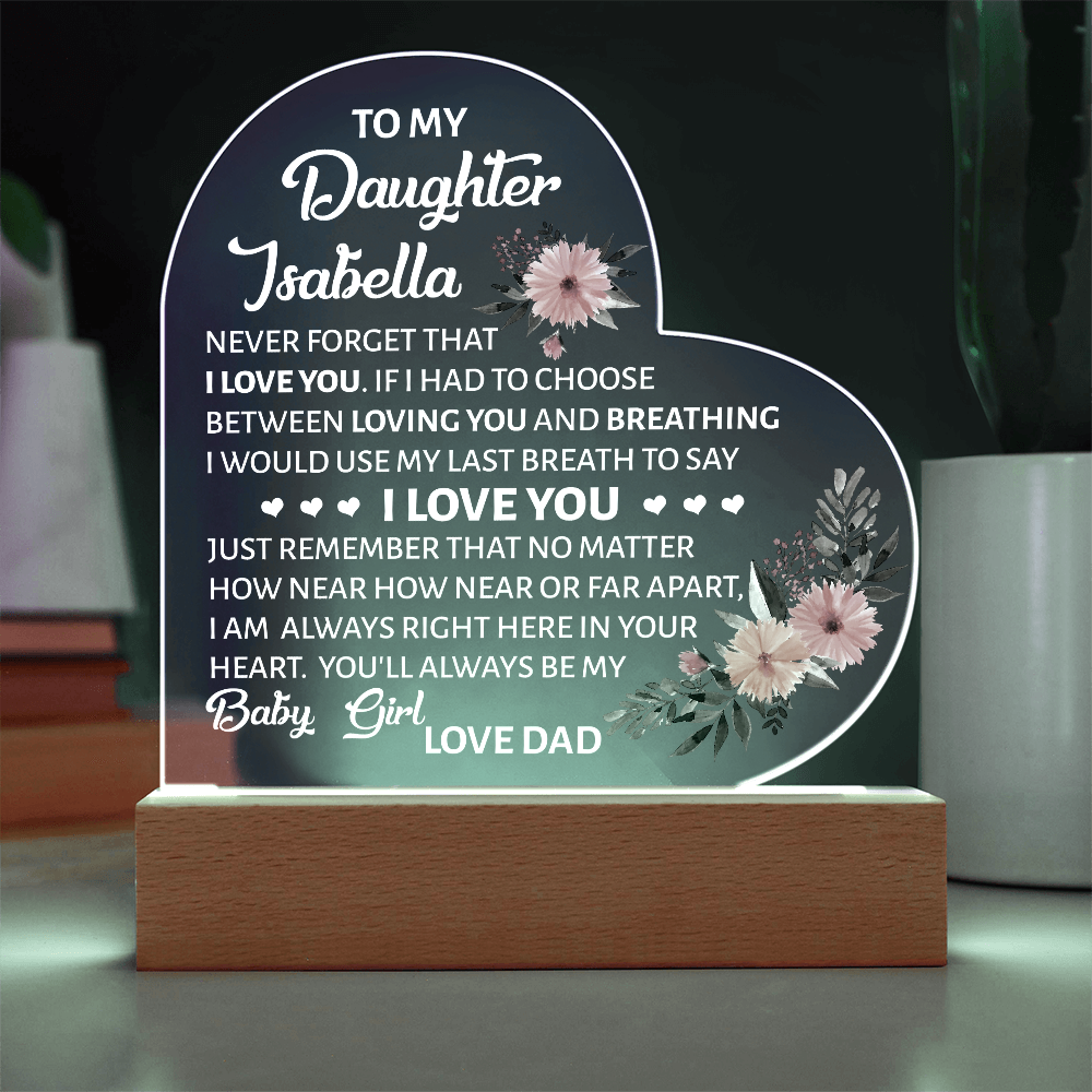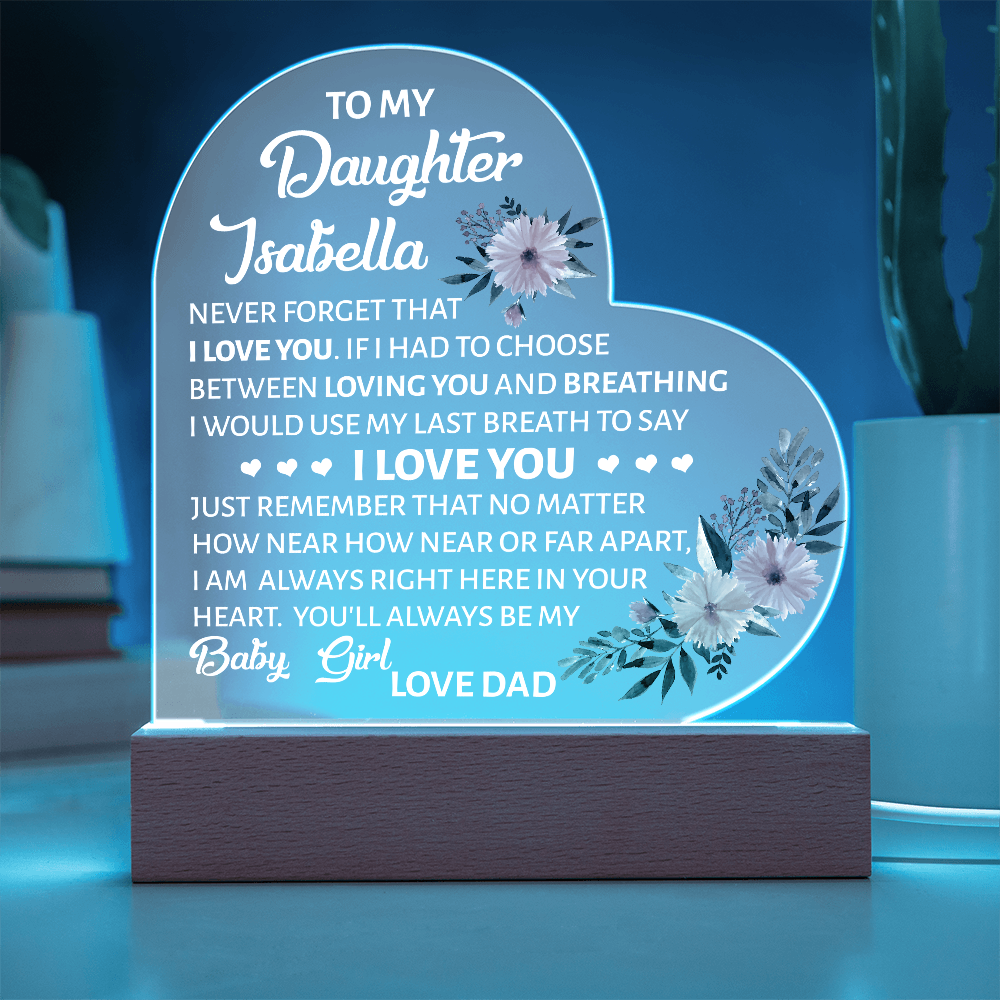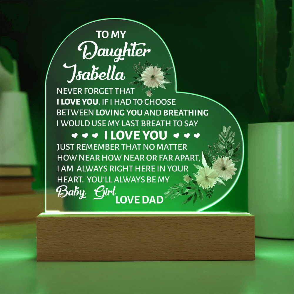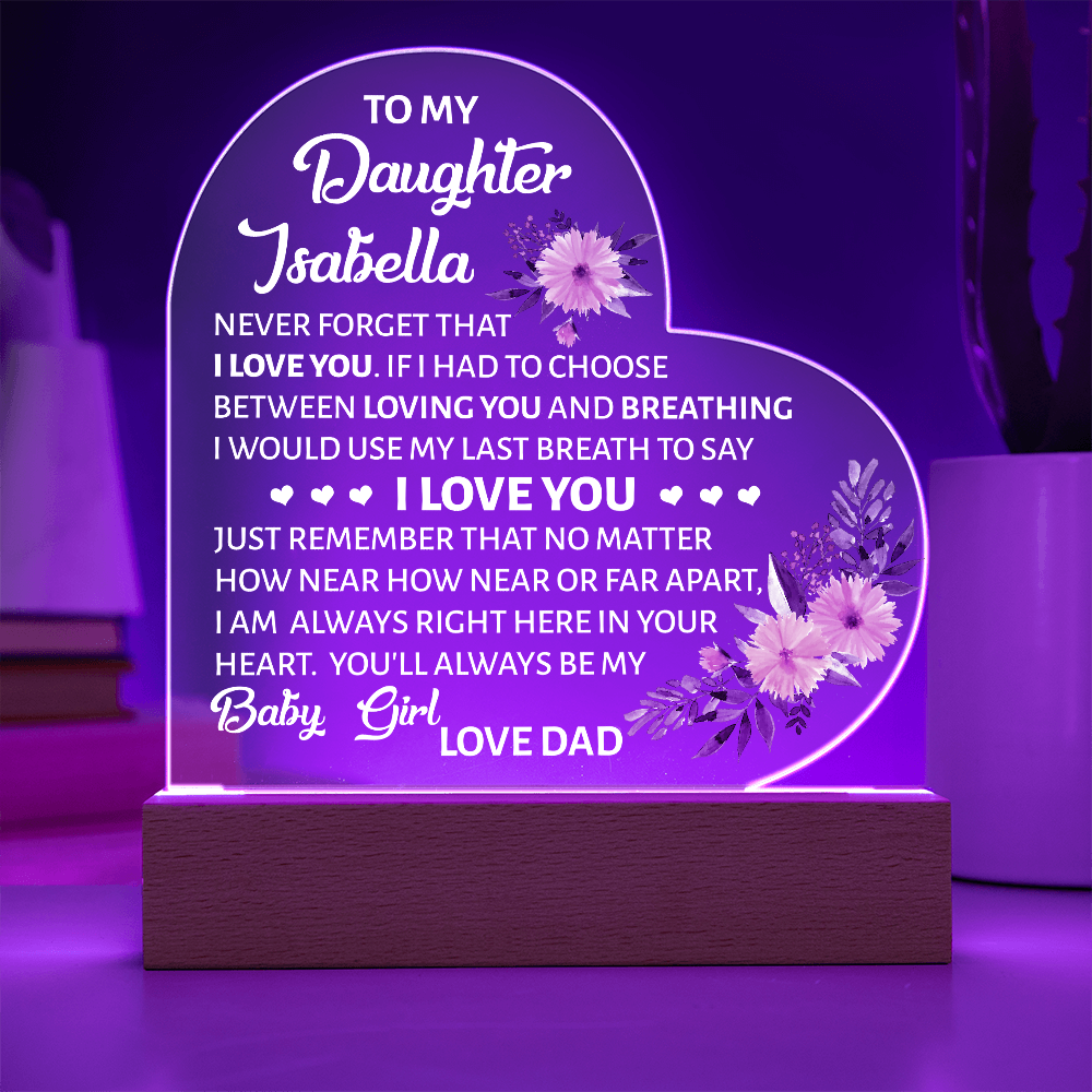 Your plaque will be crafted from premium acrylic with a professionally printed design for a polished look. It comes with a stylish wooden LED base, and you can choose between a USB plug-in option OR a cordless battery-operated option (requires 2 AAA batteries, not included). Both LED bases feature 7 vibrant colors, allowing the user to customize the lighting with various color changes and dynamic cycles.