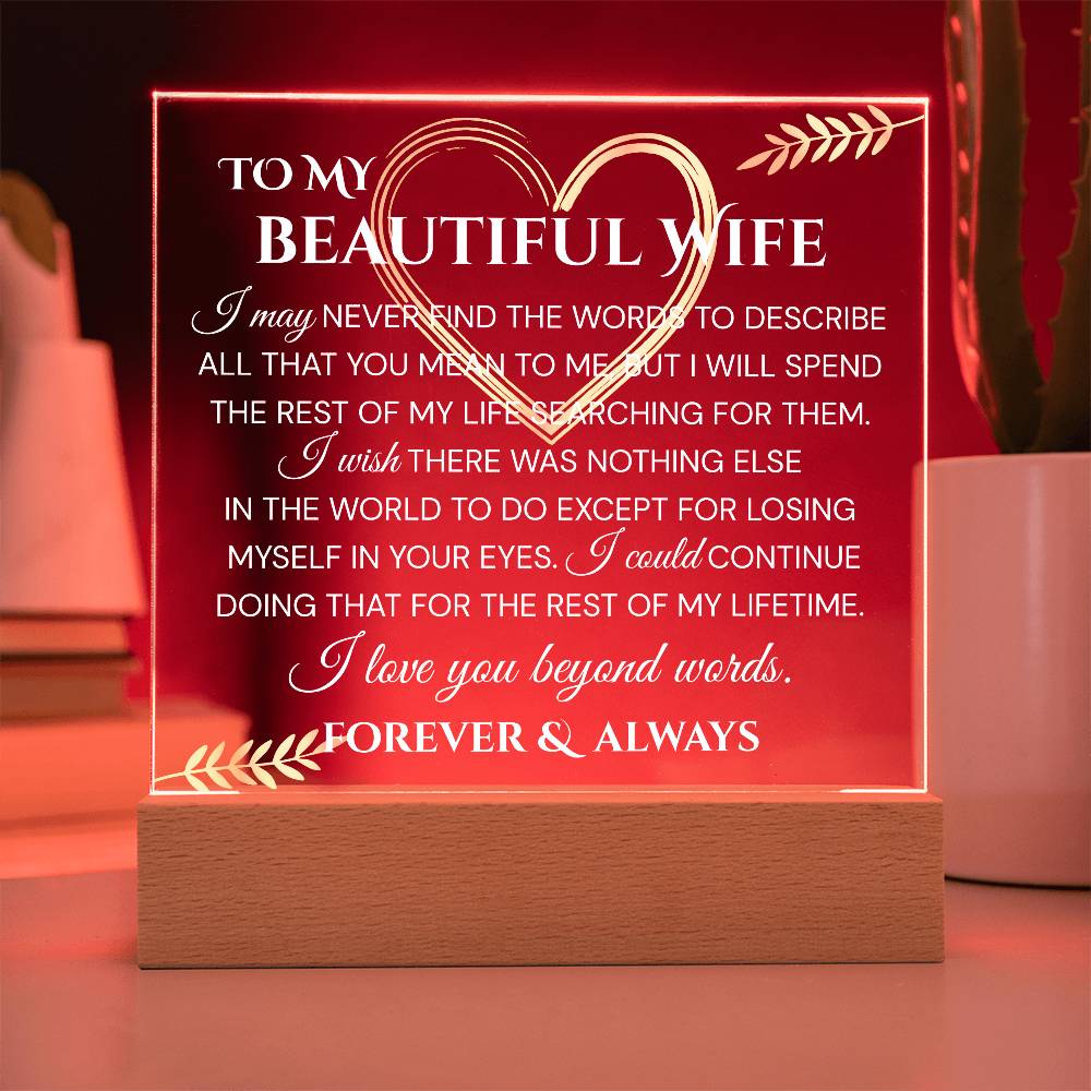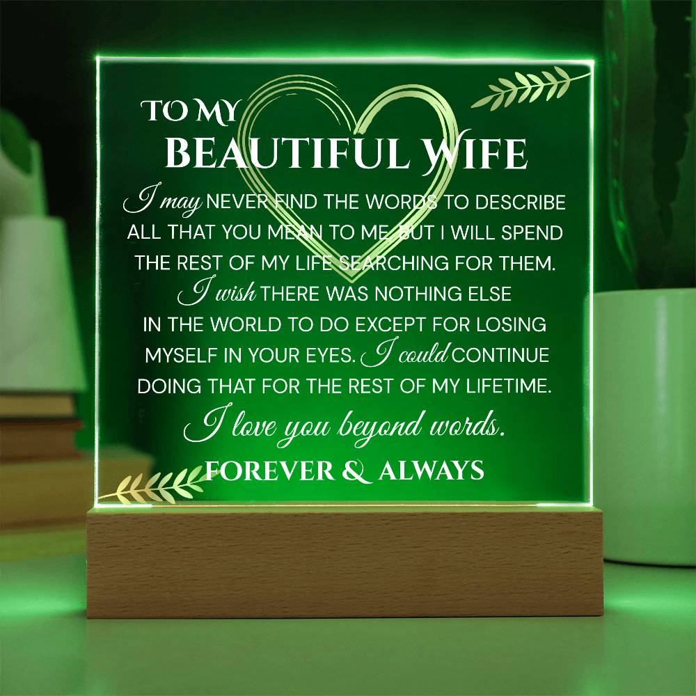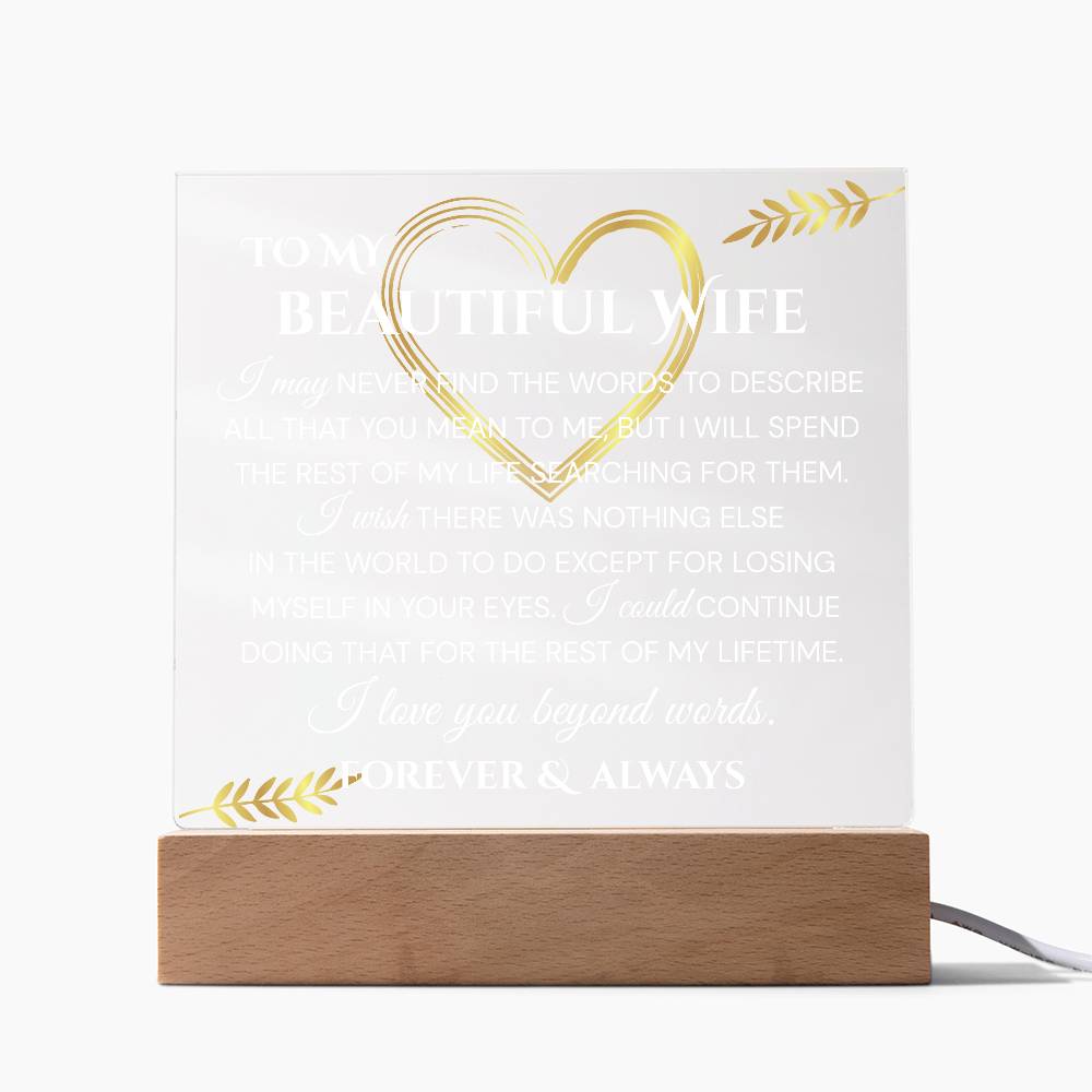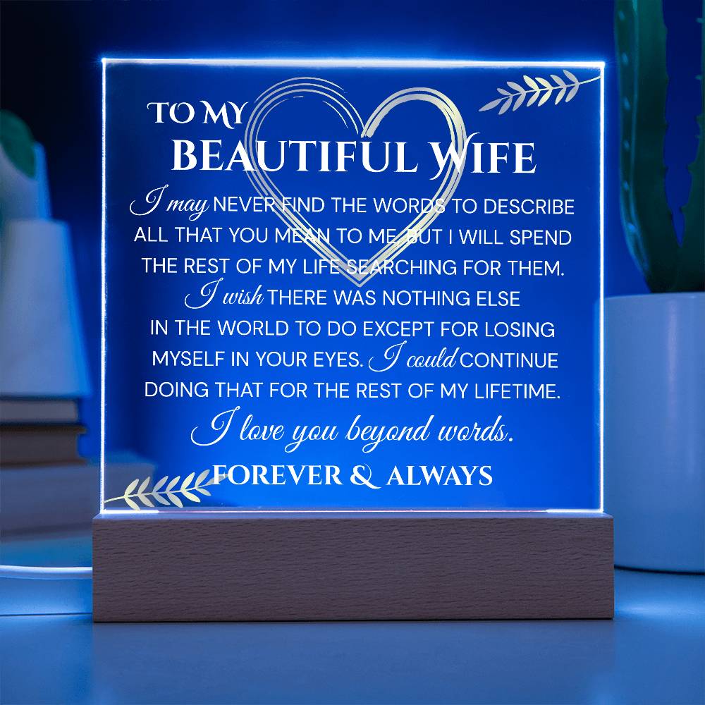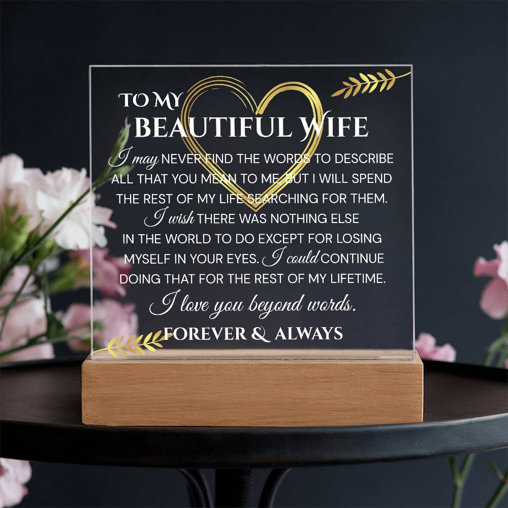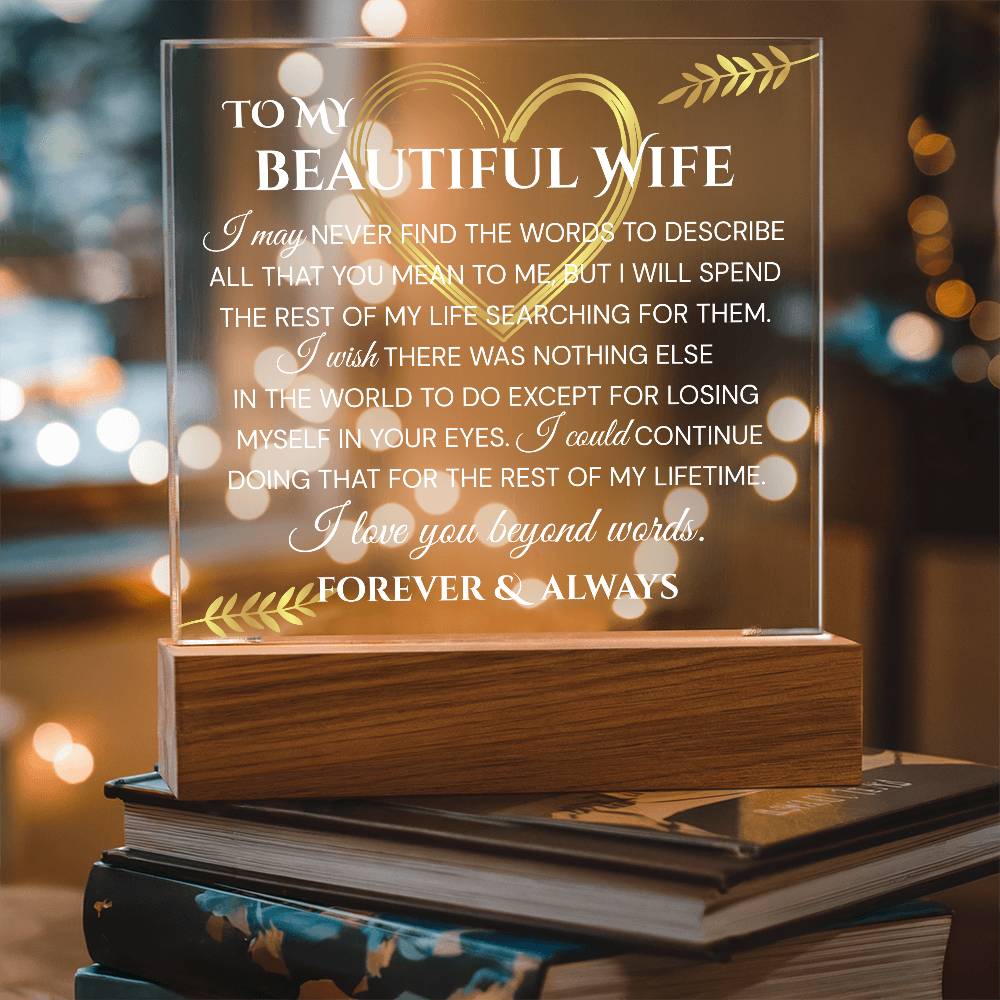 Your plaque will be crafted from premium acrylic with a professionally printed design for a polished look. It comes with a stylish wooden LED base, and you can choose between a USB plug-in option OR a cordless battery-operated option (requires 2 AAA batteries, not included). Both LED bases feature 7 vibrant colors, allowing the user to customize the lighting with various color changes and dynamic cycles.
