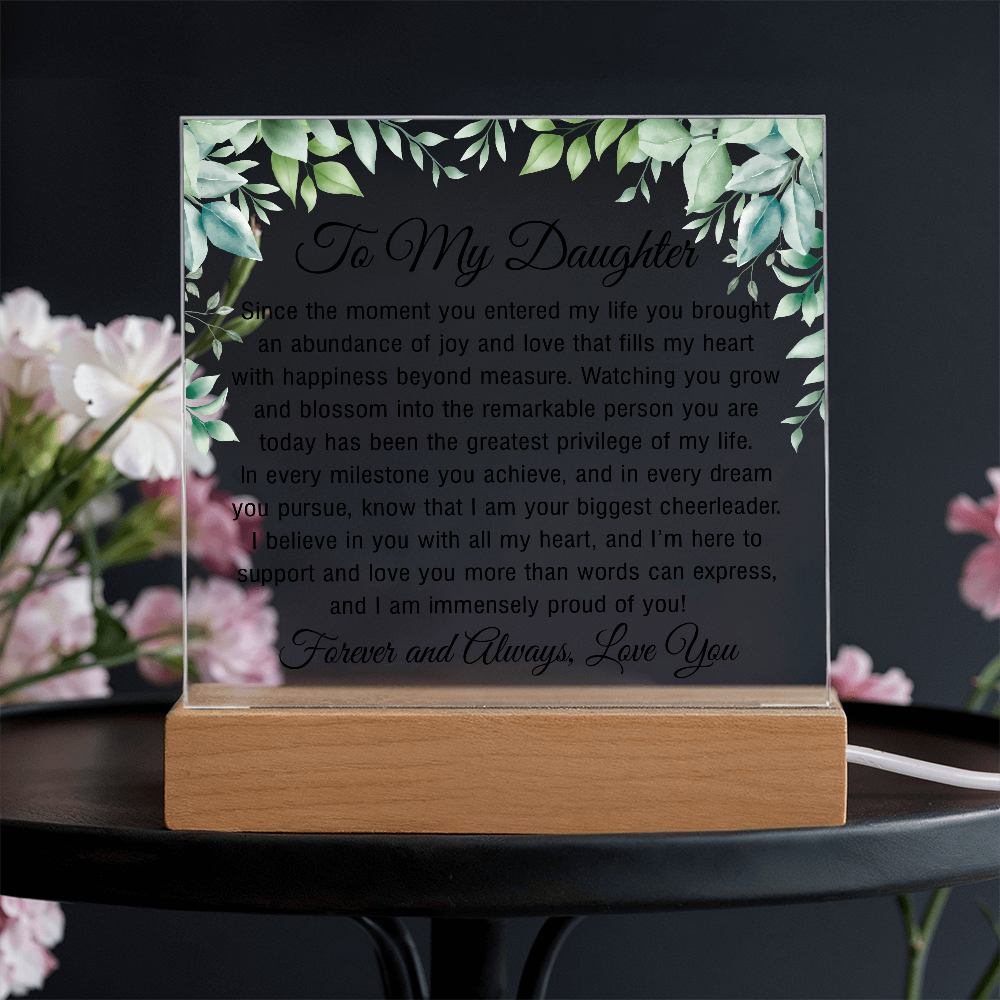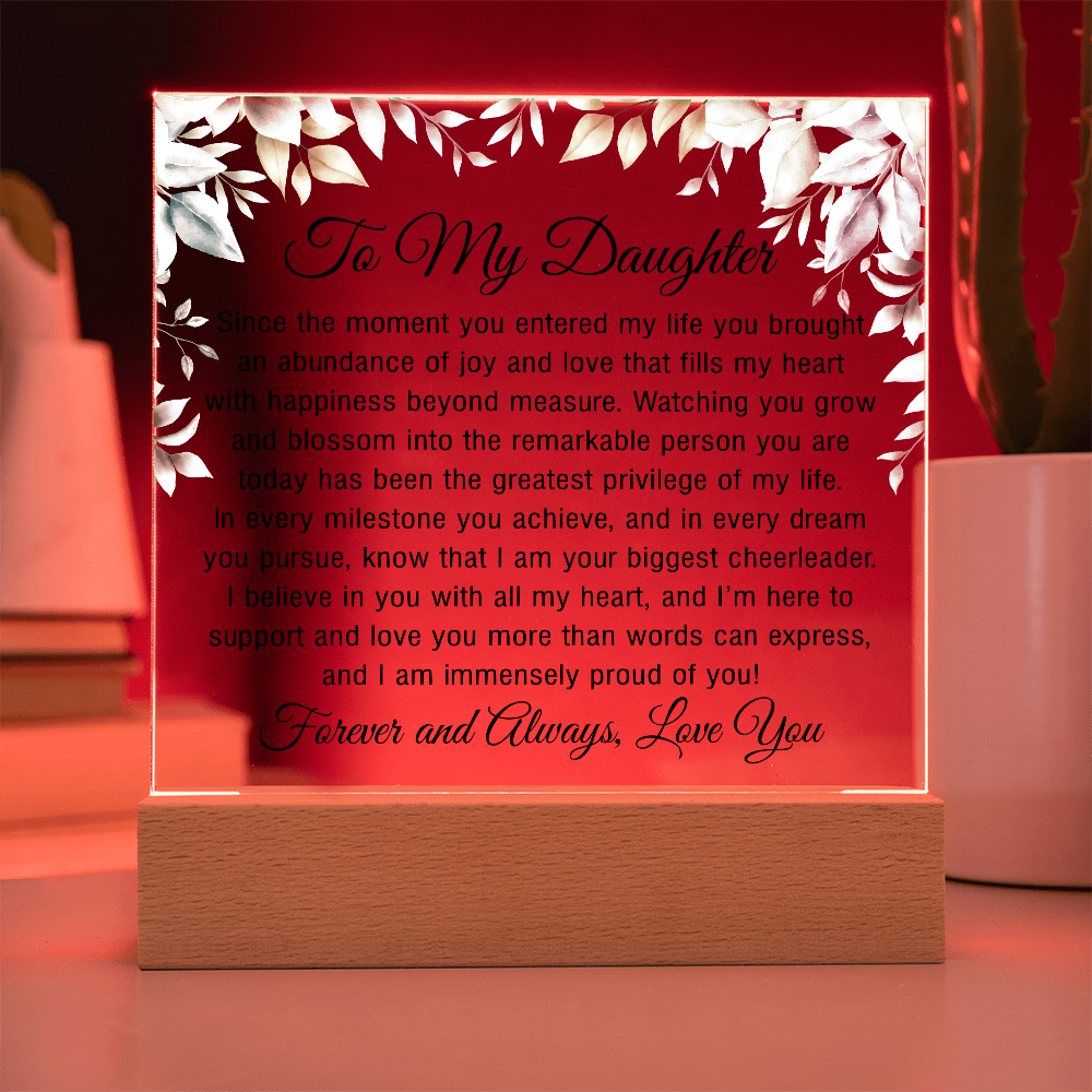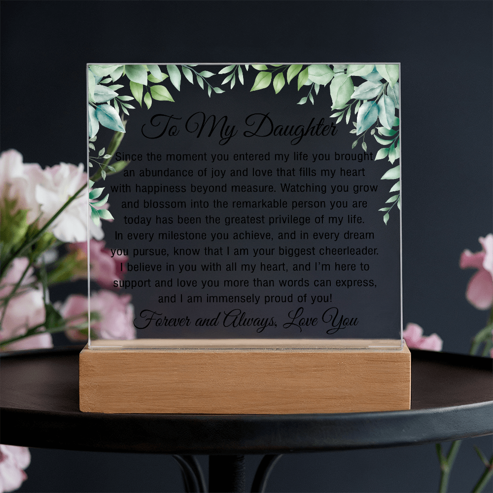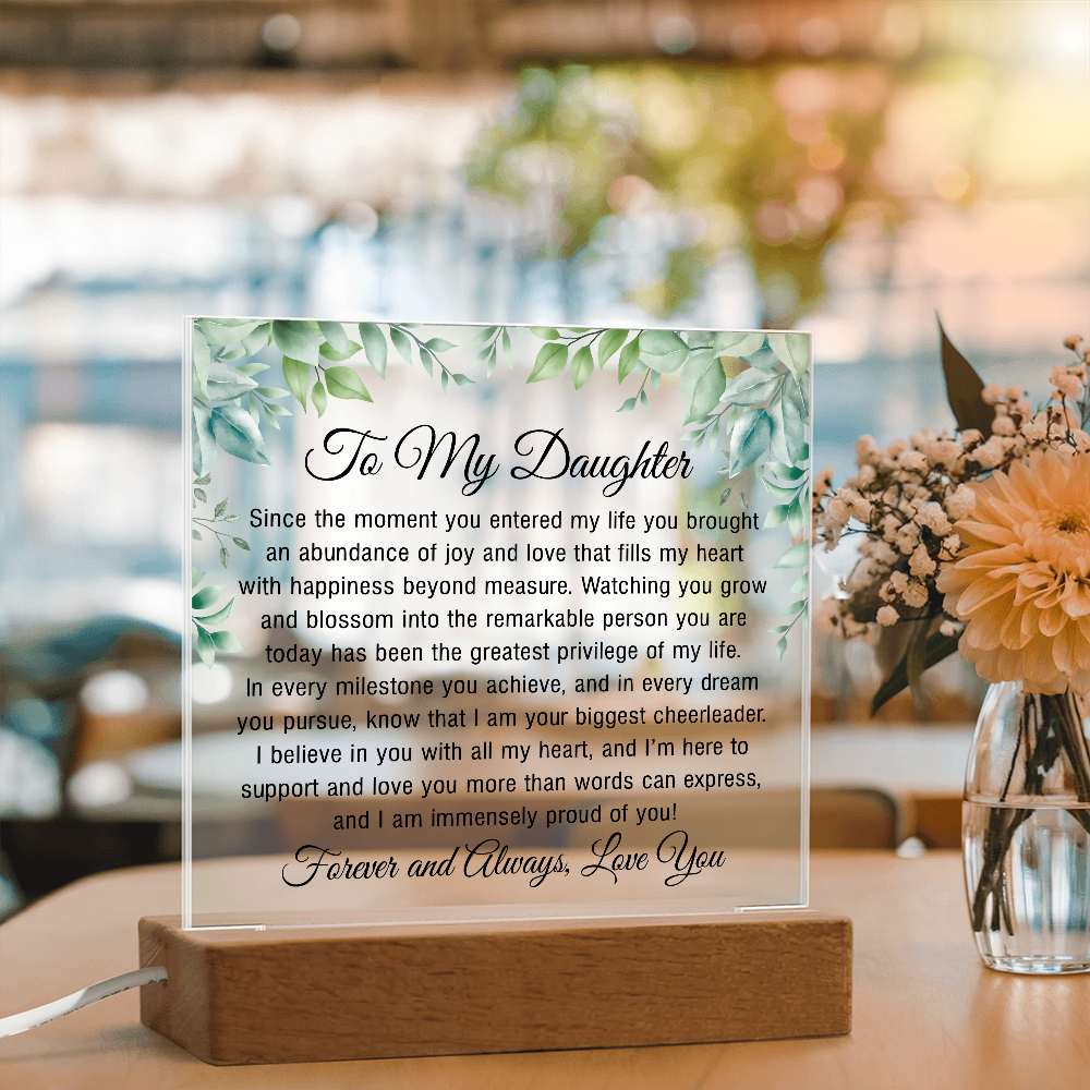 Your plaque will be crafted from premium acrylic with a professionally printed design for a polished look. It comes with a stylish wooden LED base, and you can choose between a USB plug-in option OR a cordless battery-operated option (requires 2 AAA batteries, not included). Both LED bases feature 7 vibrant colors, allowing the user to customize the lighting with various color changes and dynamic cycles.