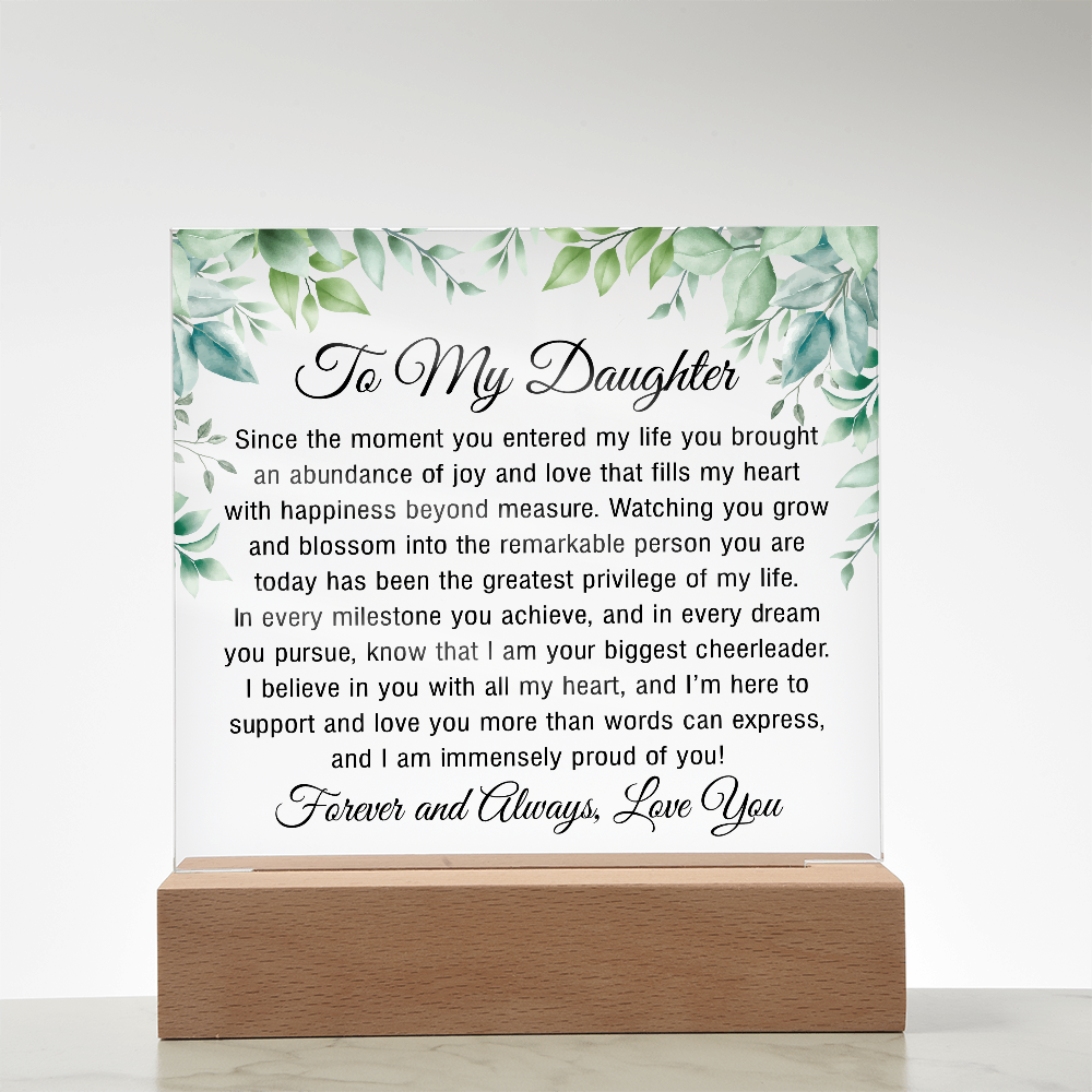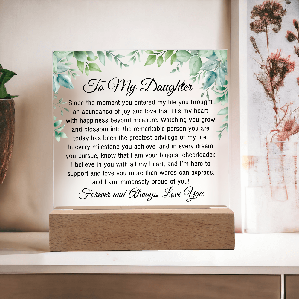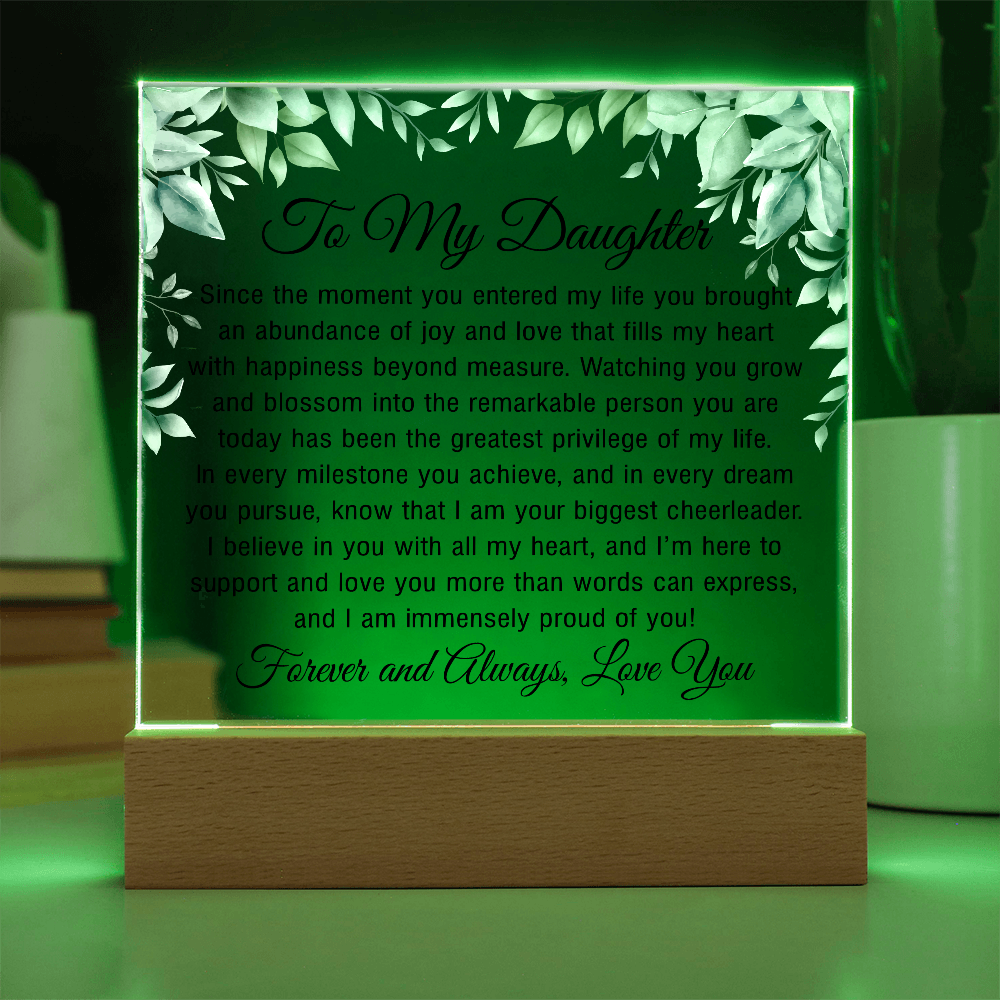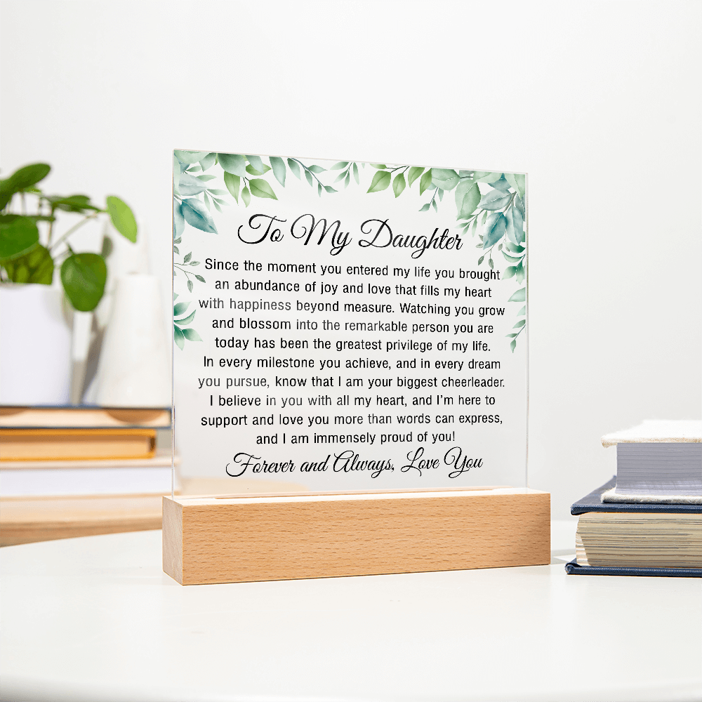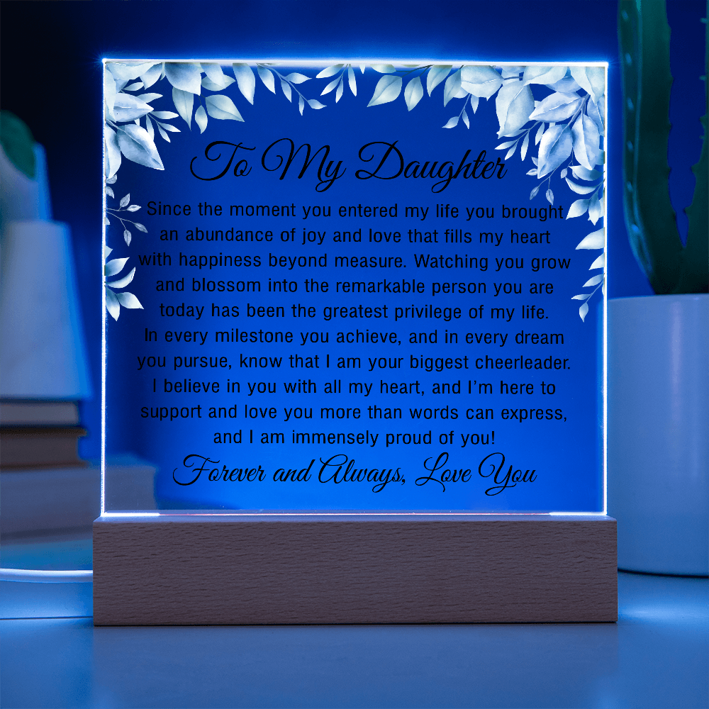 Your plaque will be crafted from premium acrylic with a professionally printed design for a polished look. It comes with a stylish wooden LED base, and you can choose between a USB plug-in option OR a cordless battery-operated option (requires 2 AAA batteries, not included). Both LED bases feature 7 vibrant colors, allowing the user to customize the lighting with various color changes and dynamic cycles.