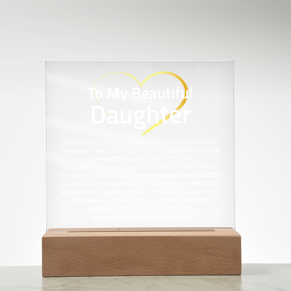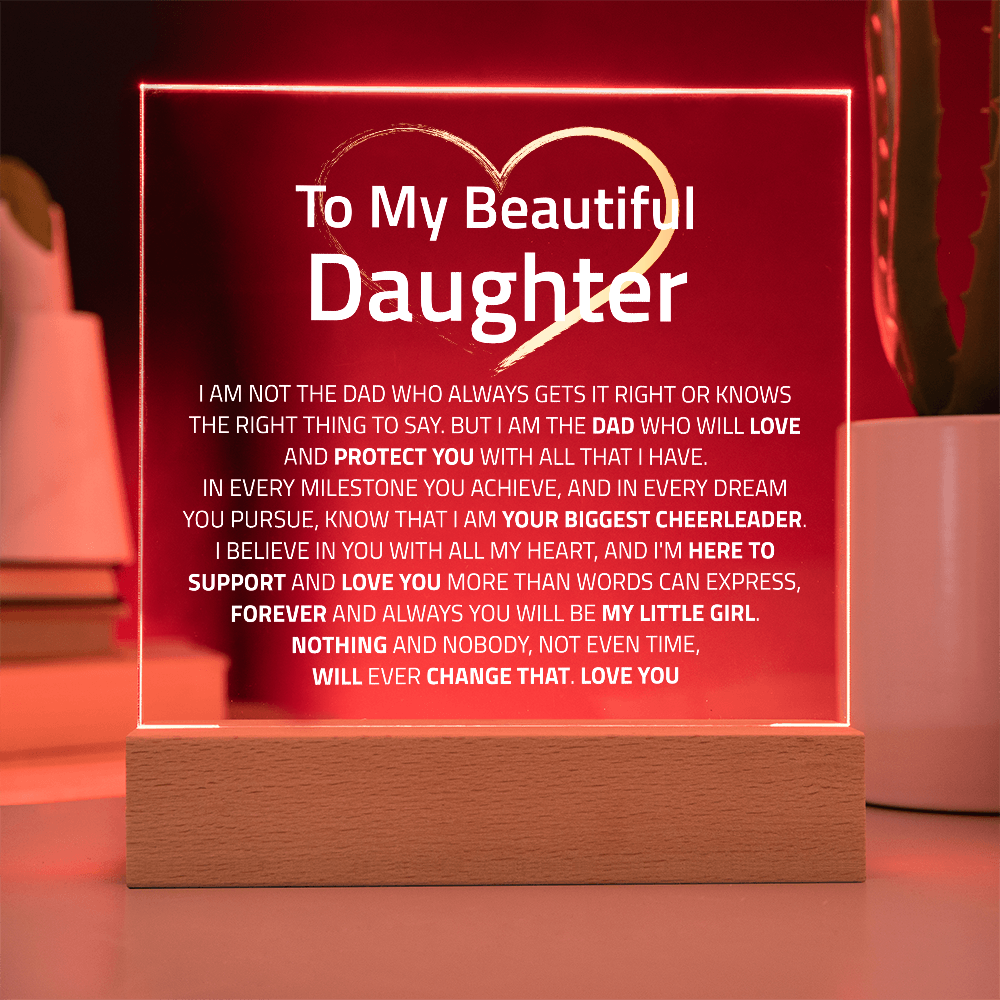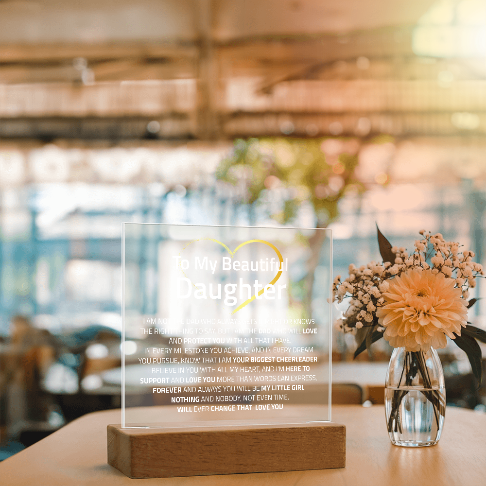 Your plaque will be crafted from premium acrylic with a professionally printed design for a polished look. It comes with a stylish wooden LED base, and you can choose between a USB plug-in option OR a cordless battery-operated option (requires 2 AAA batteries, not included). Both LED bases feature 7 vibrant colors, allowing the user to customize the lighting with various color changes and dynamic cycles.