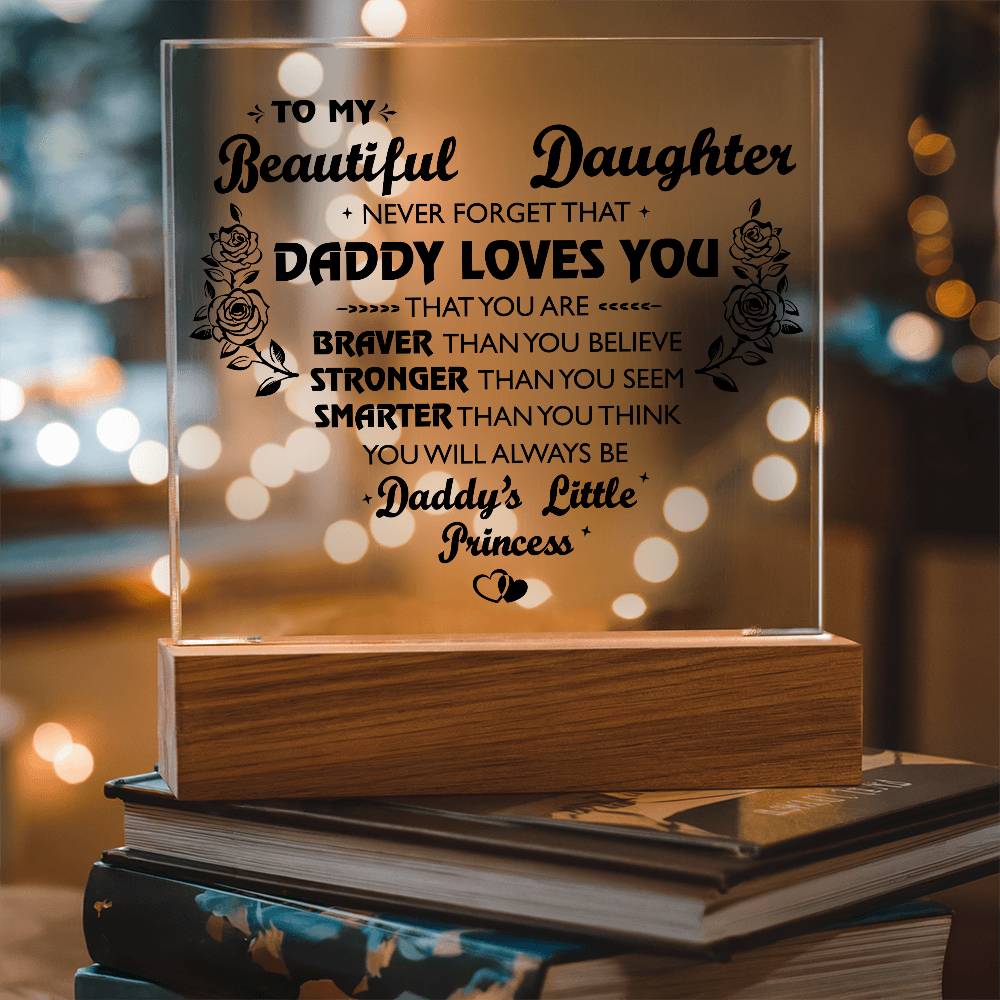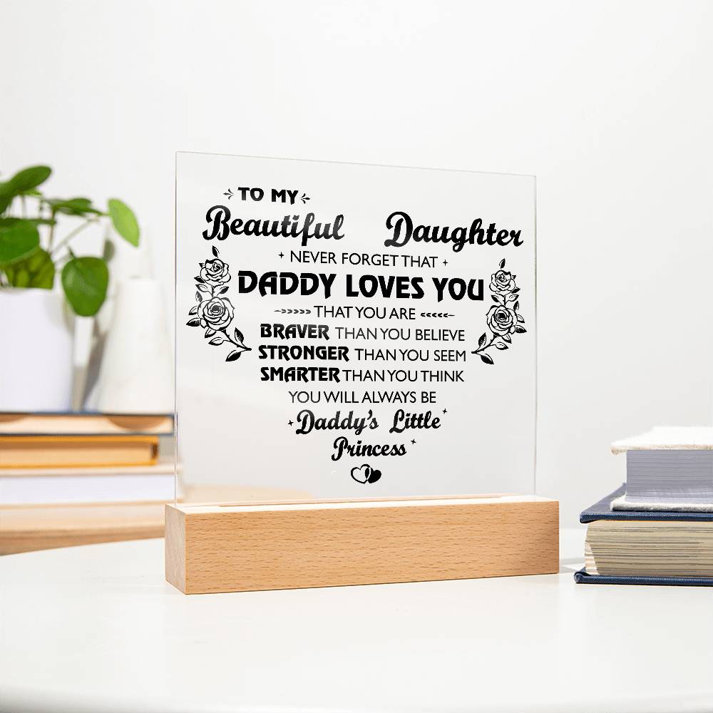 Your plaque will be crafted from premium acrylic with a professionally printed design for a polished look. It comes with a stylish wooden LED base, and you can choose between a USB plug-in option OR a cordless battery-operated option (requires 2 AAA batteries, not included). Both LED bases feature 7 vibrant colors, allowing the user to customize the lighting with various color changes and dynamic cycles.